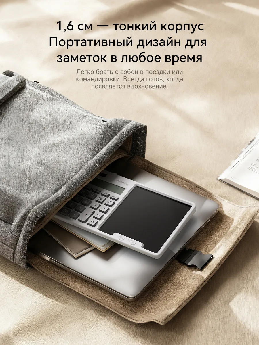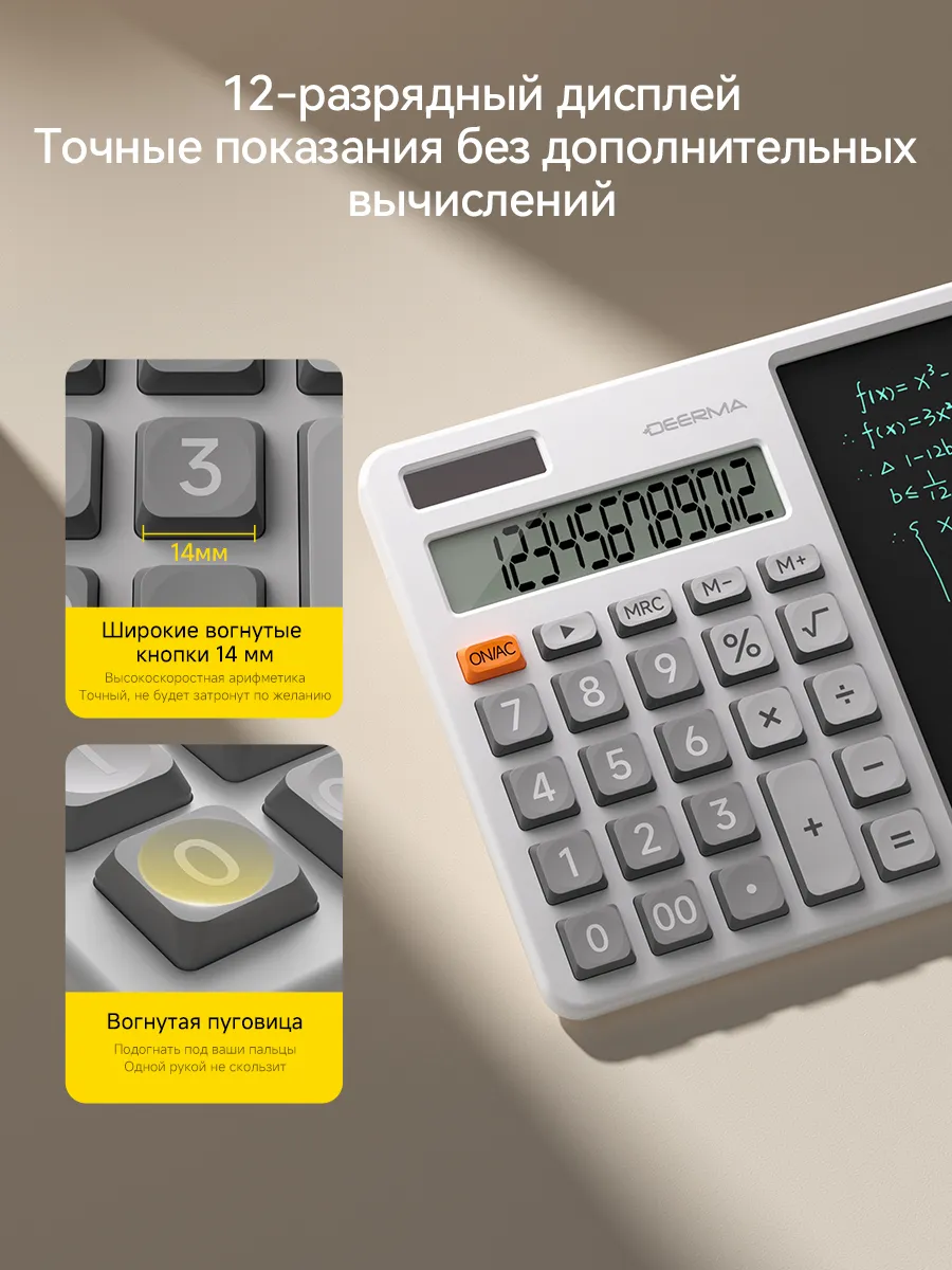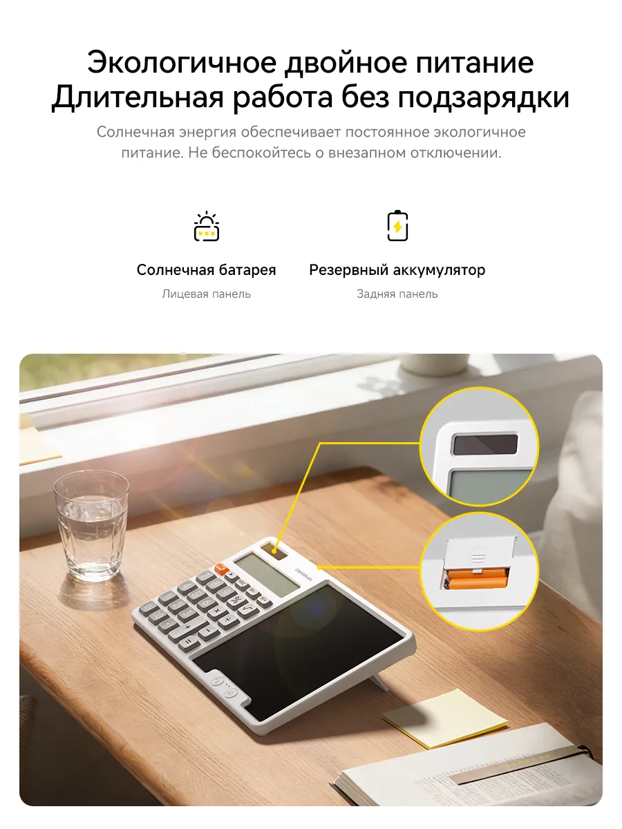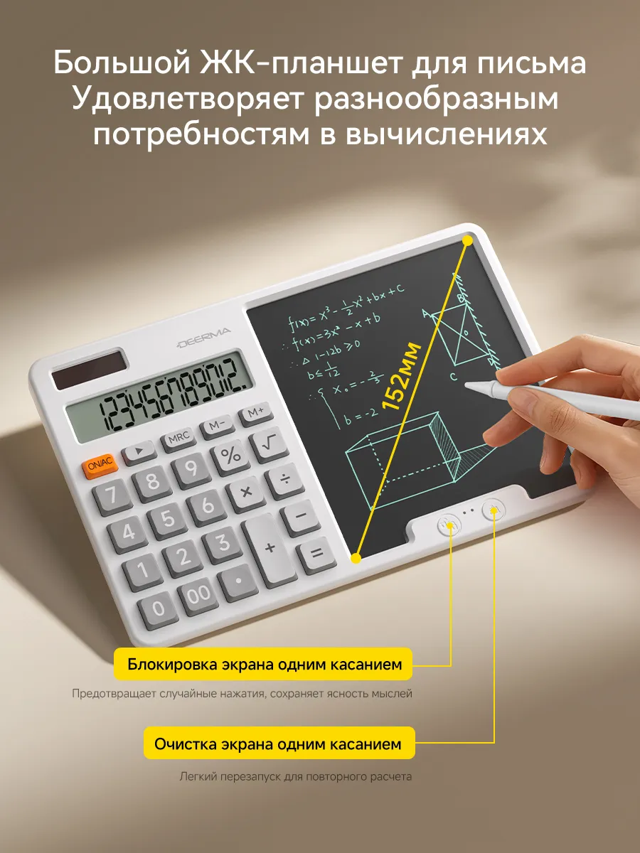 2 в 1: расчёты и записи для работы и учёбы.Это инновационное устройство объединяет в себе 12-разрядный калькулятор и большой ЖК-планшет для письма (152 мм), полностью решая проблему традиционных калькуляторов: «забыл результат и ищешь бумагу».Будь то точные подсчёты, удобное обучение или записи на совещаниях – он легко справится с любой задачей. Модель оснащена большим ЖК-экраном 152 мм с защитой от синего света, что делает использование комфортным для глаз. Продуманная конструкция с углом наклона 30° и устойчивыми ножками обеспечивает удобный обзор и надёжную фиксацию на столе. Благодаря двойному питанию (солнечная панель + батарейки) устройство работает длительное время без необходимости подзарядки. Это идеальный помощник для современного офиса и эффективной учёбы.