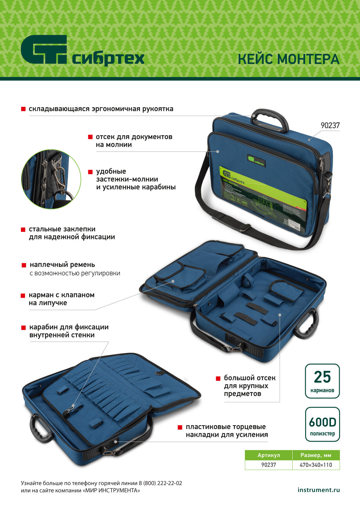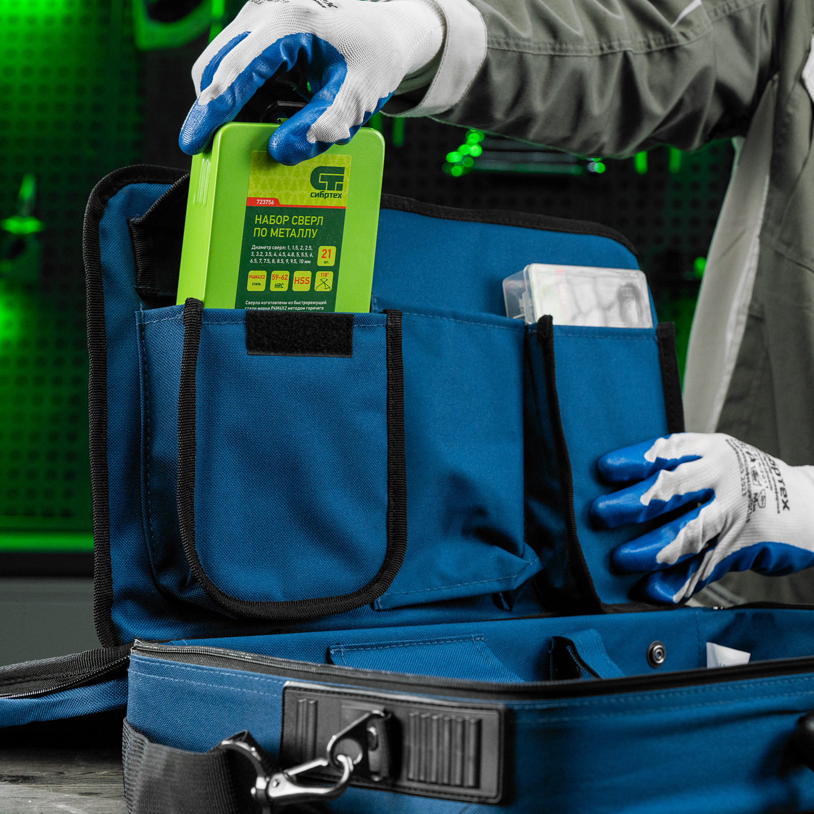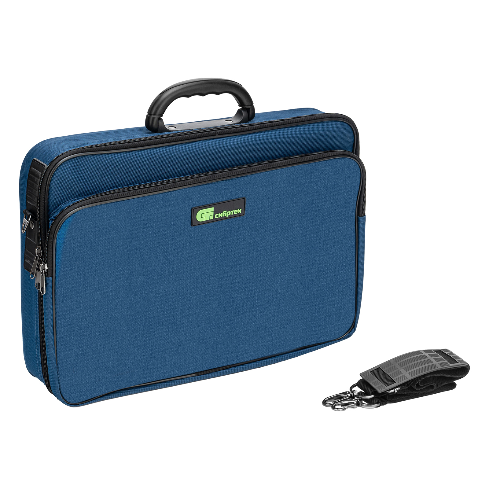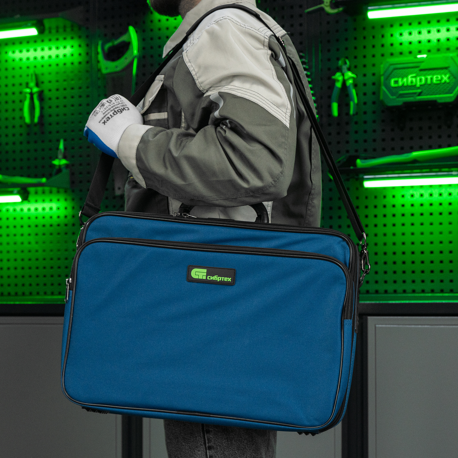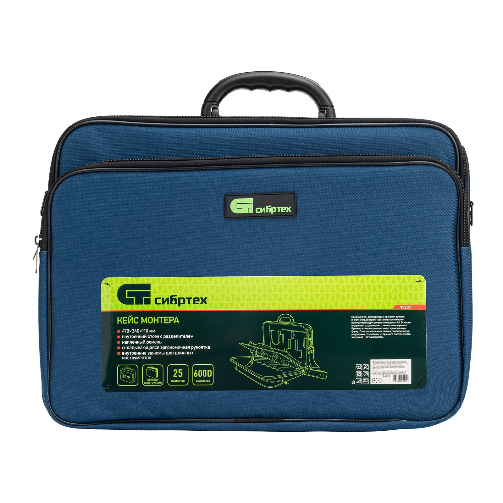 Кейс монтера Сибртех 90237 размером 470 х 340 х 110 мм, с наплечным ремнем, имеет 25 карманов для размещения ручных инструментов и необходимых деталей. Жесткая конструкция обеспечивает сохранность содержимого во время транспортировки и хранения. Такая сумка для инструментов будет полезна мастерам по ремонту техники, монтажникам, слесарям и электрикам.
