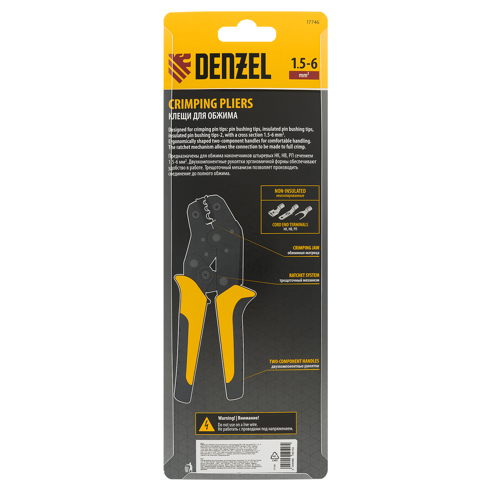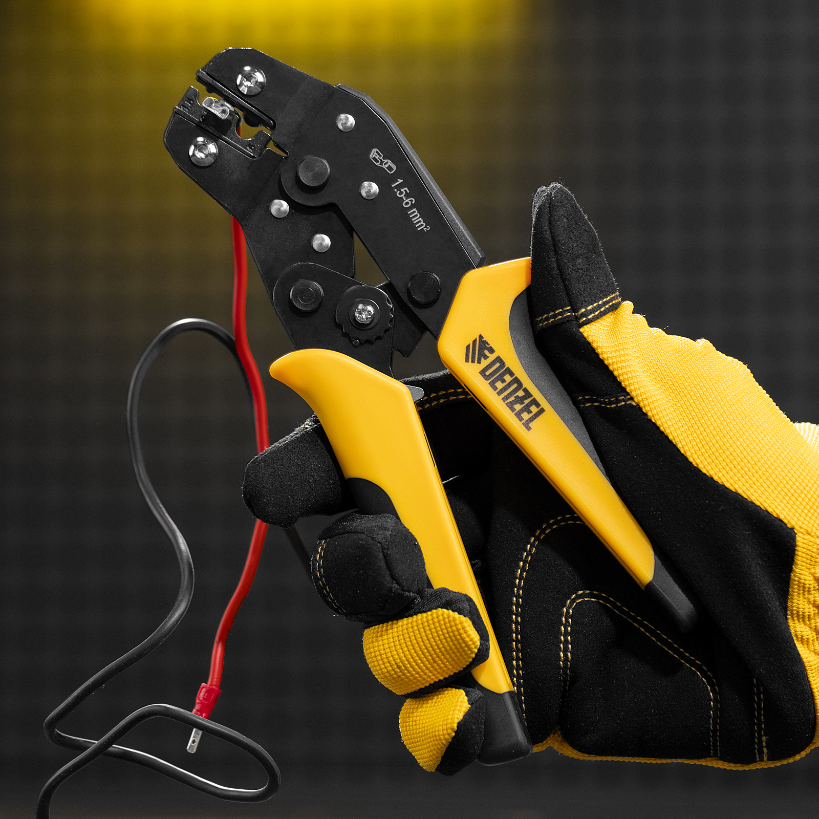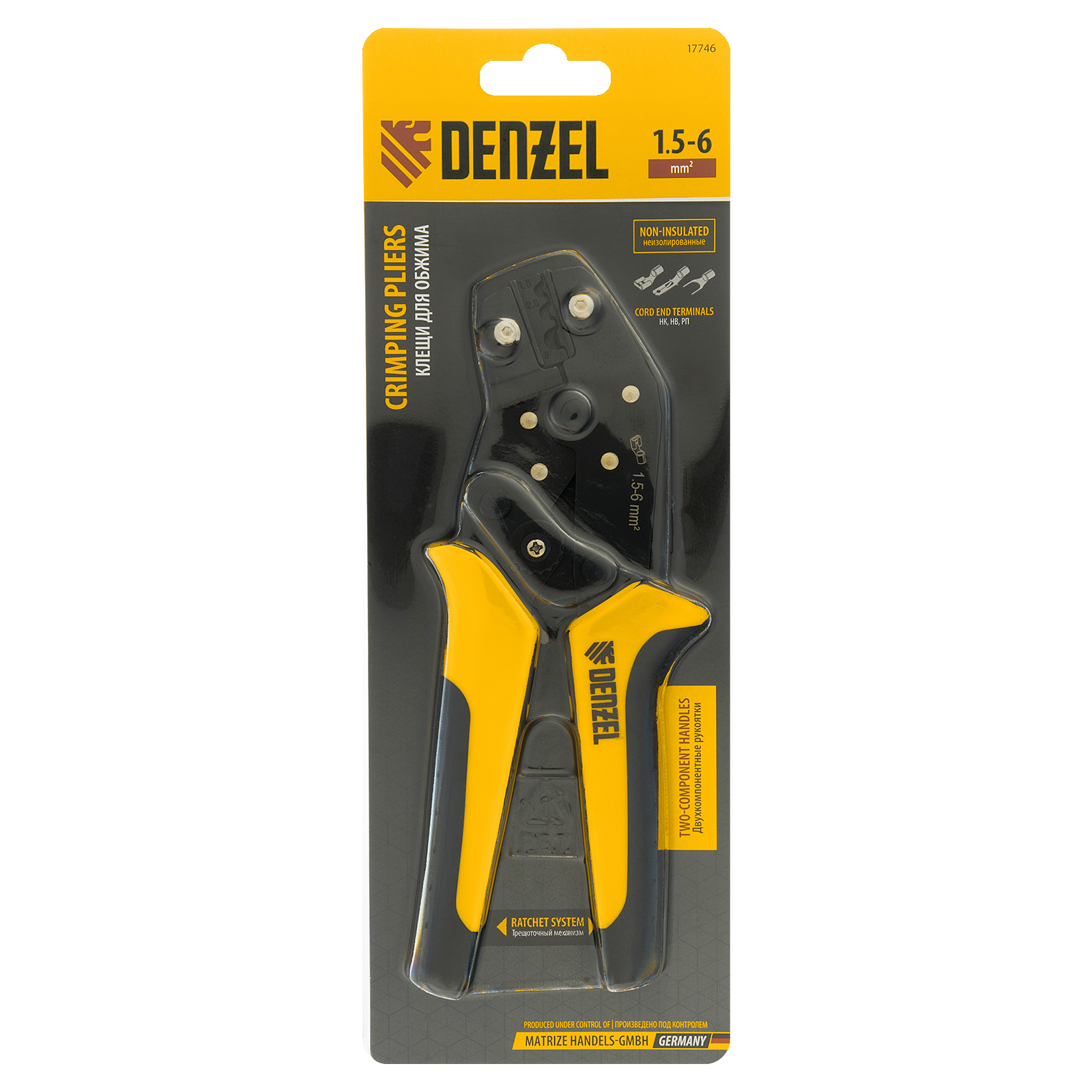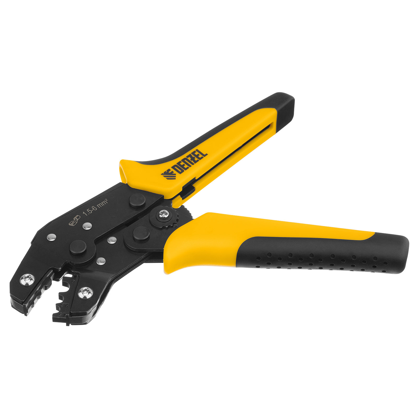 Клещи Denzel 17746 предназначены для обжима неизолированных кольцевых наконечников НК и вилочных НВ, разъемов плоских РП сечением 1,5-6 мм². Инструмент пригодится частным и профессиональным мастерам при проведении электромонтажных работ.