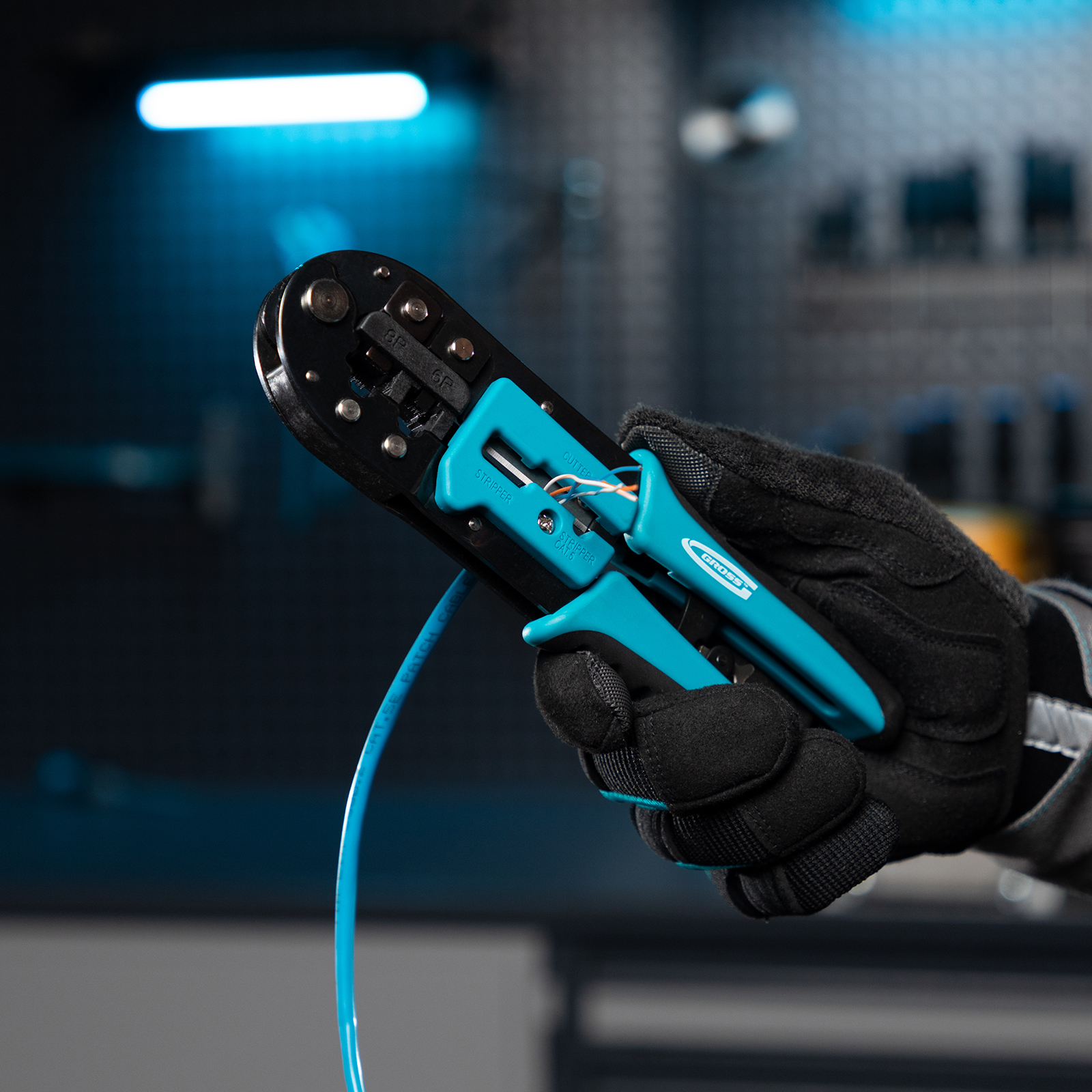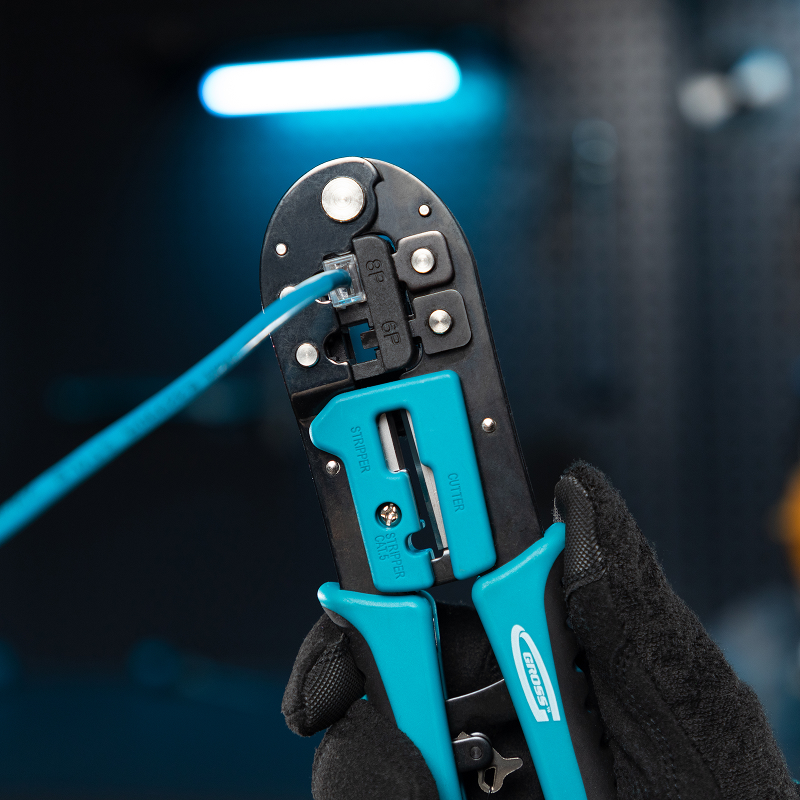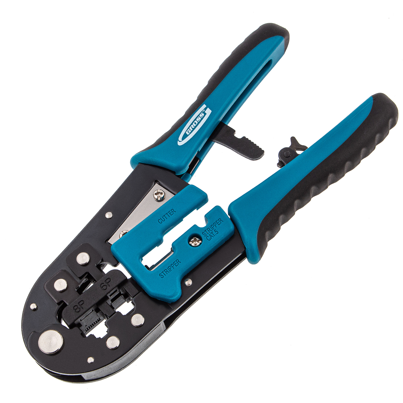 Клещи Gross 17719 предназначены для обжима телефонных и компьютерных клемм наиболее популярных типоразмеров RJ45, 8P и RJ11/12, 6P. Пригодятся частным мастерам и профессионалам для подключения компьютеров и телефонов к сети.