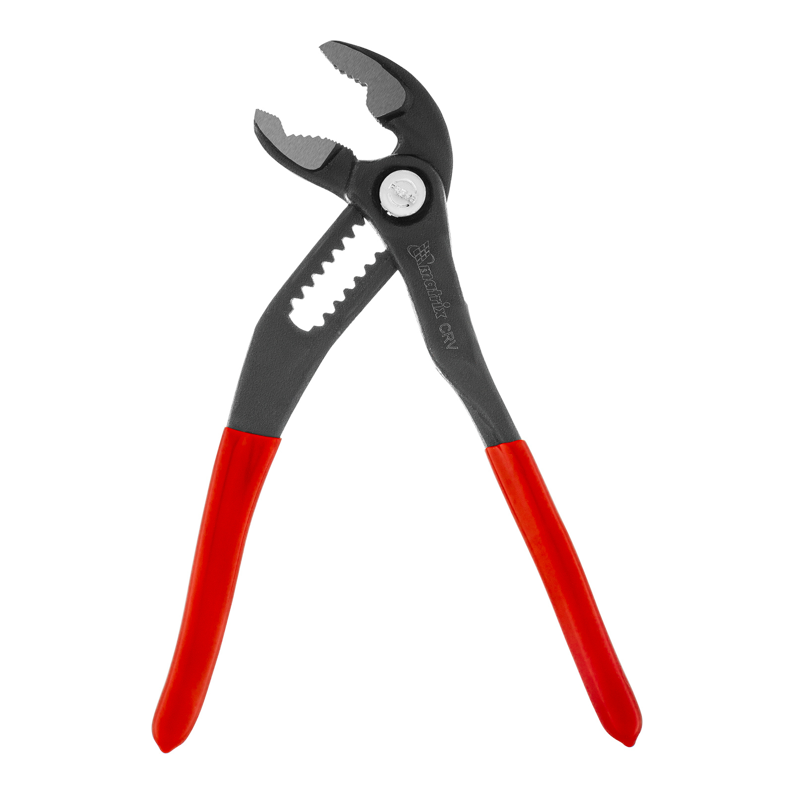 Переставные клещи Matrix 17925 длиной 180 мм, выполненные из хромованадиевой стали, с кнопочным механизмом и обливными рукоятками, используются для проведения монтажных и слесарных работ. Универсальный инструмент заменяет ключи различных размеров и применяется для фиксации заготовок, откручивания гаек, зажима и удержания труб диаметром до 50 мм.