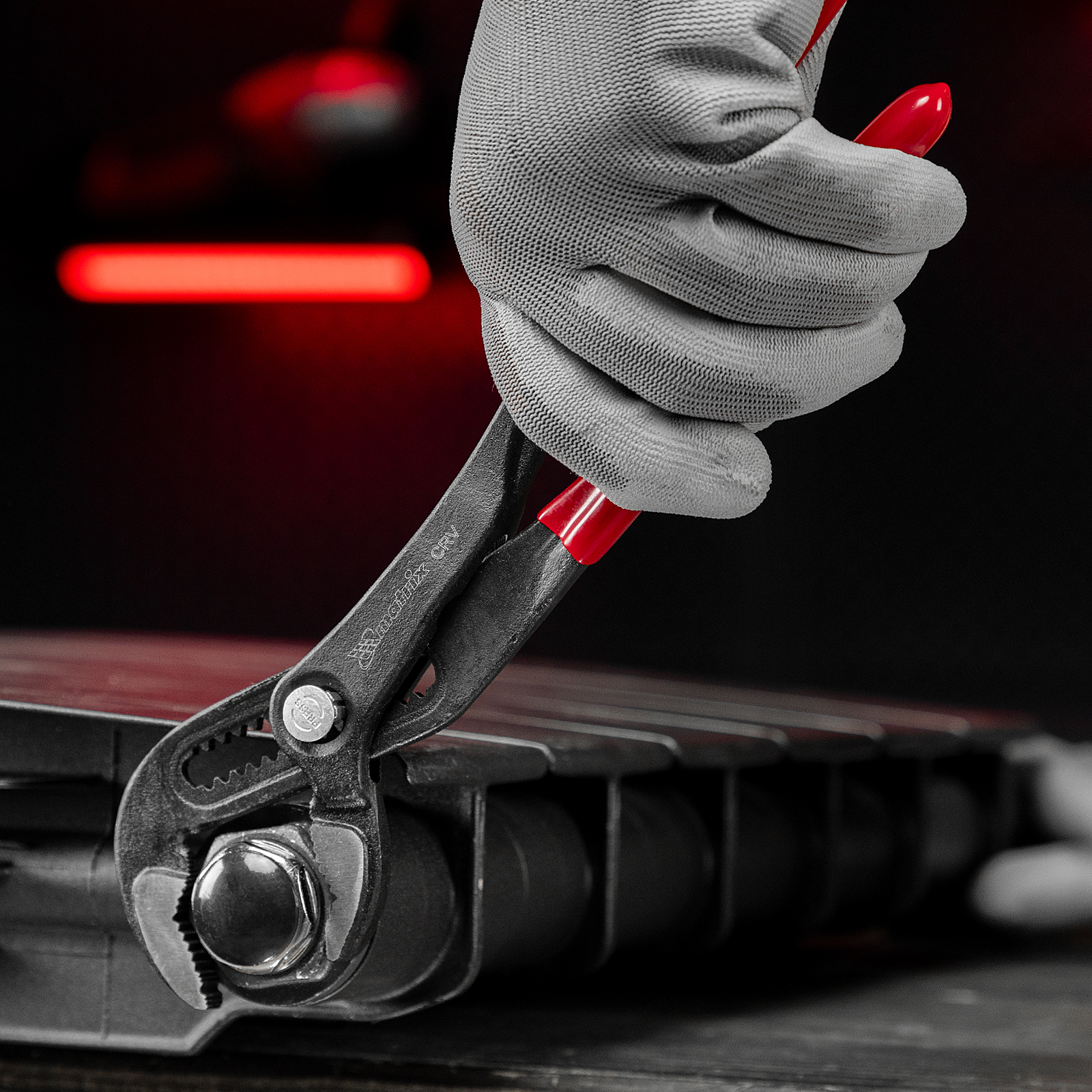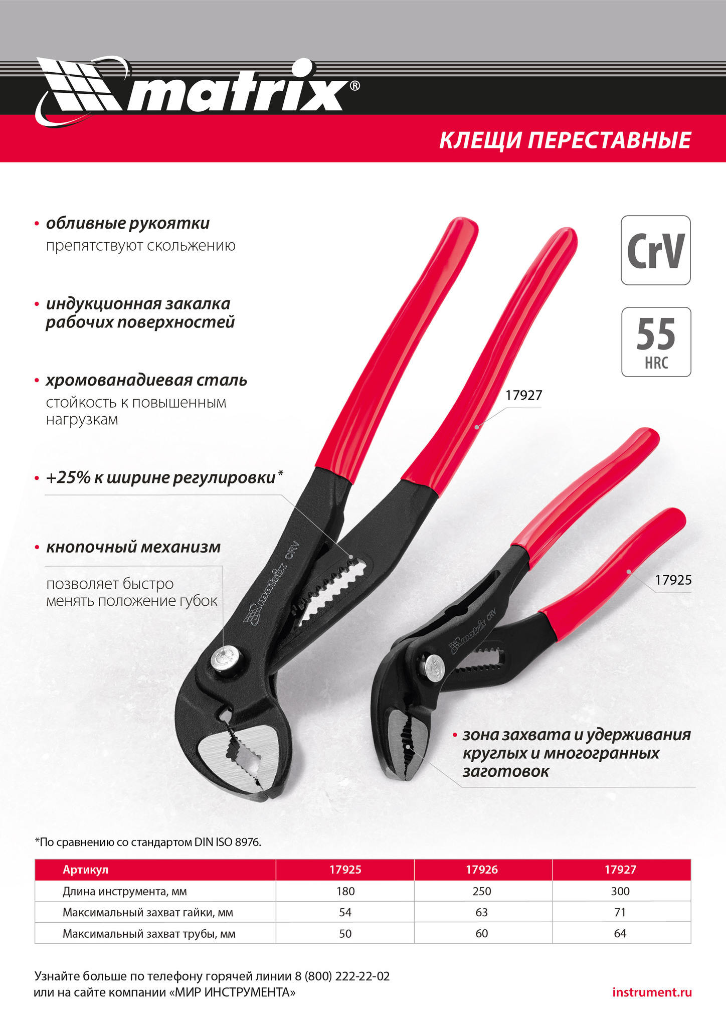 Переставные клещи Matrix 17926 длиной 250 мм, выполненные из хромованадиевой стали, с кнопочным механизмом и обливными рукоятками, используются для проведения монтажных и слесарных работ. Универсальный инструмент заменяет ключи различных размеров и применяется для фиксации заготовок, откручивания гаек, зажима и удержания труб диаметром до 60 мм.