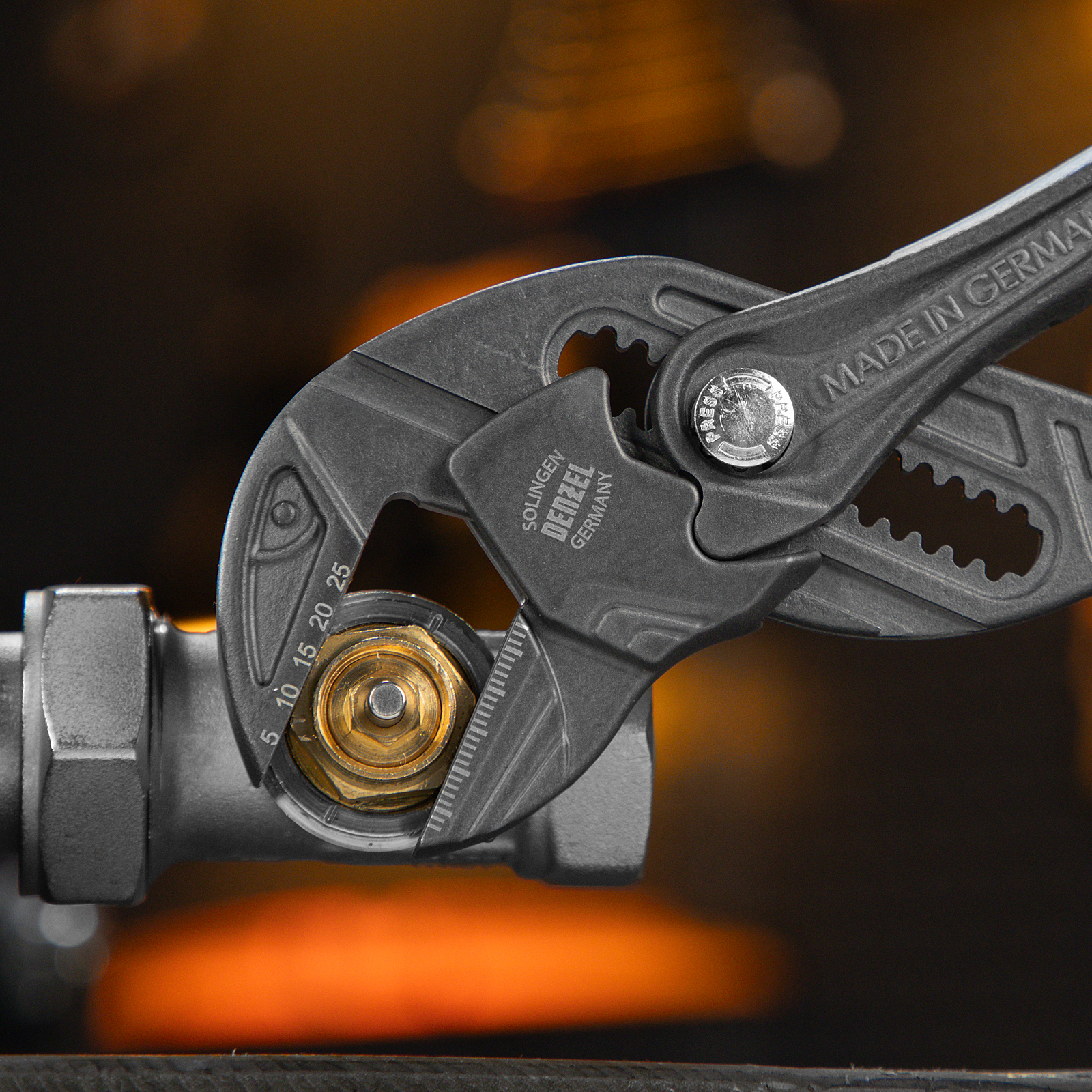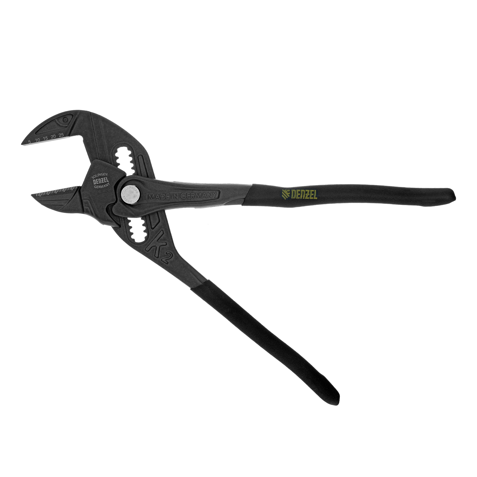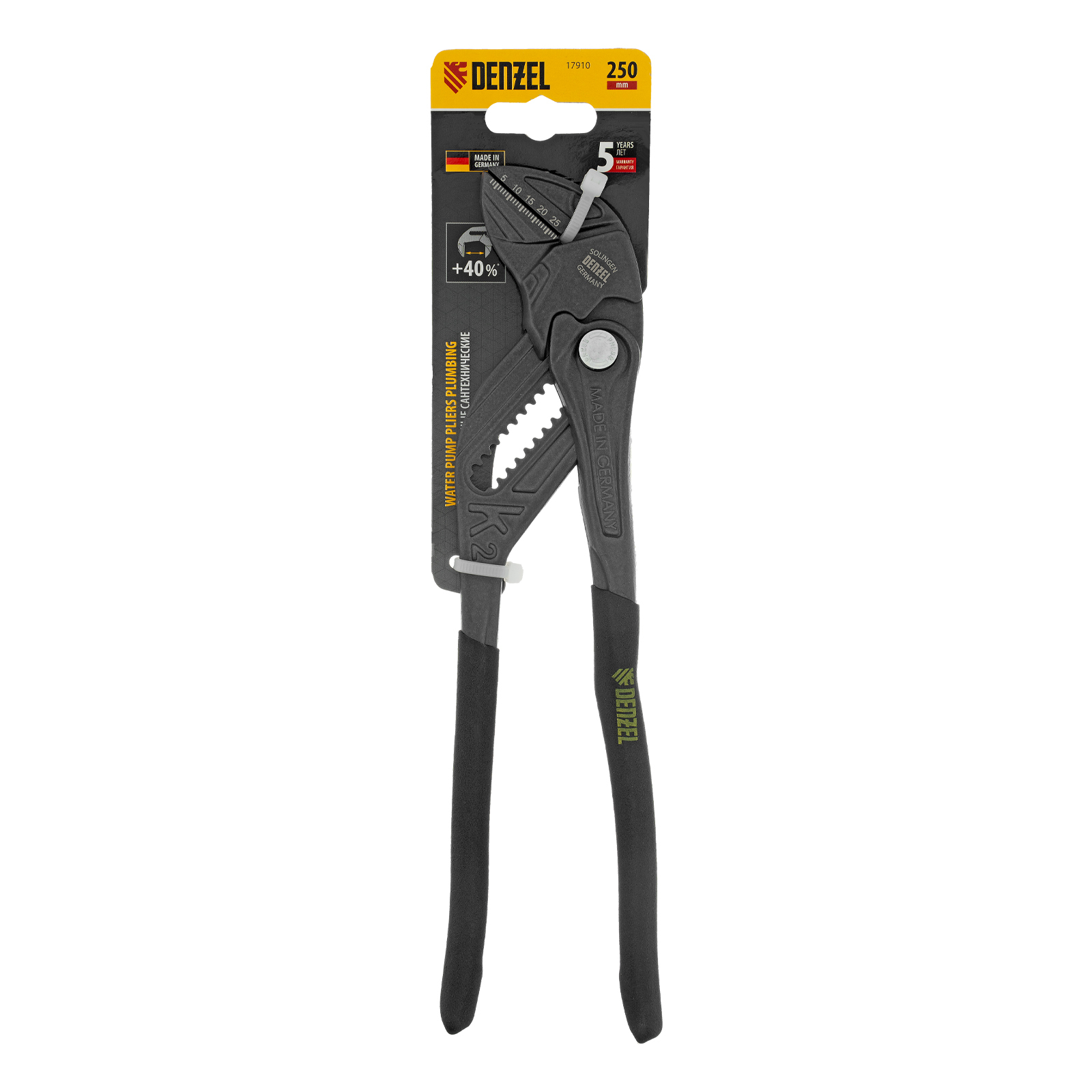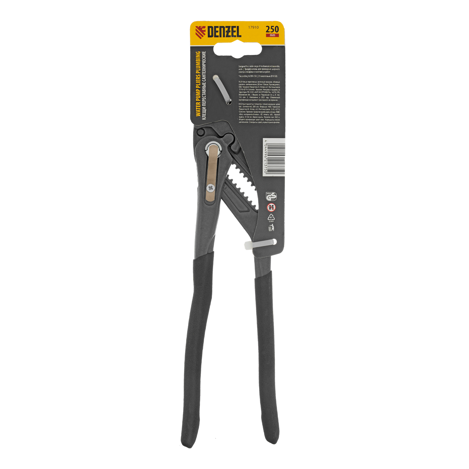 Сантехнические переставные клещи Denzel 17910 длиной 250 мм, с обливными рукоятками и кнопочным механизмом, предназначены для захвата и вращения гаек и фитингов. Максимальная ширина раскрытия губок составляет 50 мм. Губки всегда параллельны, что позволяет равномерно распределять усилие сжатия и избежать повреждения фиксируемого предмета.