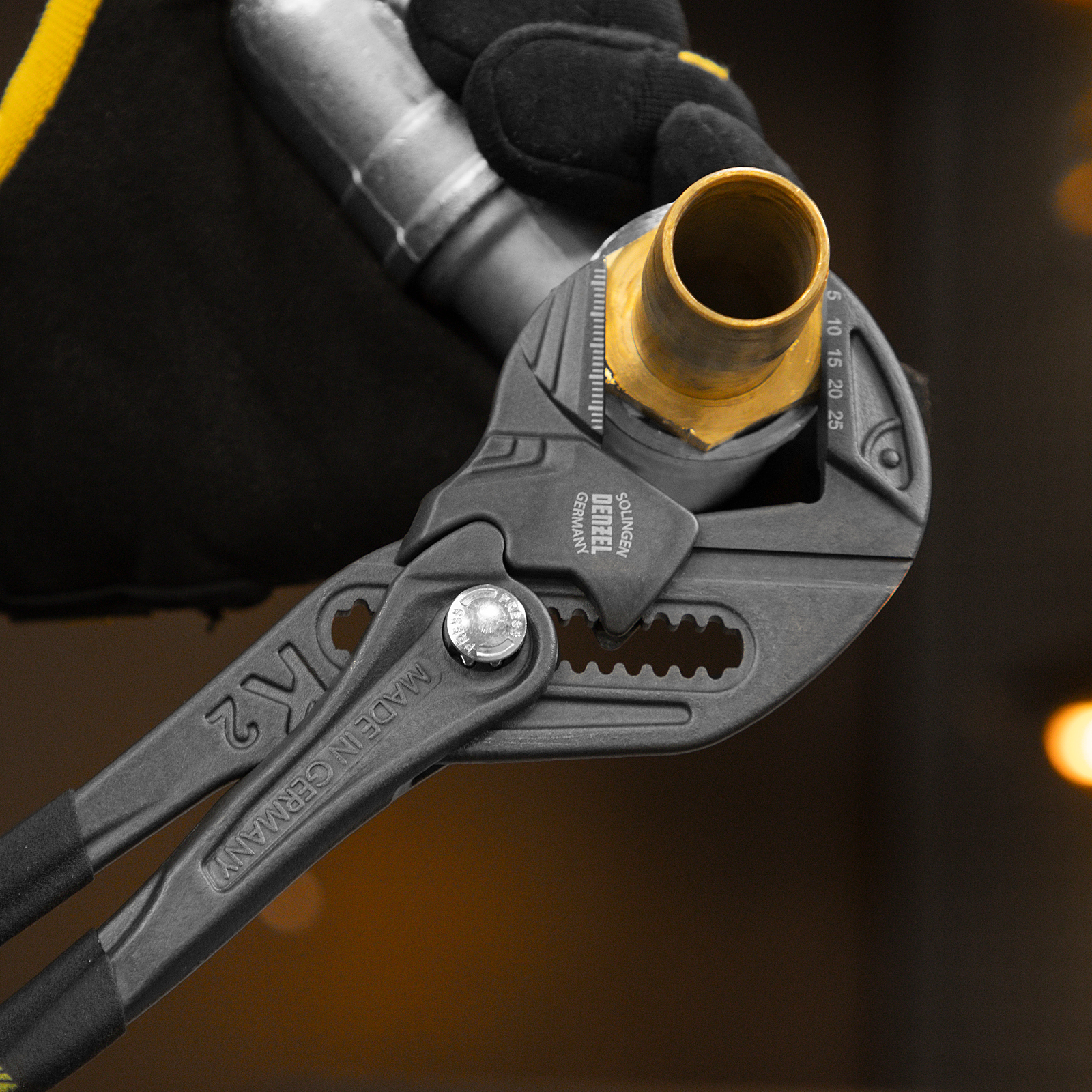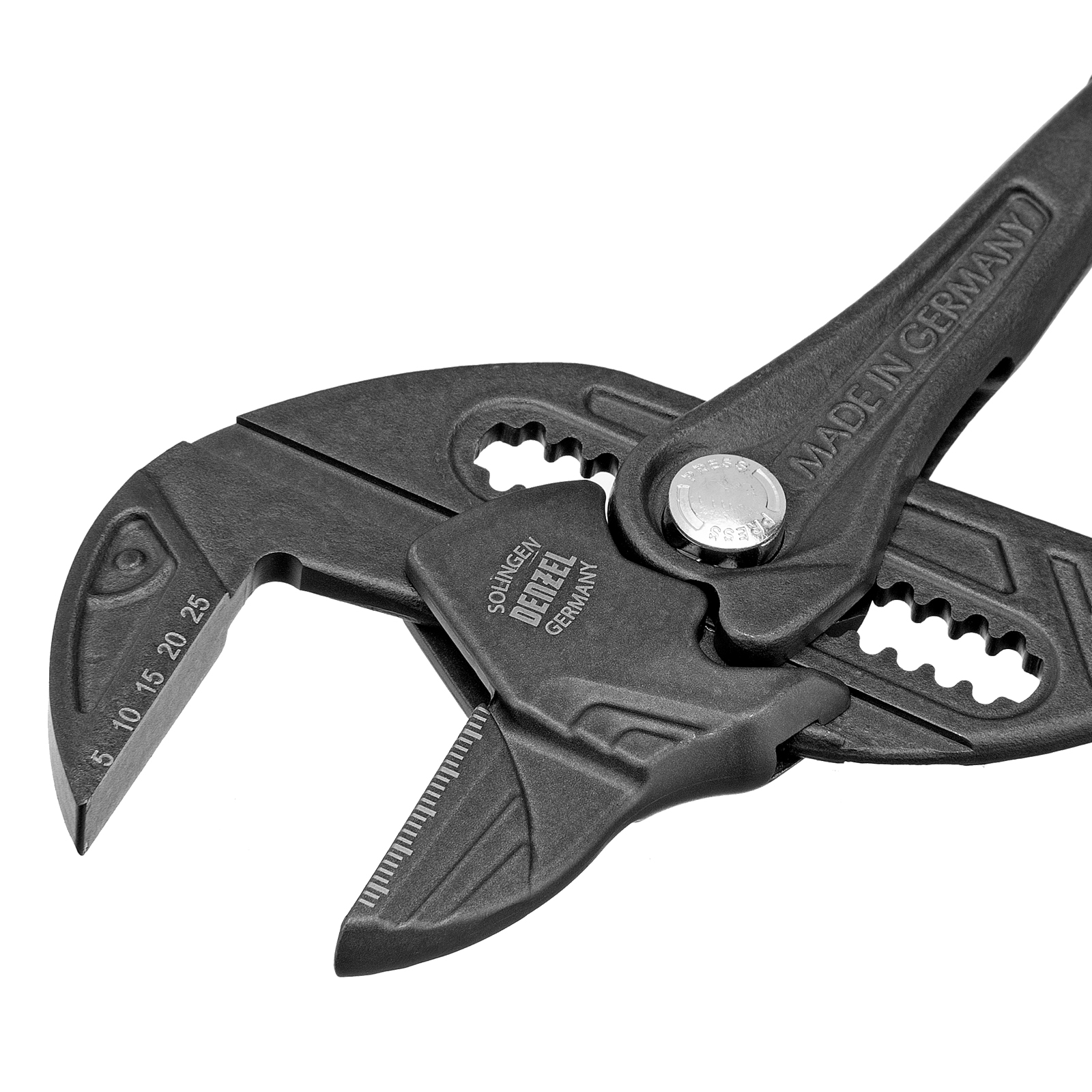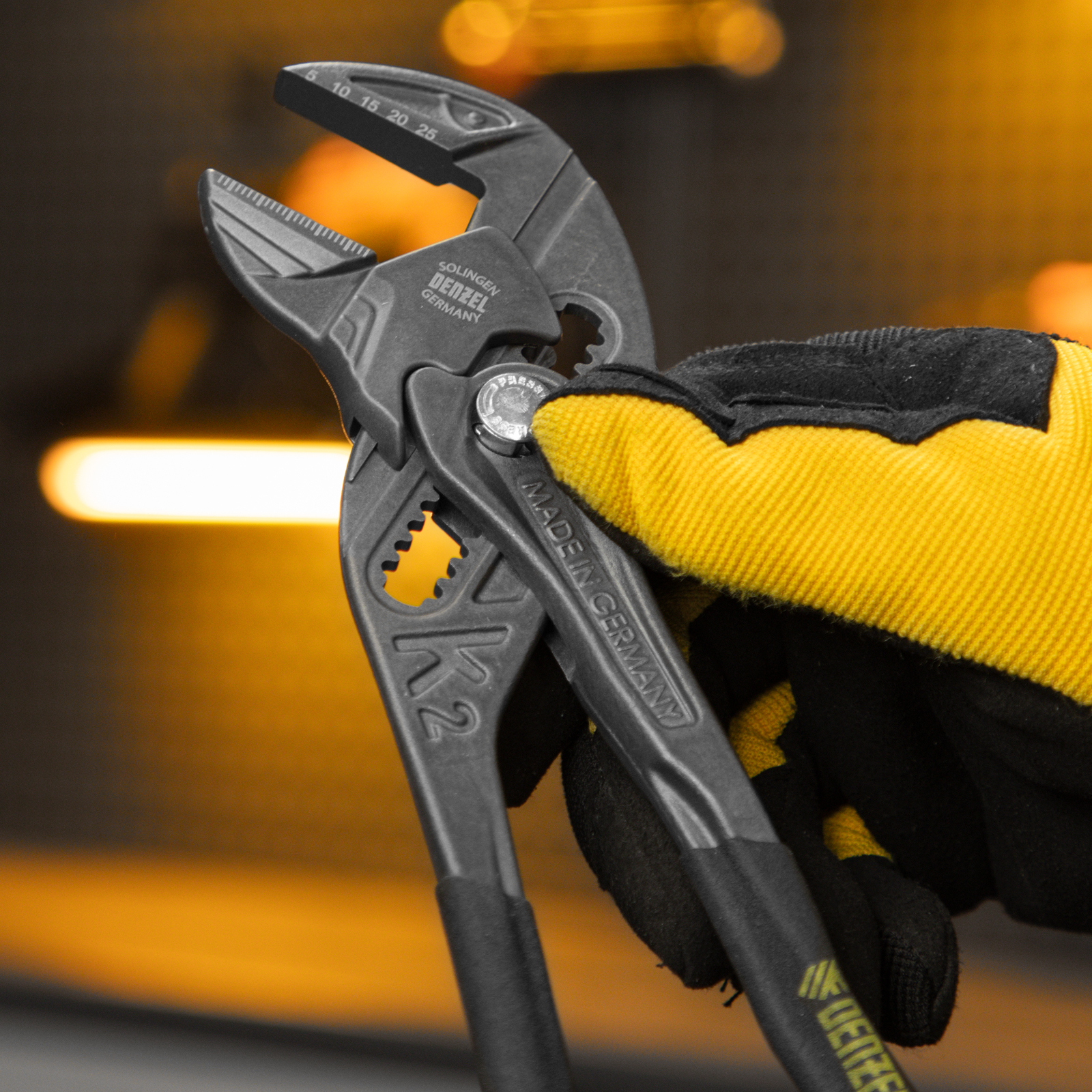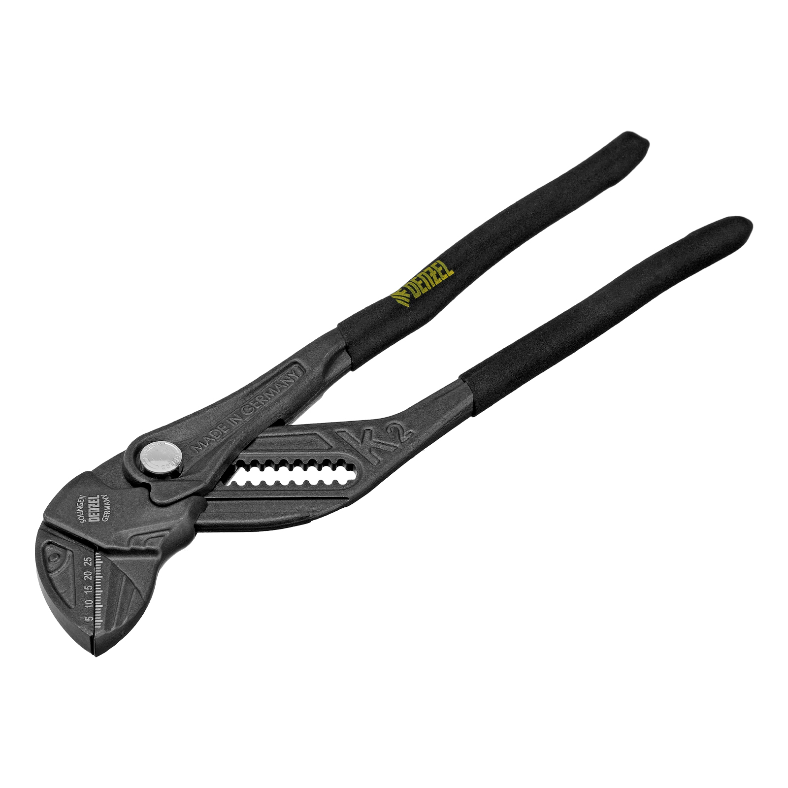 Сантехнические переставные клещи Denzel 17910 длиной 250 мм, с обливными рукоятками и кнопочным механизмом, предназначены для захвата и вращения гаек и фитингов. Максимальная ширина раскрытия губок составляет 50 мм. Губки всегда параллельны, что позволяет равномерно распределять усилие сжатия и избежать повреждения фиксируемого предмета.