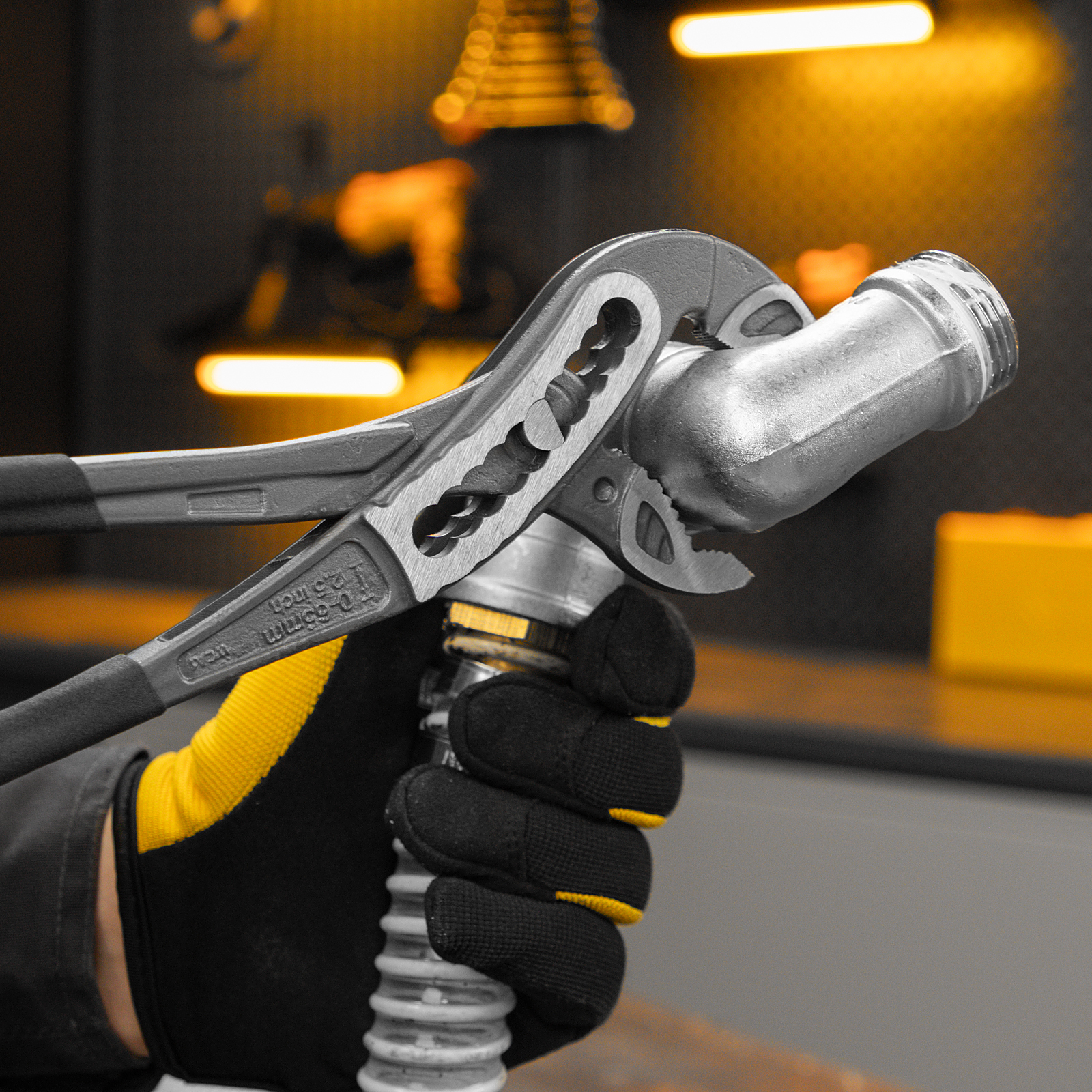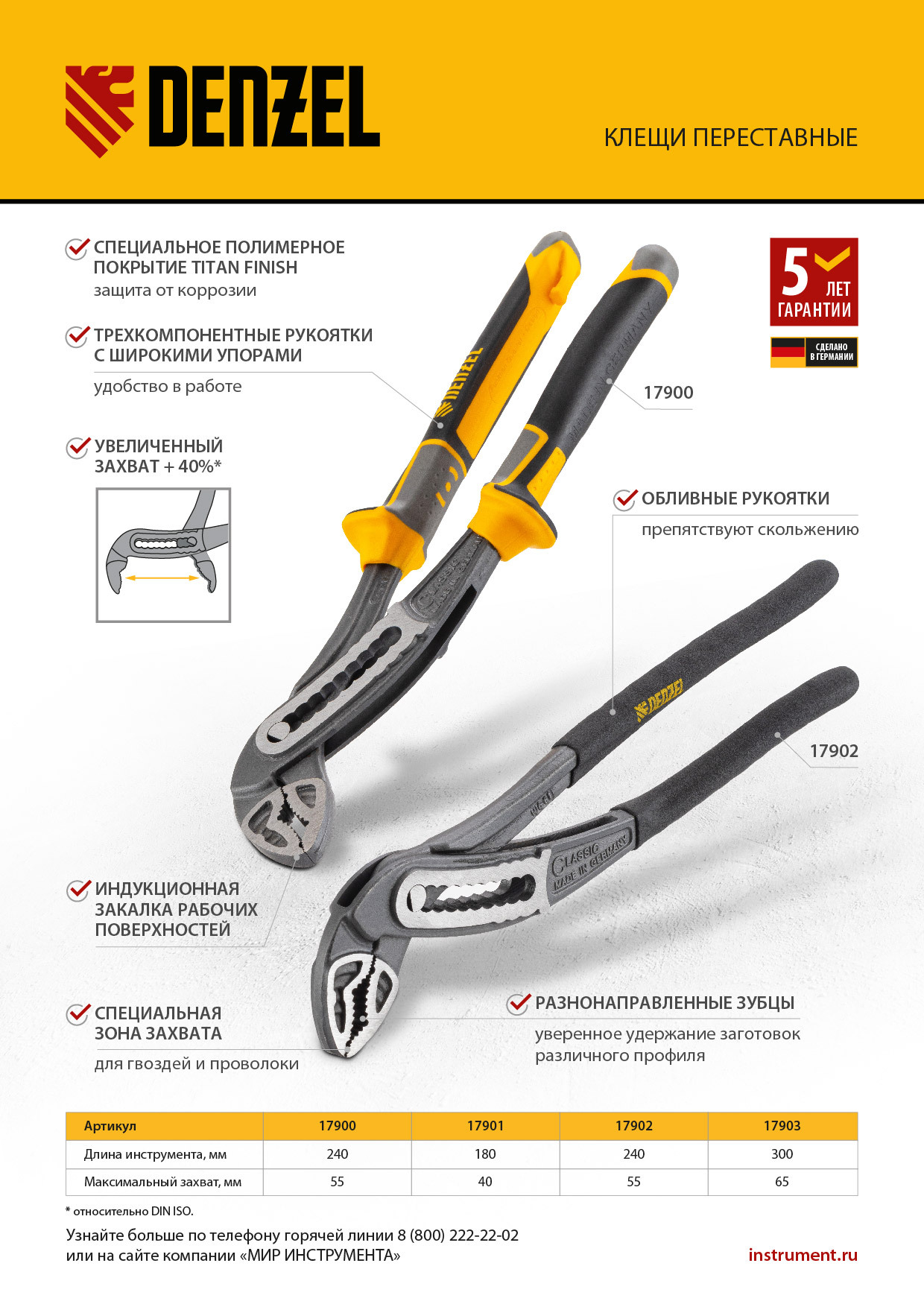 Переставные клещи Denzel 17903 длиной 300 мм, с обливными рукоятками, предназначены для фиксации и вращения деталей и заготовок различной формы. Подходят для захвата фитингов, труб, крепежных элементов. Инструмент используется при проведении ремонтных, монтажных, сантехнических работ.