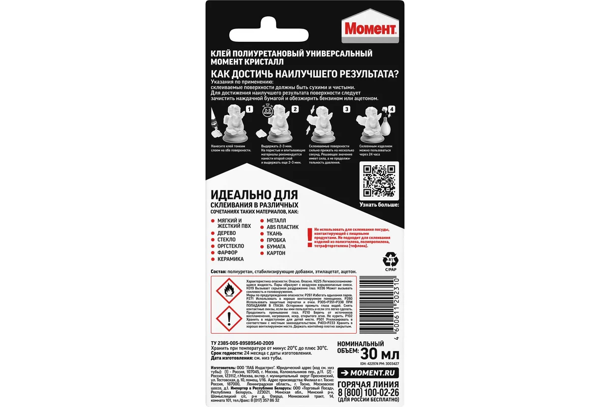 Клей Кристалл Момент 422974 является полиуретановым и предназначен для склеивания следующих материалов: мягкого и жесткого поливинилхлорида, полистирола, оргстекла и других пластиков. Можно склеивать в различных сочетаниях дерево, металл, резину, бумагу, картон, кожу, ткань, пробку, поролон, фарфор, керамику, стекло. Шов получается высокопрочным и водостойким. Нельзя использовать для посуды, контактирующей с пищей. Необходимо хранить при температуре о -20ºС до +30ºС. Если клей замерз, то свои свойства он восстановит при комнатной температуре. Поставляется на блистере. Срок годности — 24 месяца.