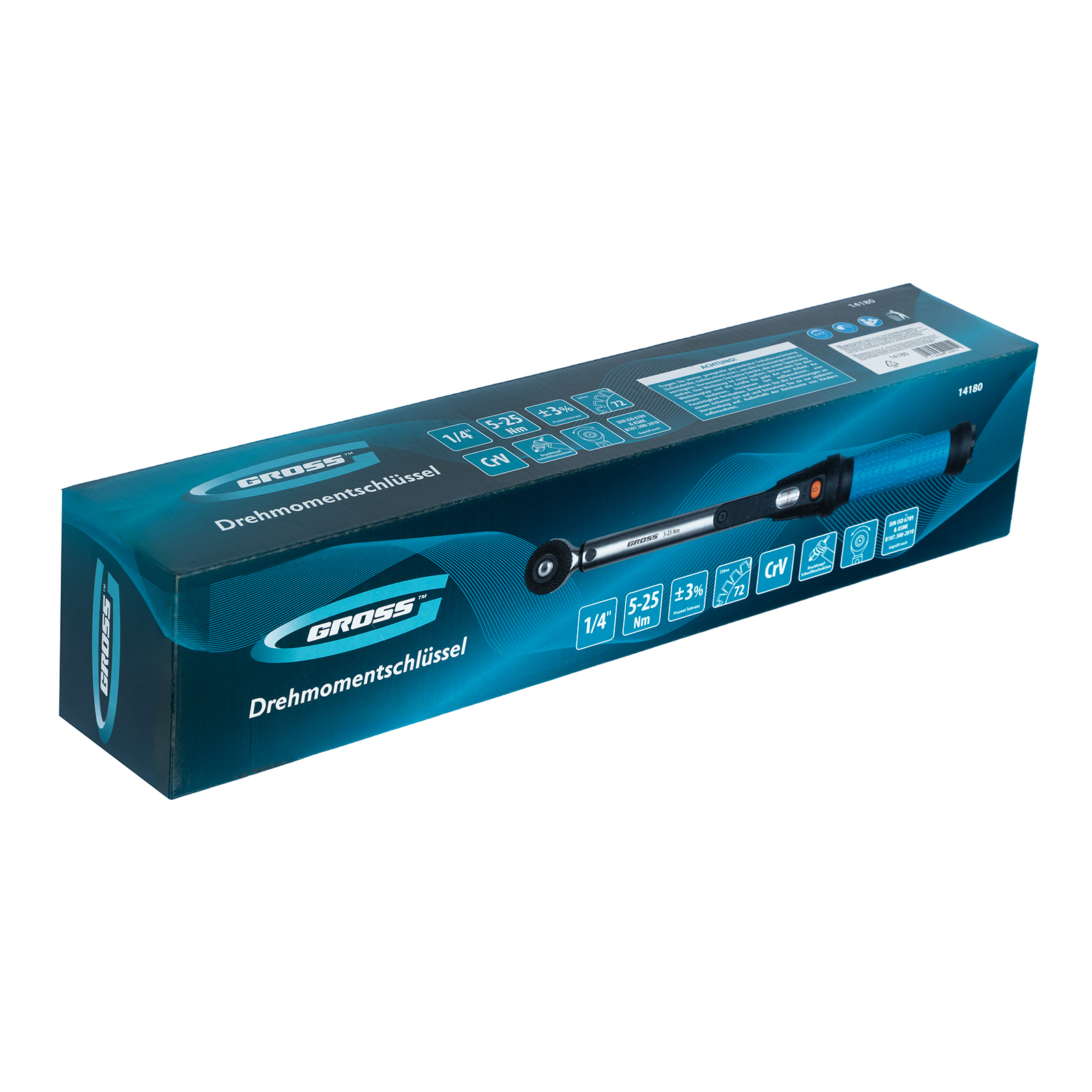 Динамометрический ключ Gross 14180 с посадочным квадратом 1/4", из стали CrV, используется для закручивания резьбового крепежа с точно заданным усилием в диапазоне от 5 до 25 Нм. Оснащен индикатором настройки крутящего момента, обладает повышенной точностью, погрешность составляет +-3%. Момент силы контролируется щелчковым механизмом, что облегчает работу в условиях отсутствия визуального контроля. Инструмент применяется для сборки и ремонта техники, а также для обслуживания автомобилей.