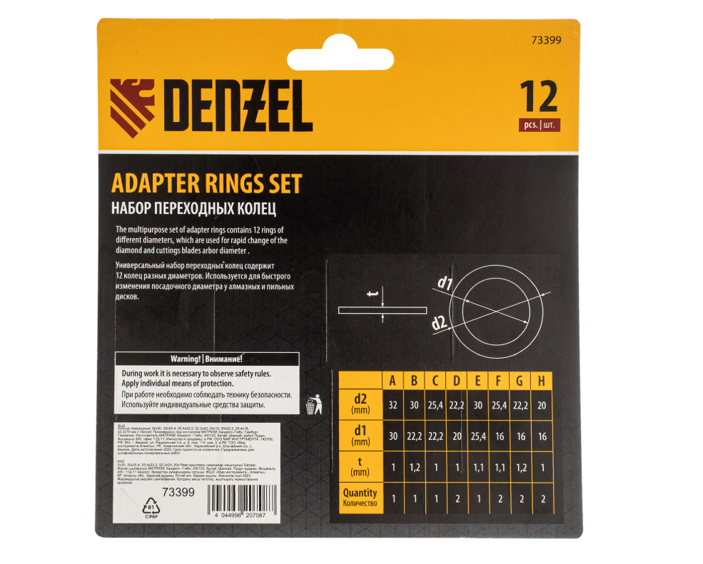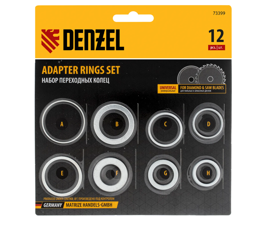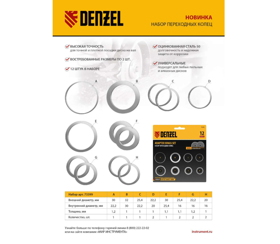 Переходные кольца Denzel 73399 диаметром 32 х 30, 30 х 25,4, 25,4 х 22,2, 22,2 х 20, 20 х 16, 30 х 22,2, 25,4 х 16, 22,2 х 16 мм предназначены для корректировки размера посадочного отверстия пильных и алмазных дисков. Используются для работы с циркулярными и торцовочными пилами. Комбинируя различные кольца из набора, можно добиться плотной посадки диска с любым посадочным диаметром.
