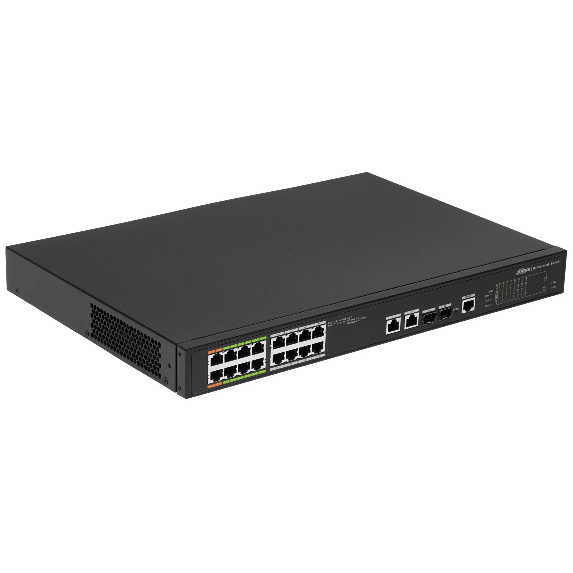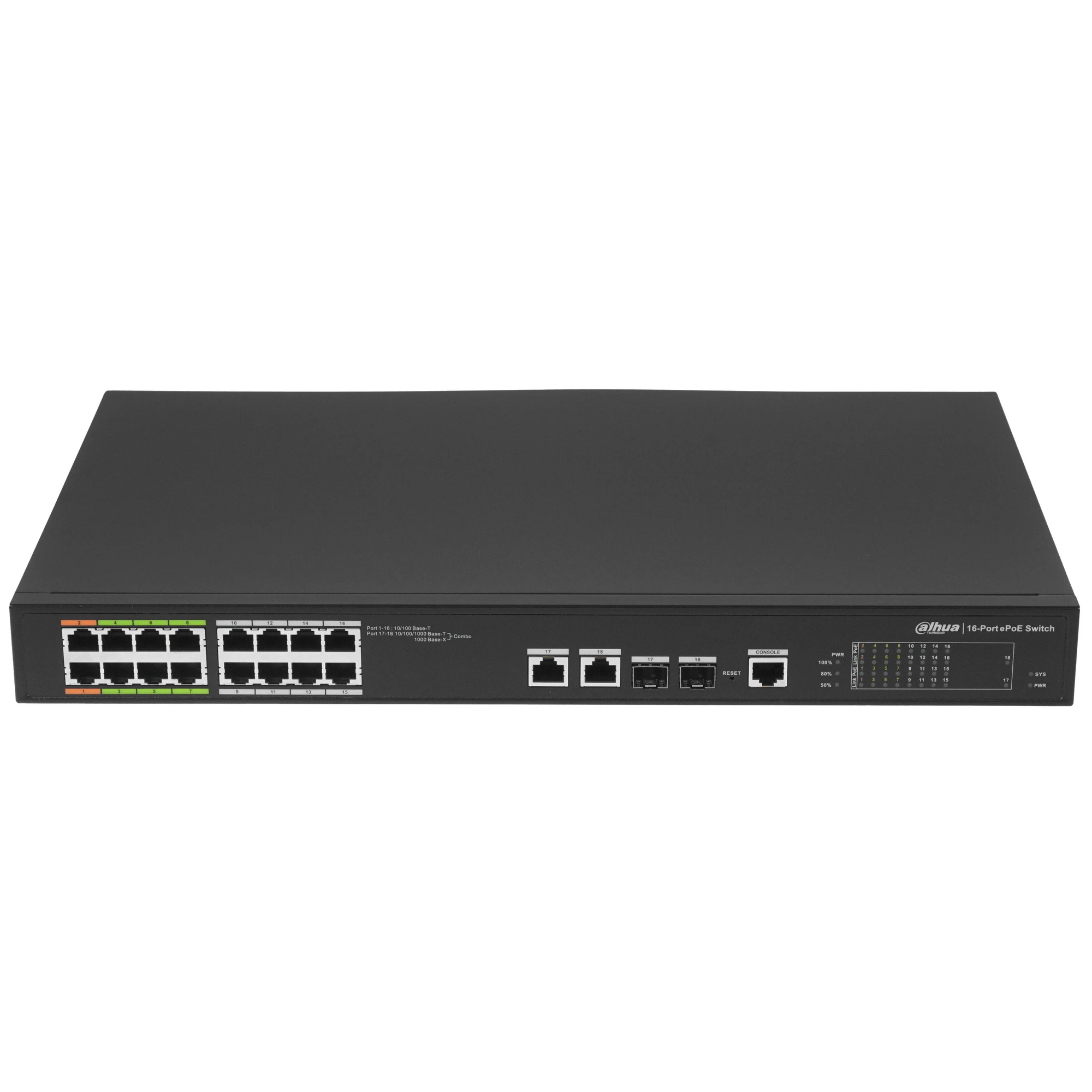 Коммутатор Dahua DH-LR2218-16ET-240 управляемого типа объединяет в локальную сеть компьютеры, ноутбуки, принтеры и другие сетевые устройства для обмена данными между ними. Управлять сетью можно по протоколу SNMP или через web-интерфейс. В коммутаторе имеются гигабитные порты RJ-45 и 16 PoE-портов, через которые данные передаются на расстояние до 800 м по витой паре. При подключении через коаксиальный кабель расстояние может увеличится до 1000 м. Базовая скорость передачи данных составляет 100 Мбит/с.