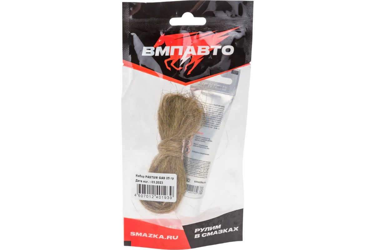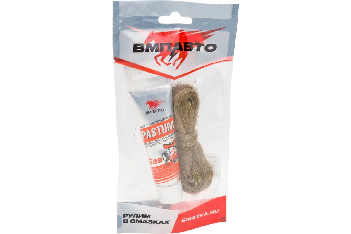 Комплект со льном ВМПАВТО Pastum gas 25г туба, лен 7г 8203 для уплотнения резьбовых соединений газового оборудования. Обеспечивает герметичность соединений, облегчает монтаж системы, защищает от коррозии металла, предотвращает окисление льна.