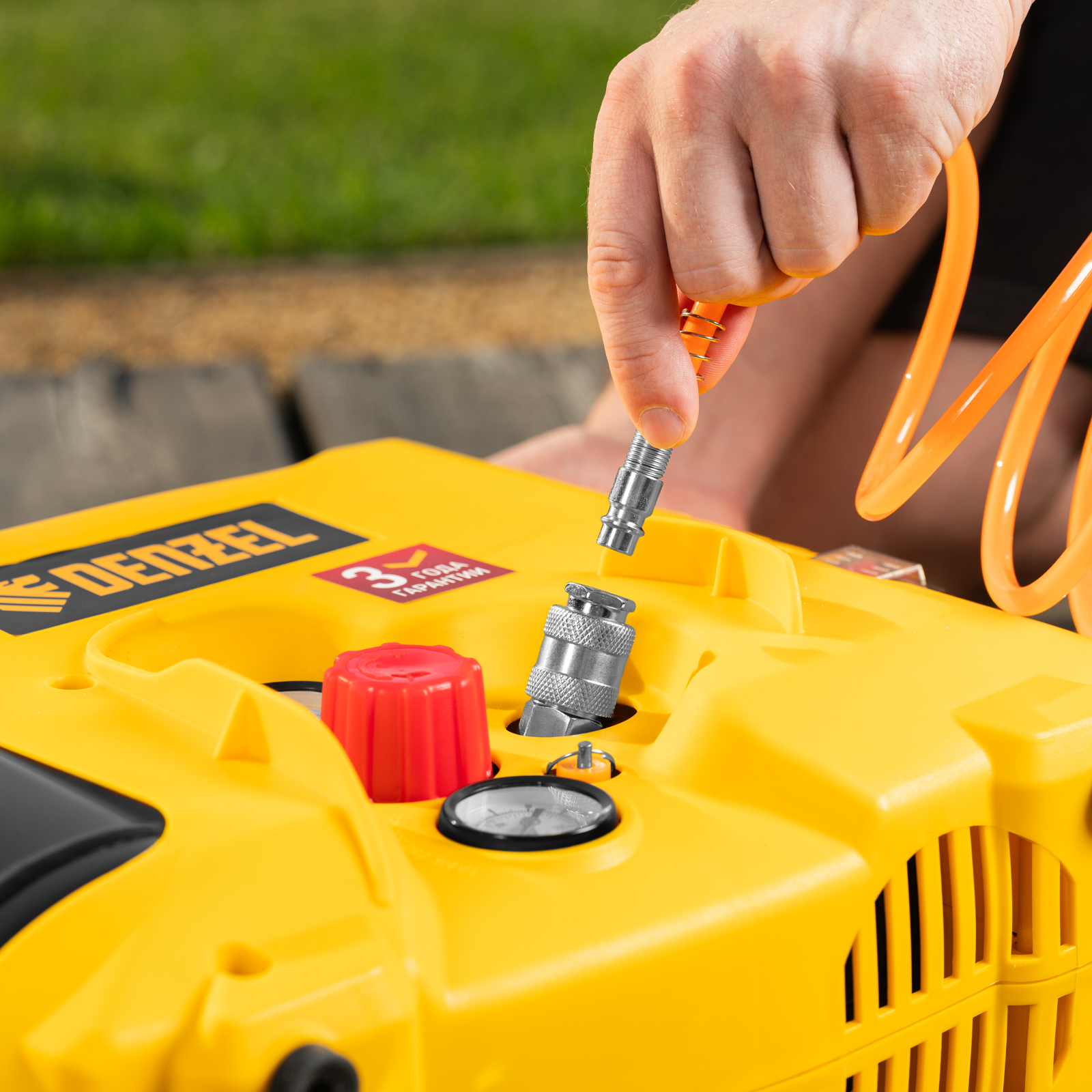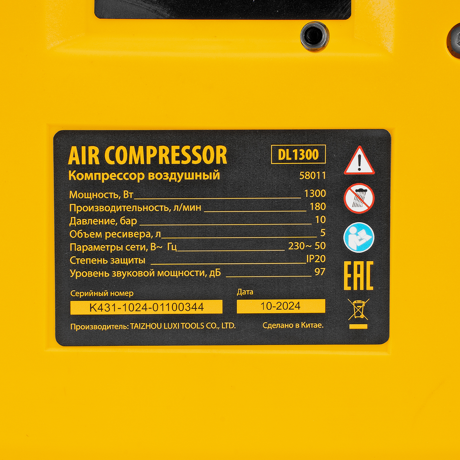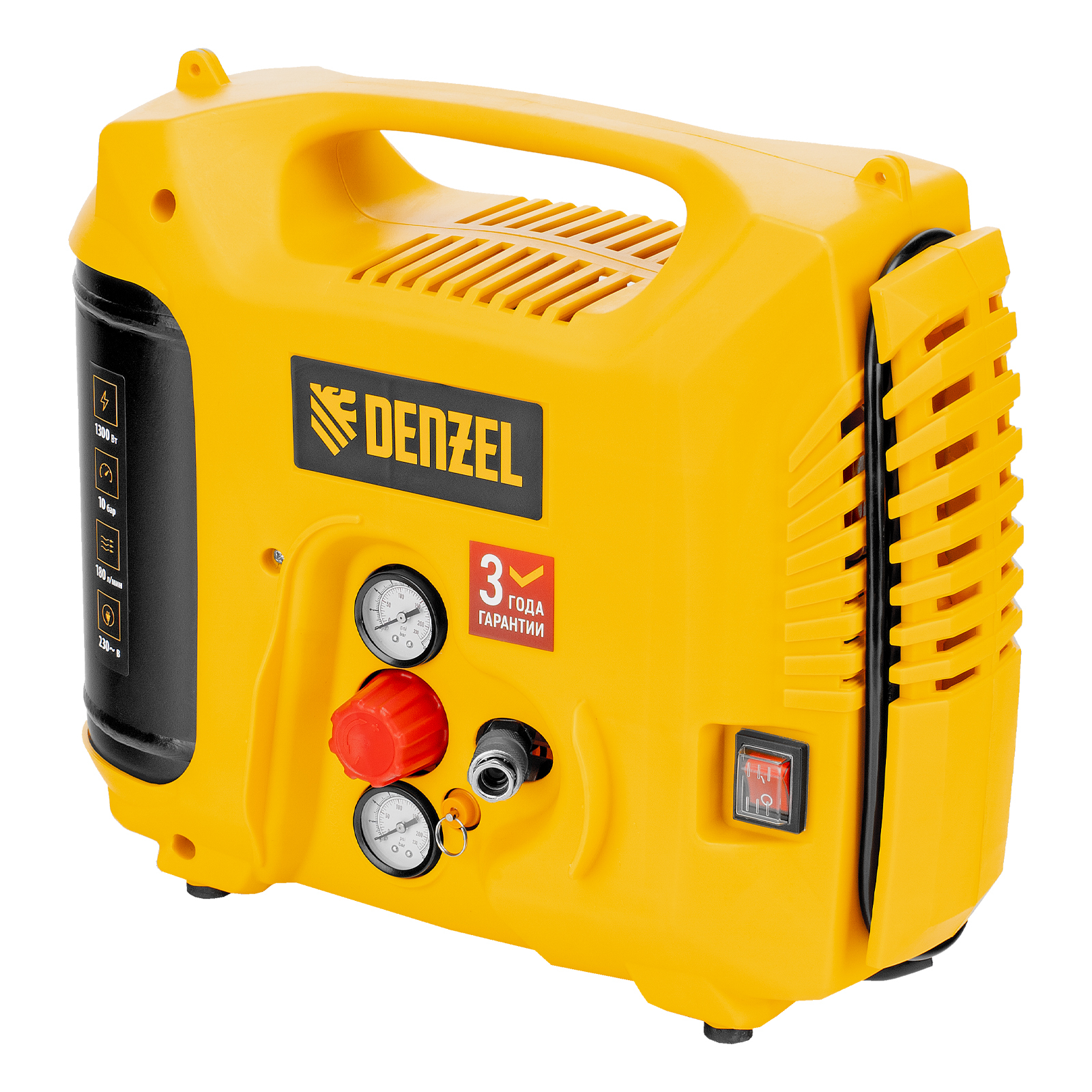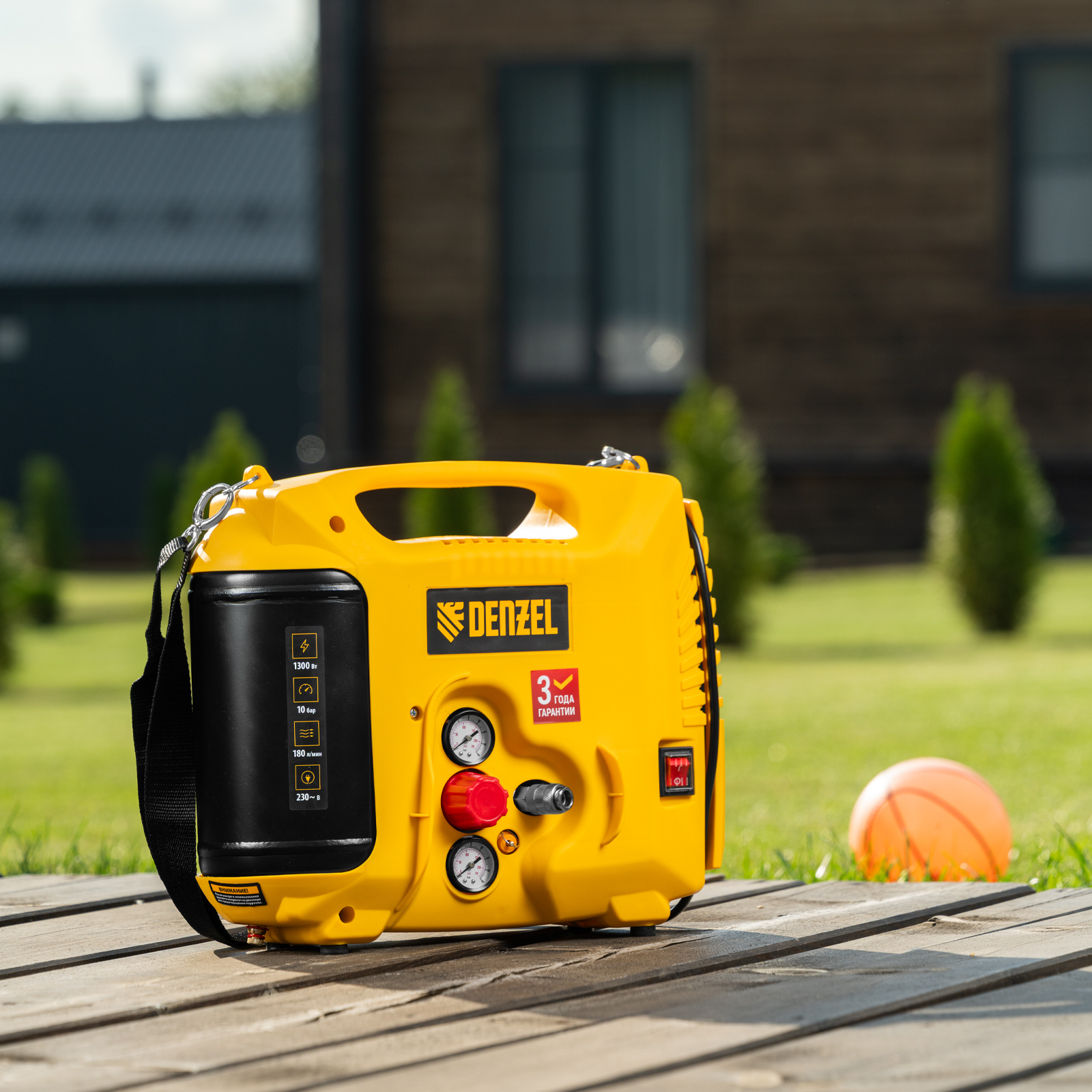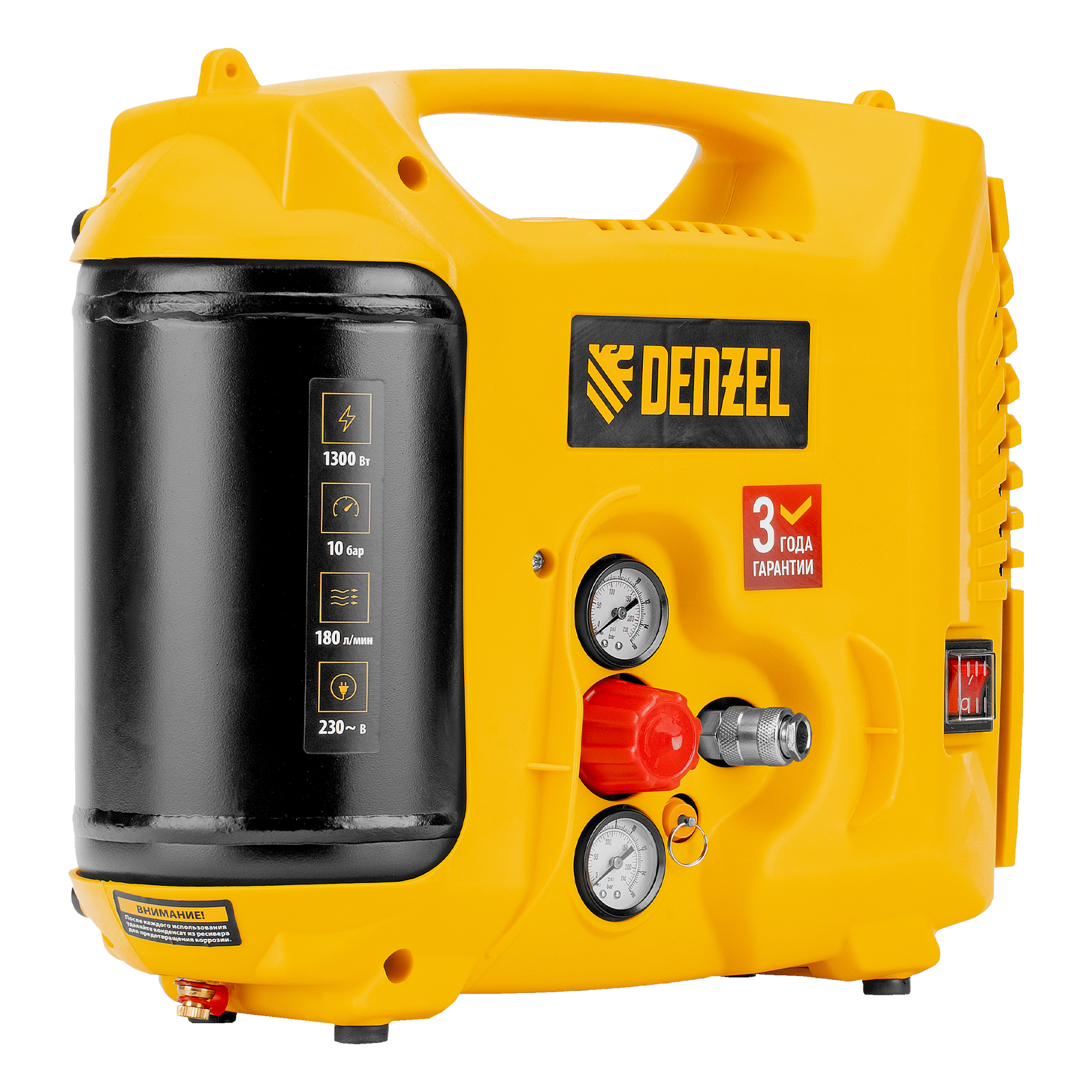 Компрессор воздушный Denzel DL1300 58011 мощностью 1,3 кВт, с максимальным рабочим давлением 10 бар, обеспечивает производительность 180 л/мин и поставляется с набором аксессуаров. Предназначен для обеспечения сжатым атмосферным воздухом нейлеров, степлеров, продувочных пистолетов, окрасочных и мовильных пистолетов и других пневмоинструментов, не требующих большого объема воздуха. Компрессор идеален для накачивания автомобильных шин, лодок, матрасов, мячей и прочих надувных изделий, а также для продувки труб водоснабжения.