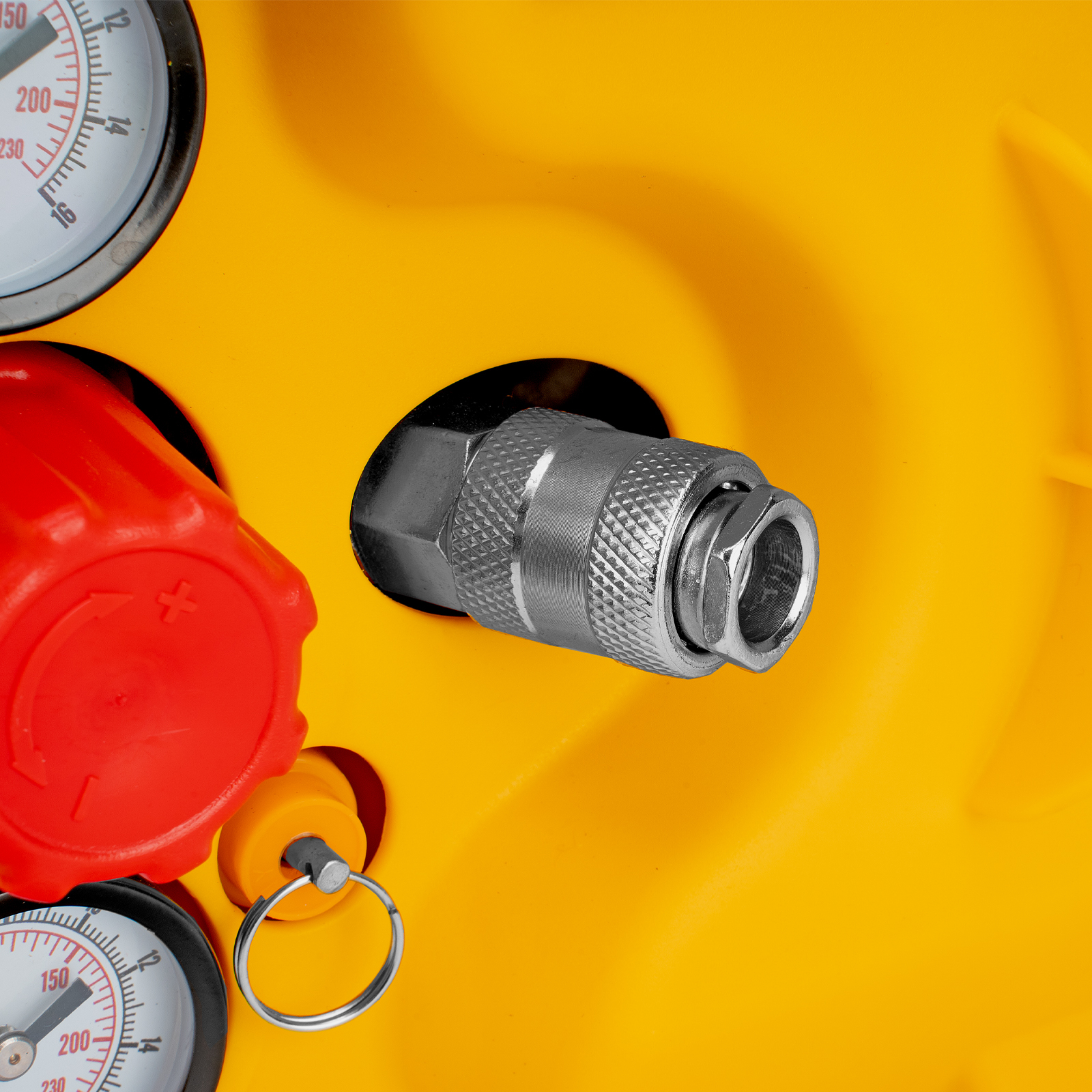 - Набор пневмоинструмента в комплекте — к устройству прилагается пистолет для накачивания с манометром, продувочный пистолет, пневматический шланг, а также набор пневмосопел и переходников.