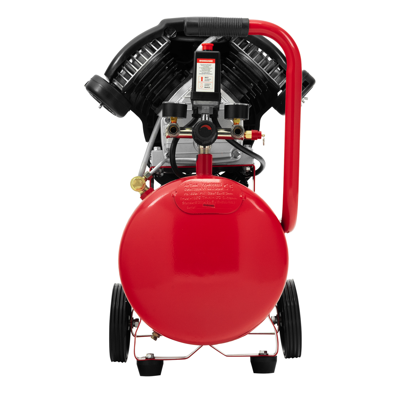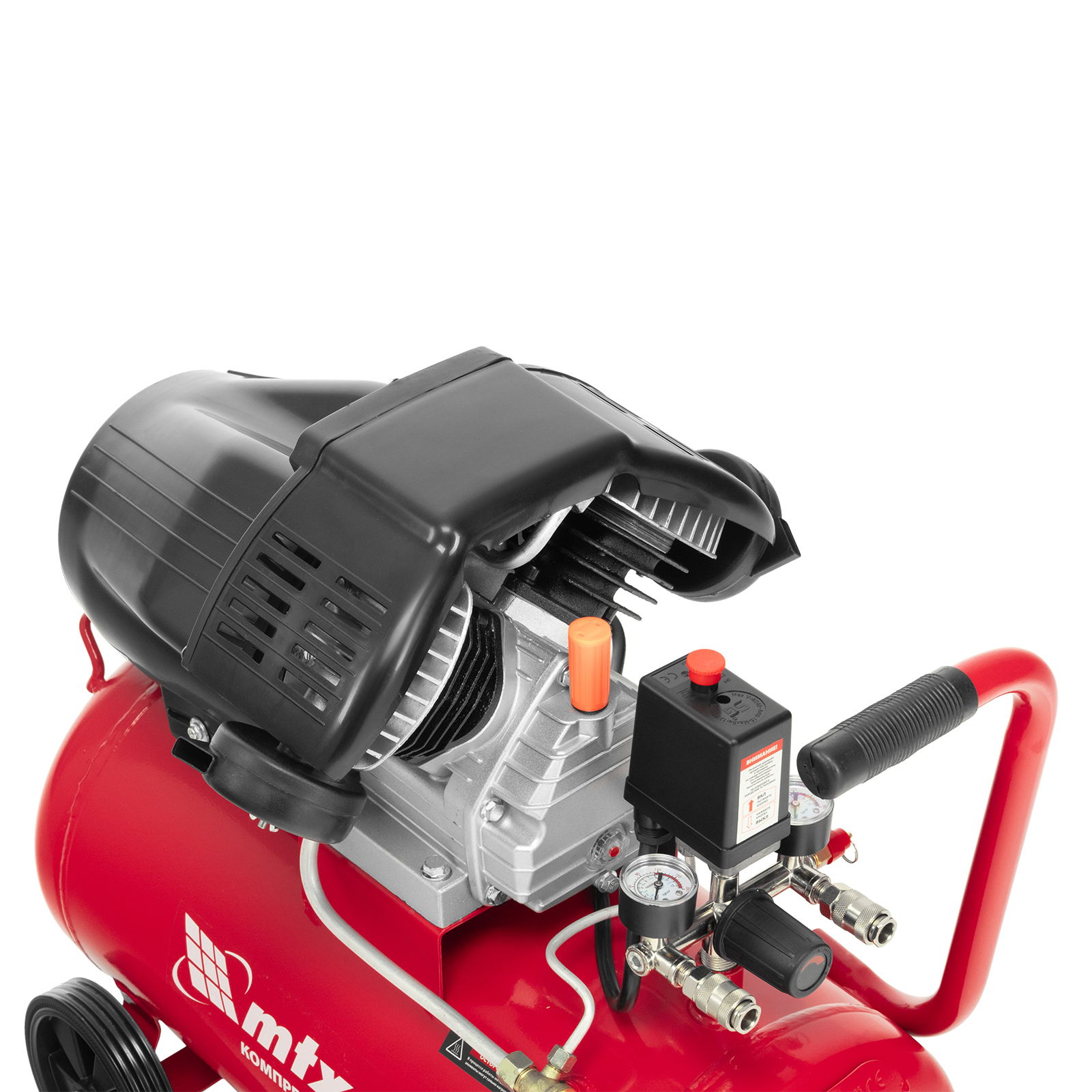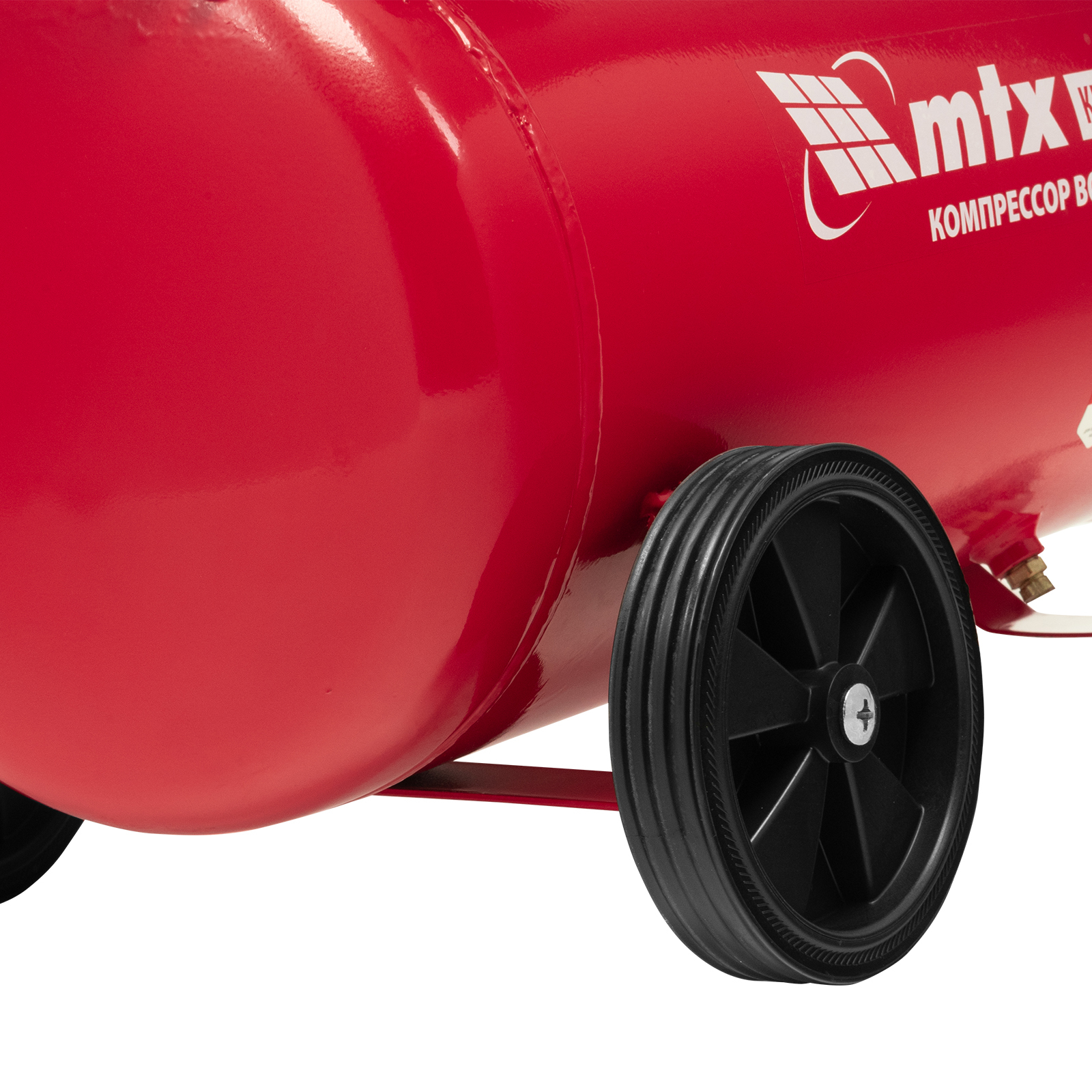 - Мобильность — благодаря колесам и рукоятке компрессор удобно разворачивать и перемещать по рабочей площадке.