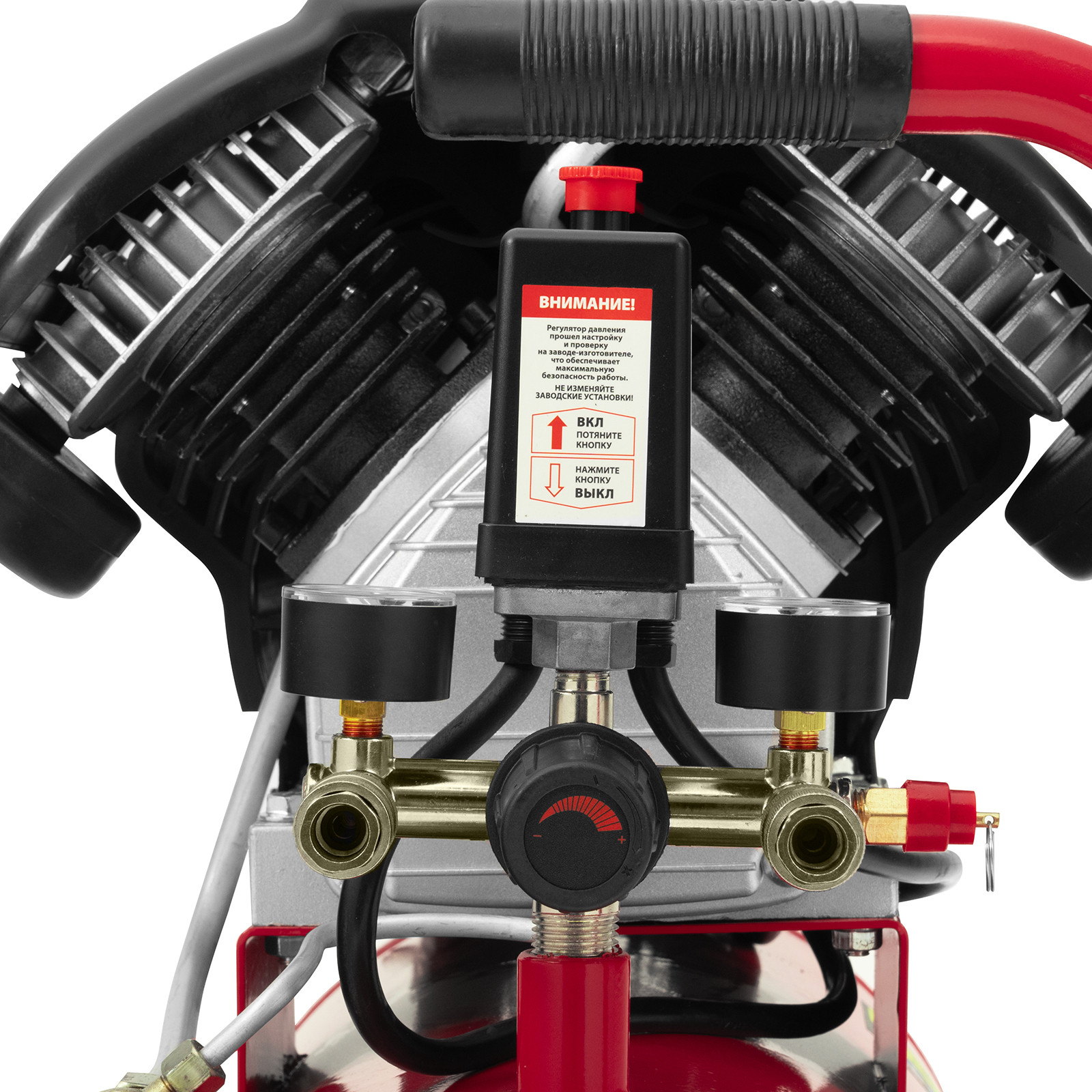 - Автономная работа — прессостат обеспечивает автоматическую остановку двигателя по достижении максимального рабочего давления и запуск при падении давления до минимального уровня.