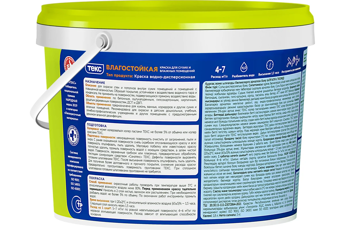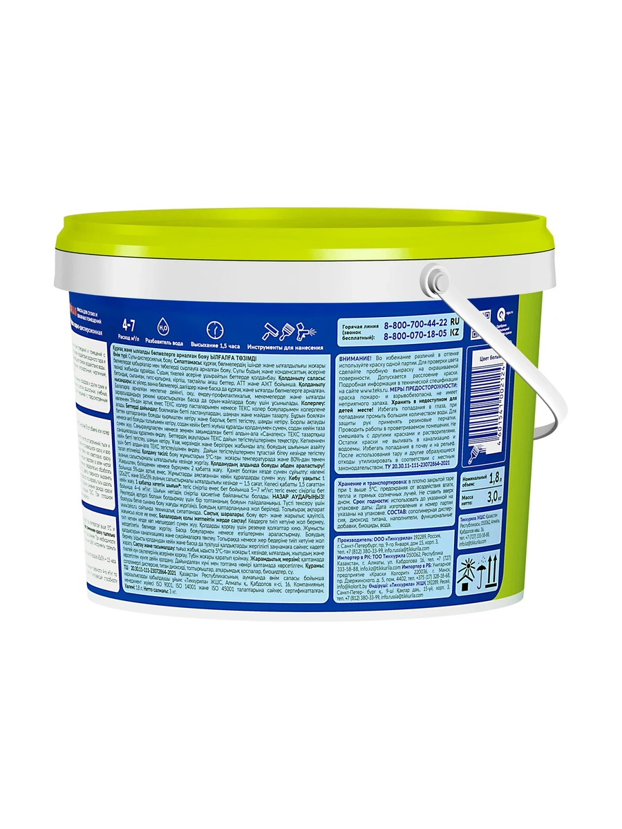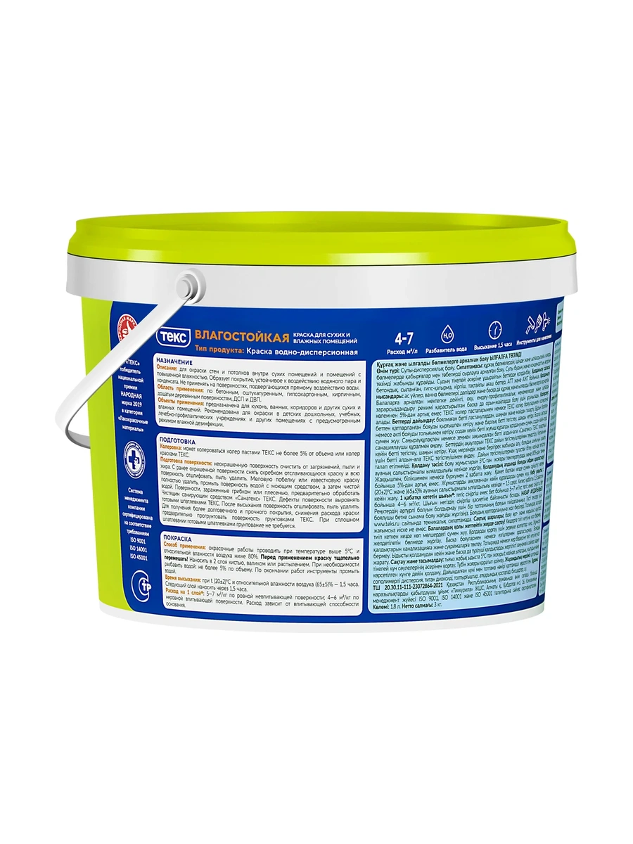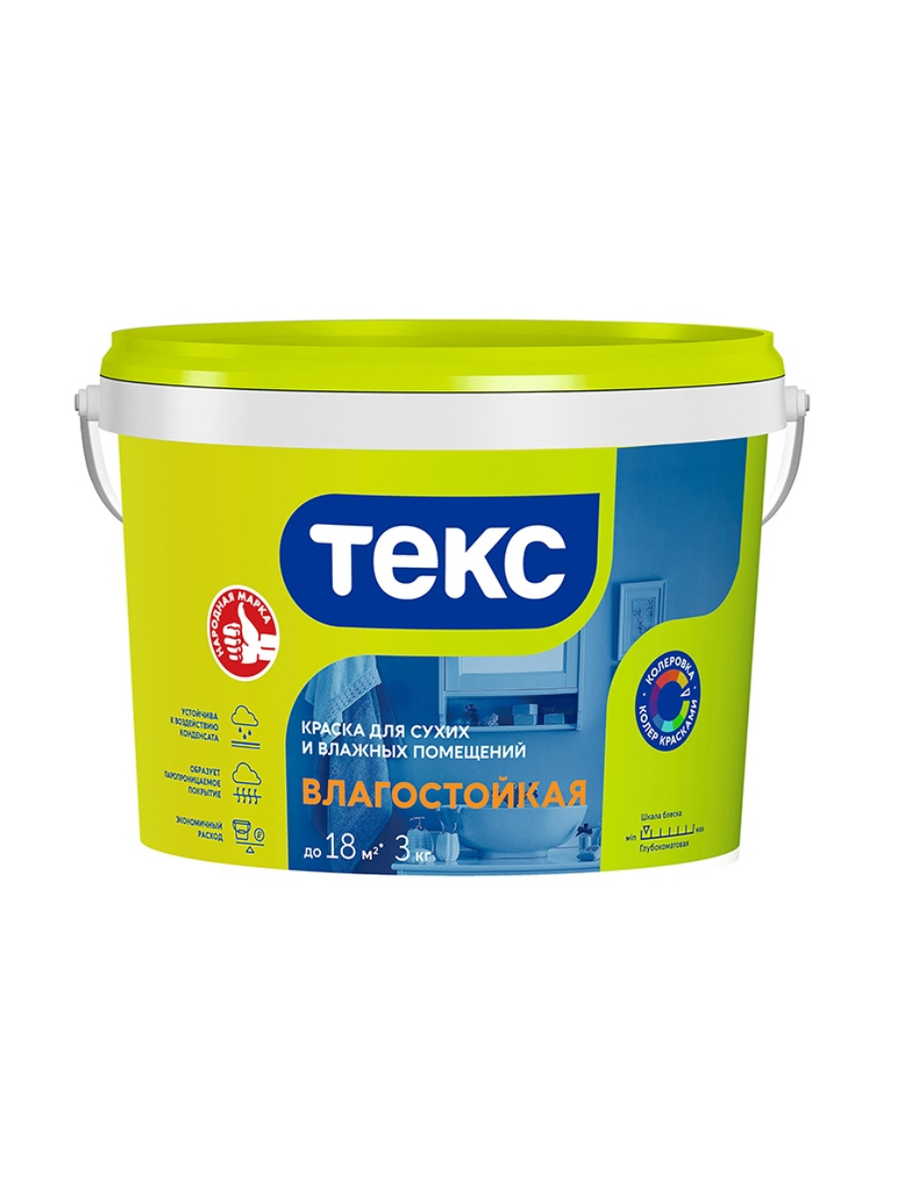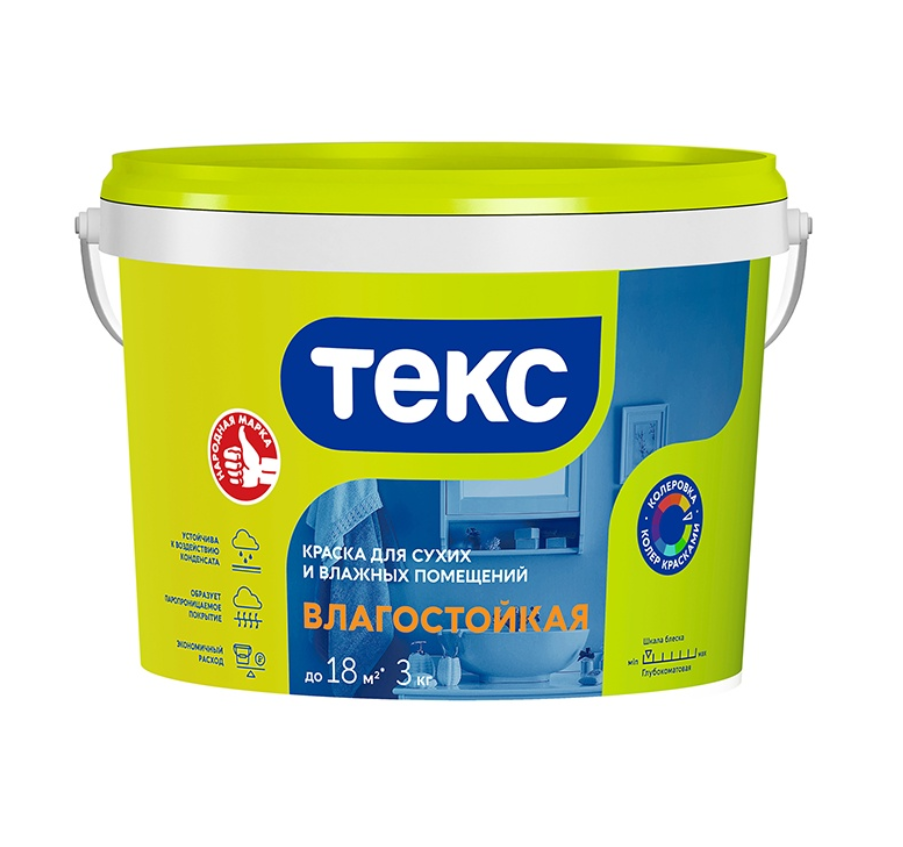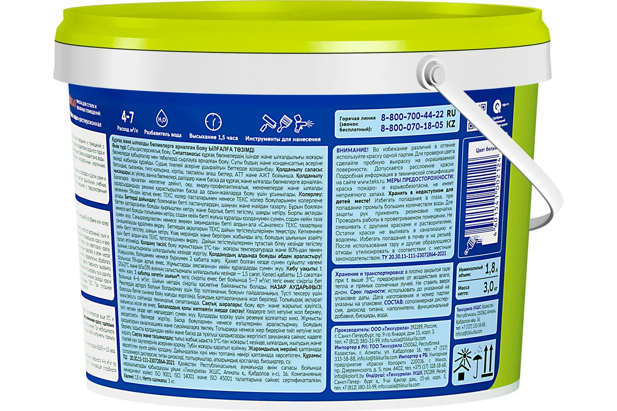 Цвет Белый. Колеровка: может колероваться колер пастами ТЕКС не более 5% от объема или колер красками ТЕКС. Во избежание различий в оттенке используйте краску одной партии. Для проверки цвета сделайте пробную выкраску на окрашиваемой поверхности.