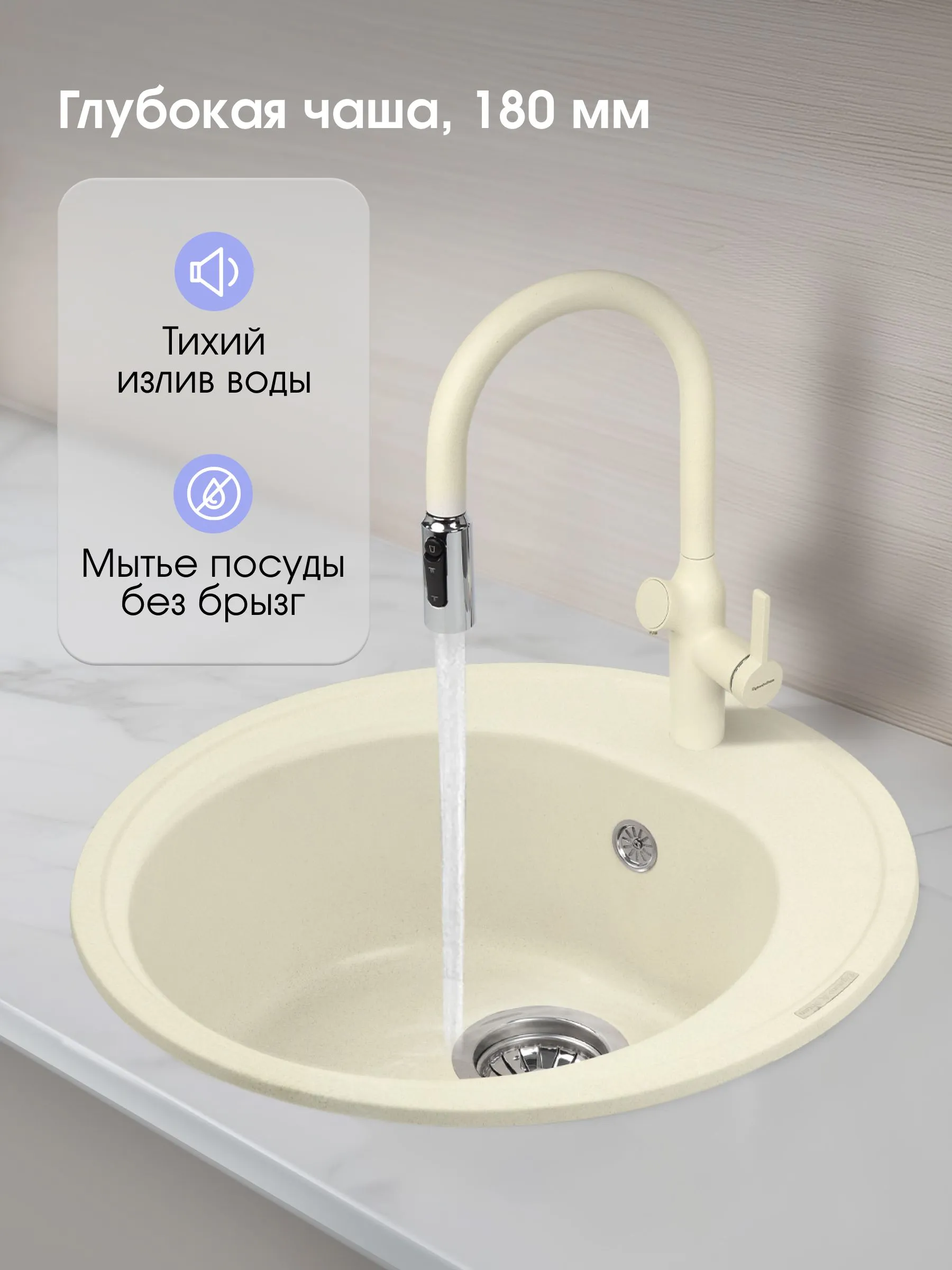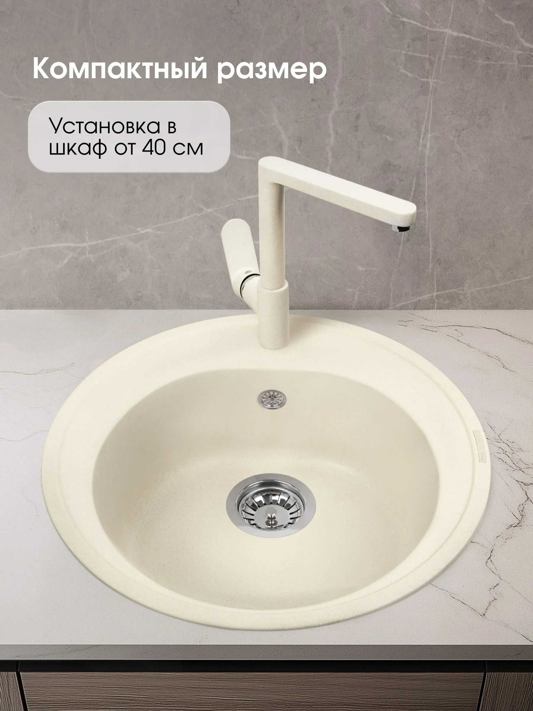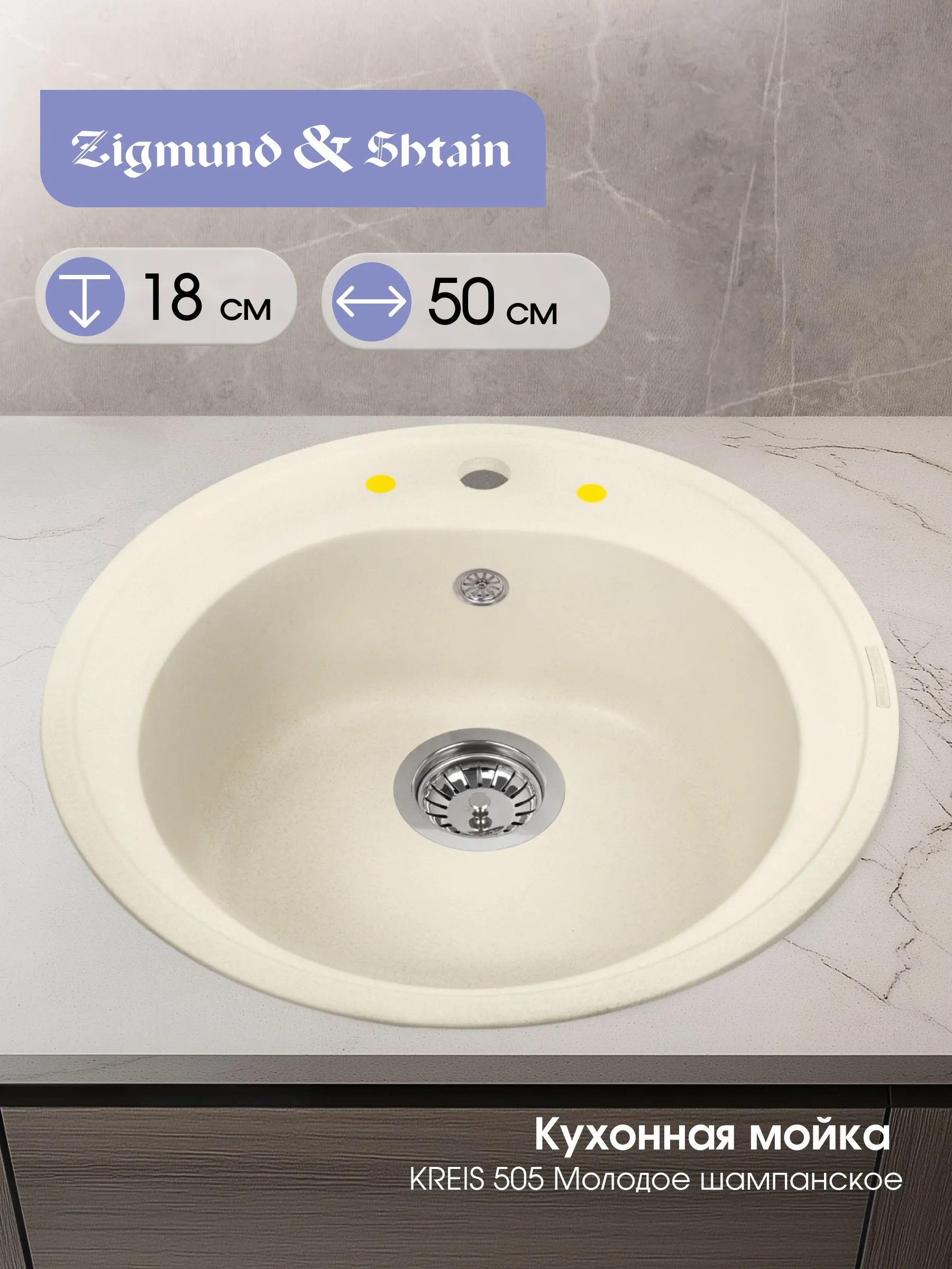 Тип Мойка Форма мойки Круг Диаметр слива, мм 90 Глубина, см 50.5 Ширина, см 50.5 Минимальный размер тумбы 45 см Материал Гранит Установка врезная Клапан-автомат Нет Отверстия под смеситель 1 Крыло Отсутствует Цвет Молодое шампанское