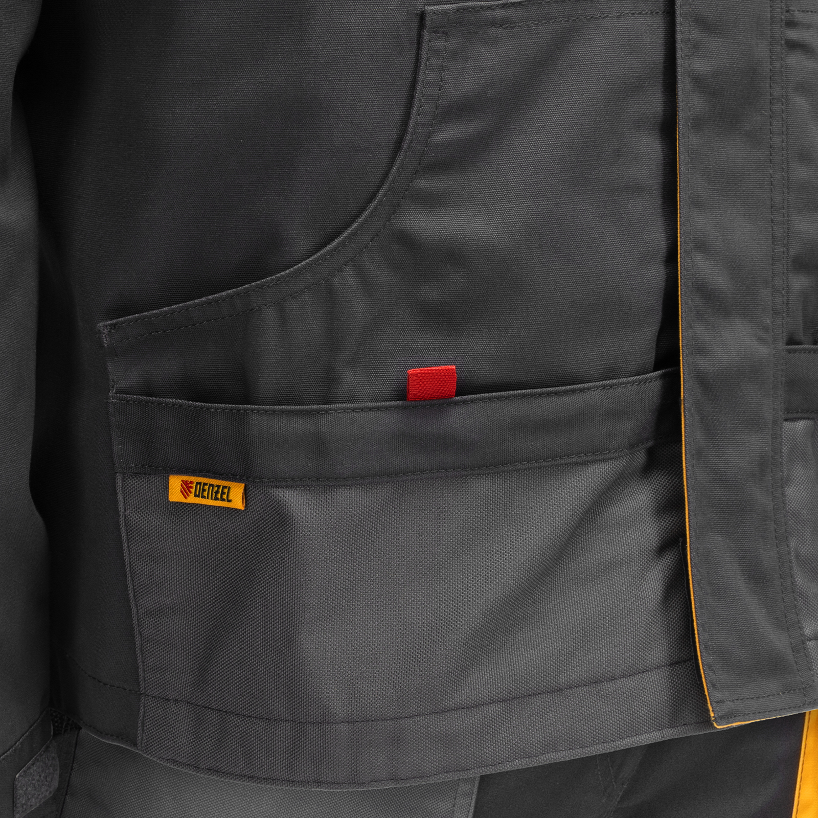 Профессиональная рабочая куртка Denzel 90380 размера XXL защищает пользователя от общих производственных загрязнений, нетоксичной пыли, ветра и незначительных механических воздействий. Рассчитана на рост 188-191 см и предназначена для использования в теплое время года или в отапливаемом помещении. Куртка изготовлена из ткани плотностью 260 г/м² (65% полиэстер, 35% хлопок). За счет наличия хлопковых волокон в составе ткань хорошо пропускает воздух и приятна на теле, полиэстер обеспечивает устойчивость к истиранию. Одежда выполнена в практичном темно-сером цвете.