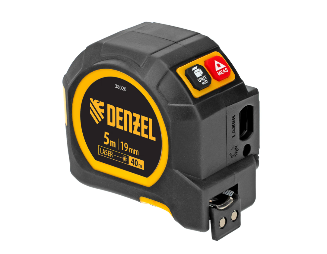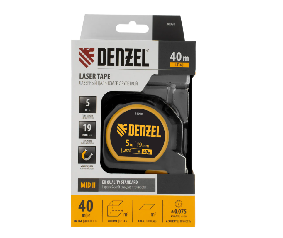 Лазерный дальномер с рулеткой Denzel LT-40 38020 — высокоточный многофункциональный инструмент для профессионалов и любителей. Предназначен для измерения расстояний от 0,2 до 40 метров при погрешности 0,075 мм/м, а также для определения площади и объема помещения. В инструмент интегрирована гибкая механическая рулетка длиной 5 метров, повышающая точность измерений. Li-Ion аккумулятор емкостью 380 мА·ч обеспечивает длительное время работы.