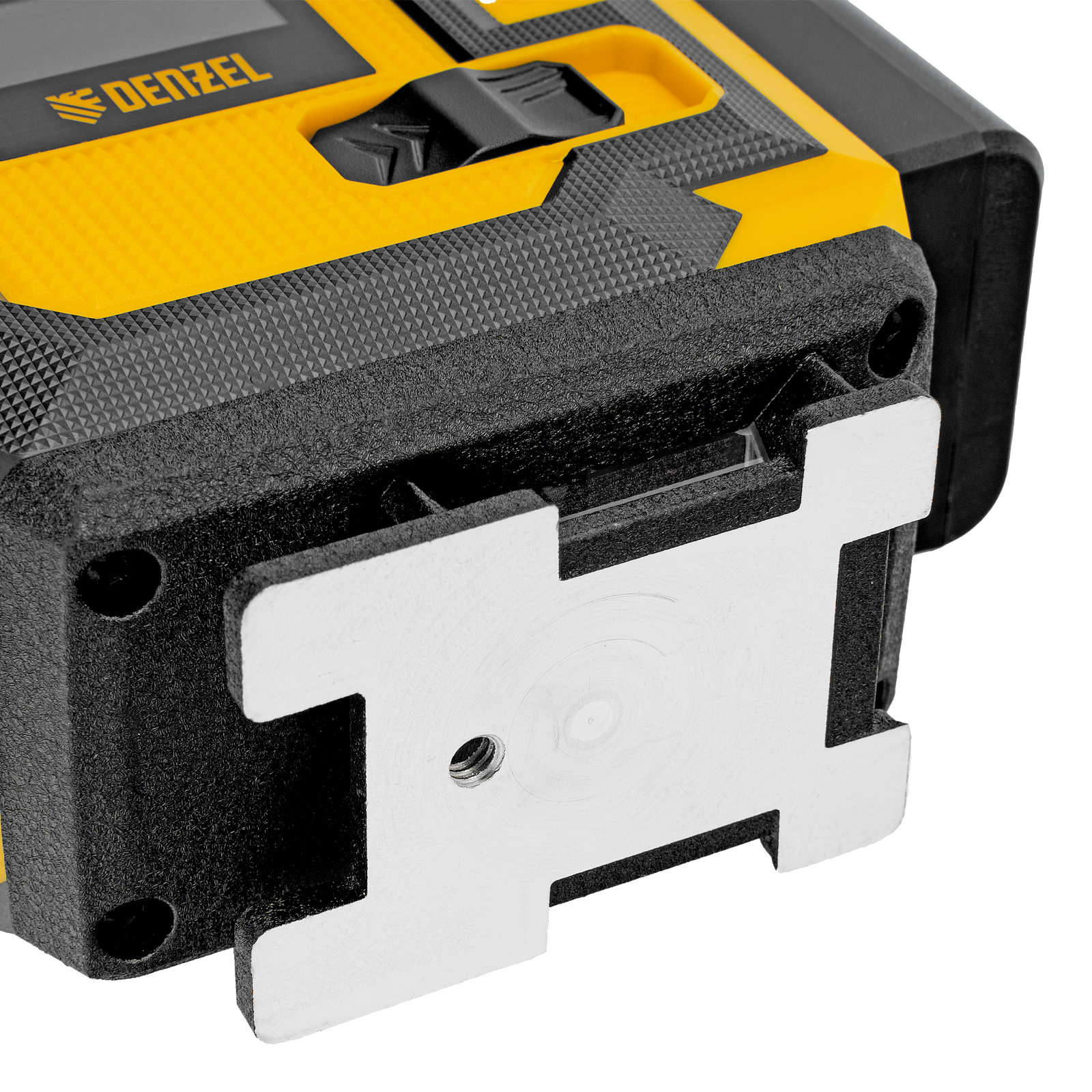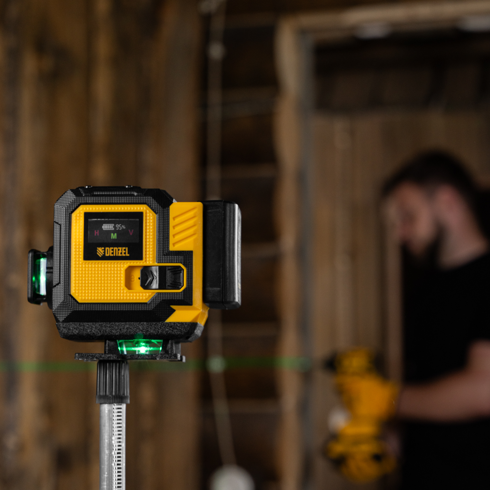 Мультипризменный лазерный уровень Denzel DLV-360-3C 35080 поставляется в кейсе, работает от аккумулятора Li-Ion емкостью 2,4 А·ч и проецирует горизонтальную и 2 вертикальные линии на расстояние до 30 м при помощи зеленых лучей длиной 520 нм. С его помощью можно нанести разметку и выровнять предметы относительно друг друга и земли с точностью до 0,3 мм/м. Угол развертки составляет 360°, что повышает удобство и эффективность работы. Прибор незаменим во время проведения строительных, ремонтных, отделочных работ, обустройства интерьера.