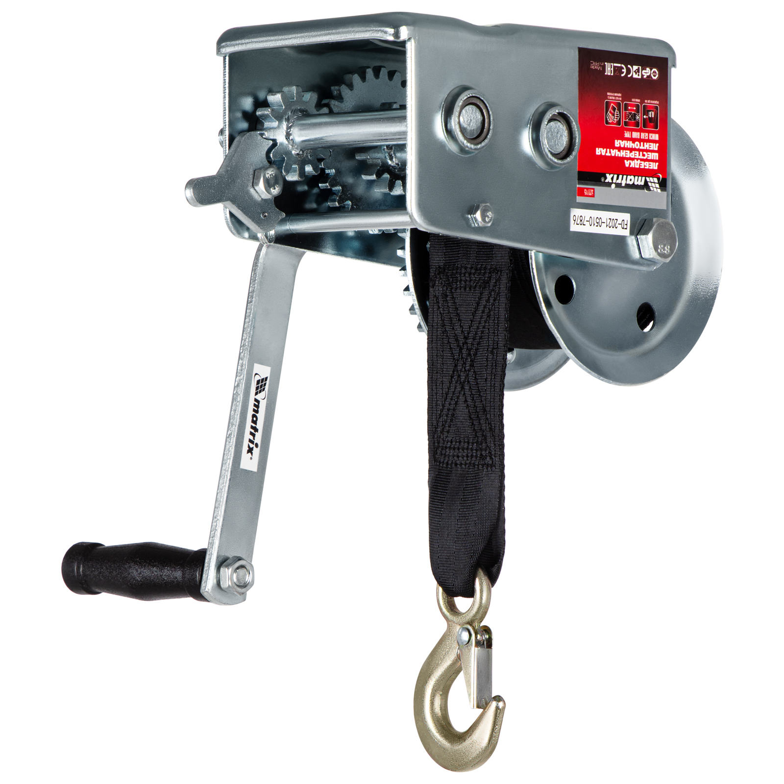 Лебедка шестеренчатая ленточная Matrix 522715, тяга - 0,8 т, рассчитана на перемещение грузов в горизонтальной плоскости. Она пригодится при проведении строительных, такелажных, погрузочно-разгрузочных работ. Благодаря рычажному механизму лебедка не требует подключения к сети, что особенно актуально для работы на открытом воздухе.