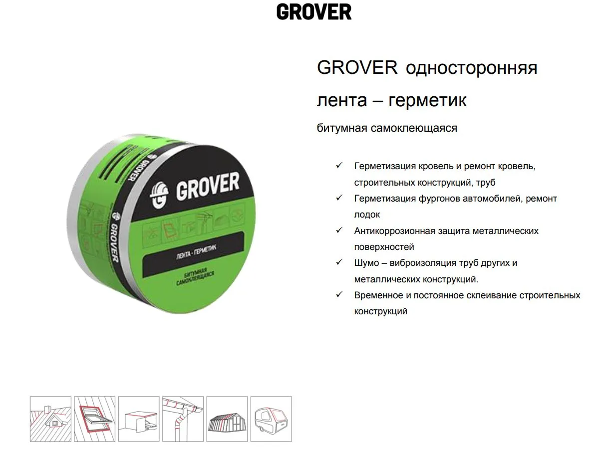 Лента-герметик Grover битумная коричневая 3м х 10см Grover лента-герметик предназначена для герметизации кровель и ремонт кровель, строительных конструкций, труб. Герметизация фургонов автомобилей, ремонт лодок. Антикоррозионная защита металлических поверхностей. Шумо - виброизоляция труб других и металлических конструкций. Временное и постоянное склеивание строительных конструкций.Лента-герметик битумная односторонняя GROVER.СвойстваСклеивает и герметизирует одновременно.Прочное приклеивание к большинству поверхностей.Срок службы 10 лет.Абсолютная водонепроницаемость (ГОСТ 2678-94).Толщина 1,5 мм.Эффект самовосстановления при проколе или порезе.Прочность на разрыв и эластичность.Простота и универсальность применения.Ограничения: Не рекомендуется эксплуатация ленты на поверхностях, температура которых выше 85С.