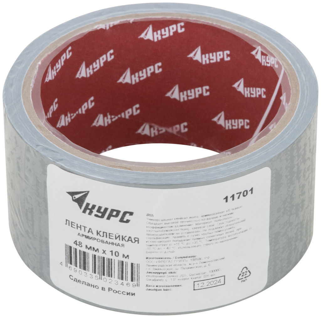 Универсальная клейкая лента КУРС, армированная хлопчатобумажной тканью, предназначена для уплотнения вентиляционных труб, ремонта различных поверхностей, резиновых шлангов, укрывных пленок. Также используется для соединения элементов упаковки, несущих повышенные нагрузки. Обладает высокой прочностью на разрыв и низким коэффициентом удлинения.