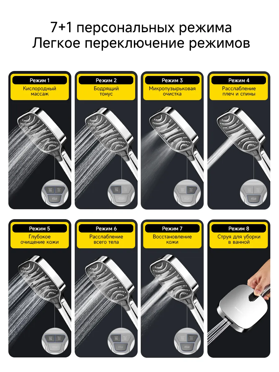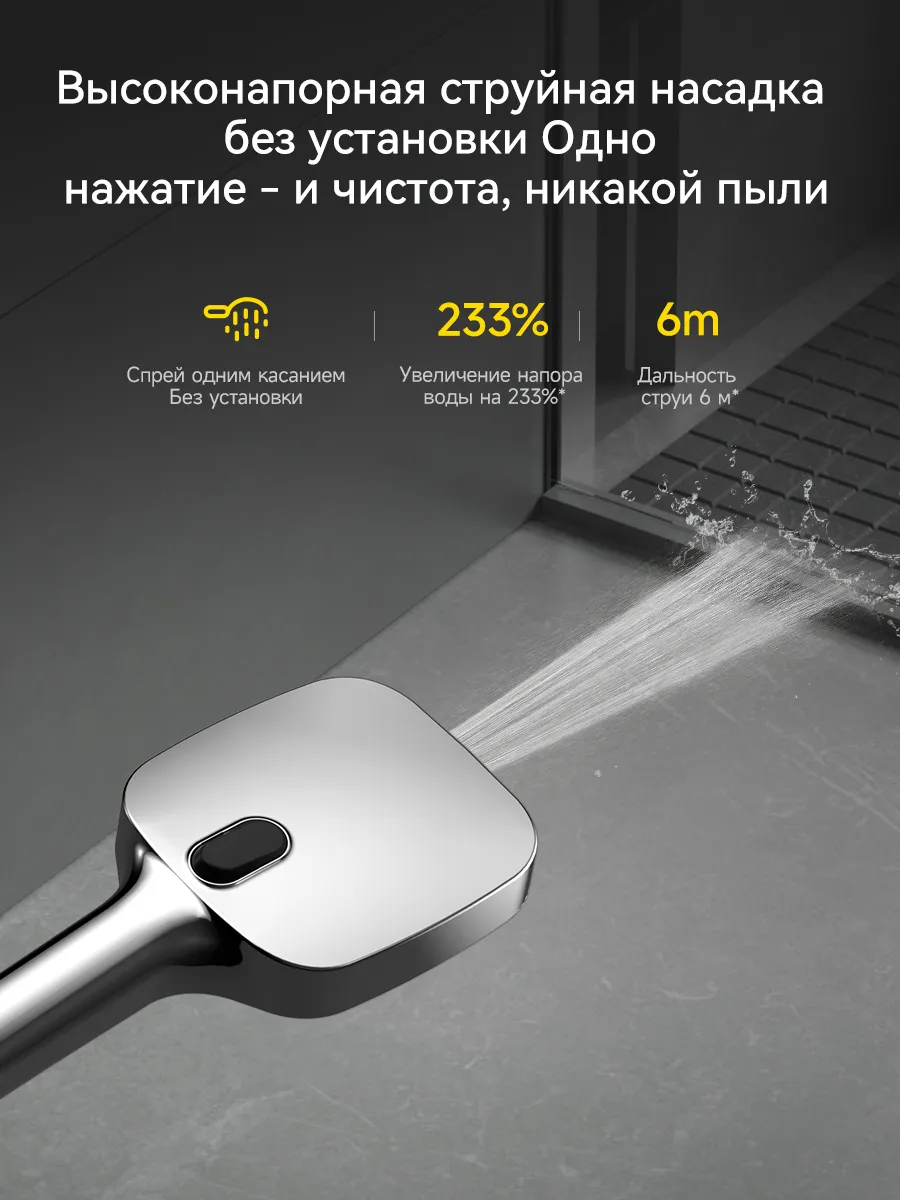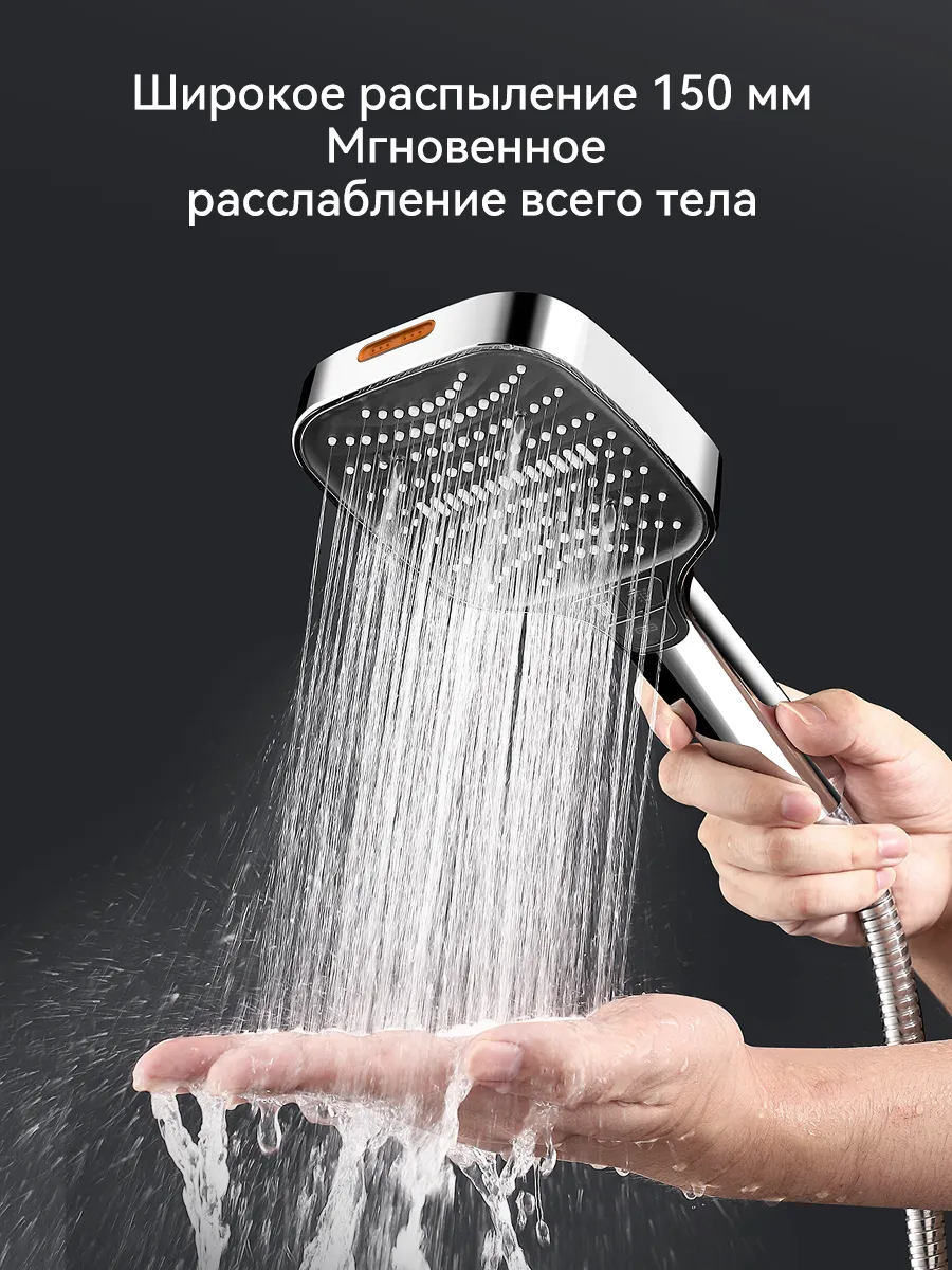 совмещает душ и мощный распылитель для уборки ванной. Одно устройство заменяет два предмета, сочетает комфорт при мытье и удобство в уходе за домом для всей семьи.Воздушно-вихревая турбо-технология высокого давления, стабильный поток воды. 160 мягких силиконовых форсунок делают струю нежной, она не раздражает кожу и дает расслабляющий душ.Широкая панель 150 мм увеличивает площадь орошения на 187% по сравнению с обычными лейками. Плотный водяной занавес обволакивает тело, снимает усталость и экономит воду.8 режимов воды: 7 для душа + 1 режим распылителя. Распылитель не нуждается в дополнительной установке, напор усилен на 233%, дальность струи до 6 м – легко очищает труднодоступные уголки.