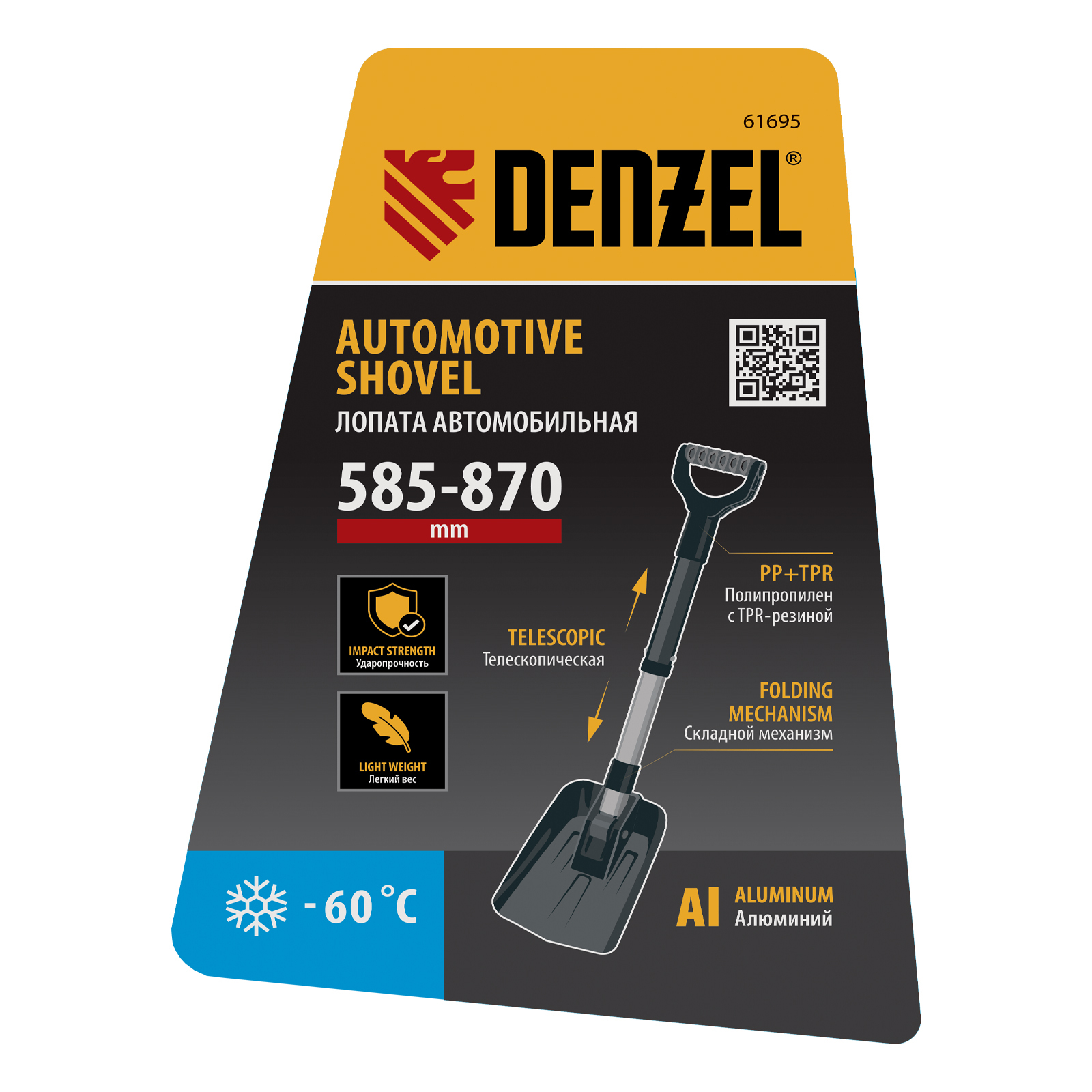 Алюминиевая складная автомобильная лопата Denzel 61695 размером 220 х 280 мм, с телескопическим черенком длиной 585-870 мм, позволяет освободить машину, попавшую в снежный или песчаный занос. Сохраняет рабочие качества при температуре до -60 °C, оптимальна для применения в экстремальных климатических условиях.