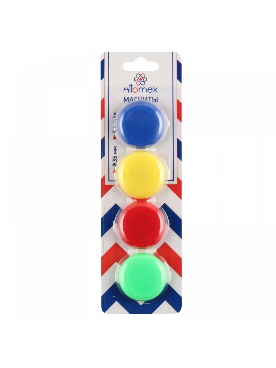Магниты имеют диаметр 35 мм и выполнены в ярких цветах. В наборе 4 штук. Диаметр магнитного элемента 19 мм. Они обладают достаточной силой для надежного крепления блока из 10 листов офисной бумаги к магнитно-маркерной доске или к холодильнику. Магниты являются одним из самых нужных аксессуаров для магнитных досок в офисе, школе или дома. Они позволяют надежно прикрепить к поверхности листы бумаги, заметки, фотографии. Набор магнитов станет отличным дополнением к вашему интерьеру и будет каждый день радовать всех членов семьи! Магниты могут стать частью игры с ребёнком, помогая расширить его кругозор и ассоциативное мышление. Магниты имеют круглую форму, крепятся на доску, а также очень функциональны, с их помощью можно надёжно закрепить листы бумаги с важной информацией или детскими рисунками на холодильнике, магнитно-маркерной доске, витрине или флипчарте.