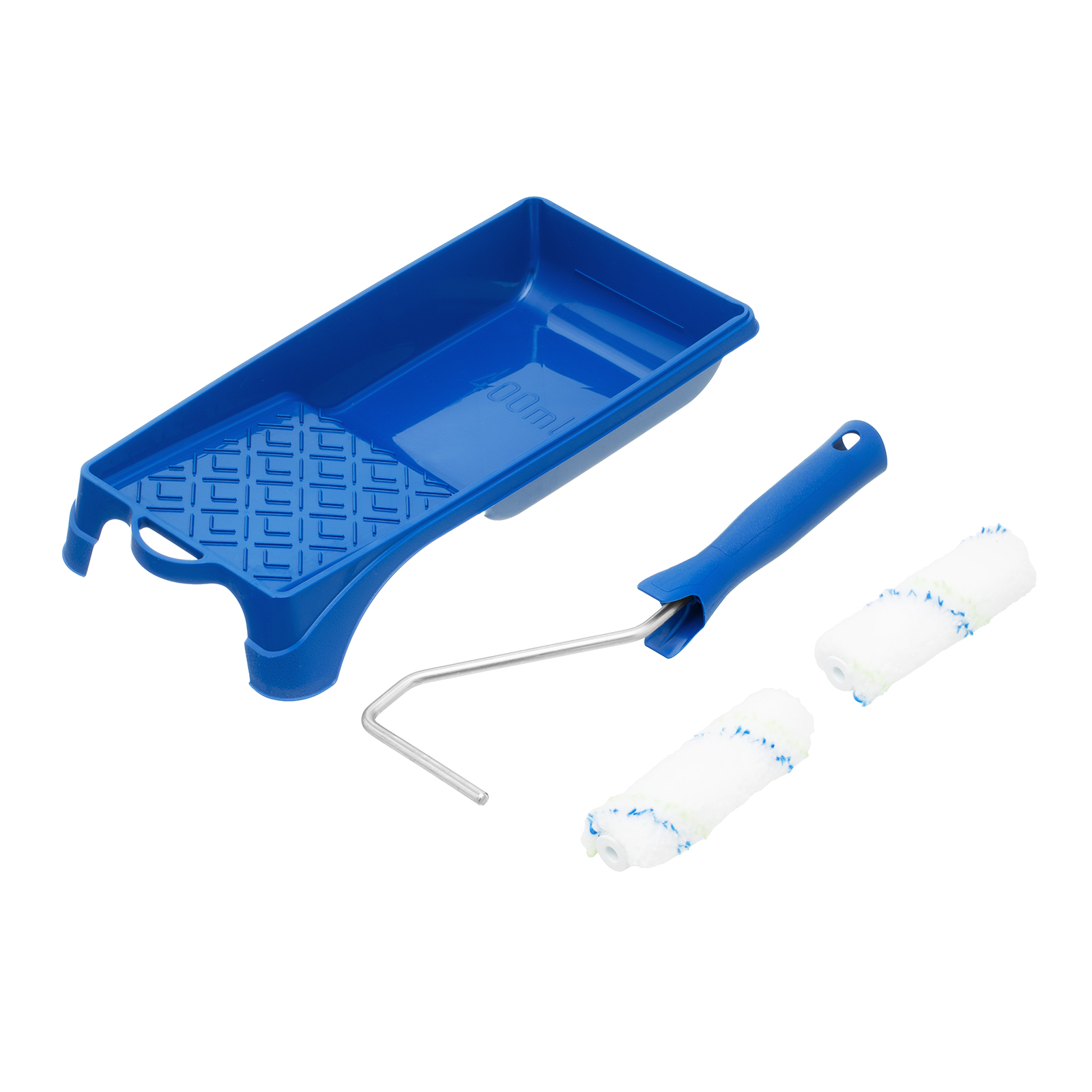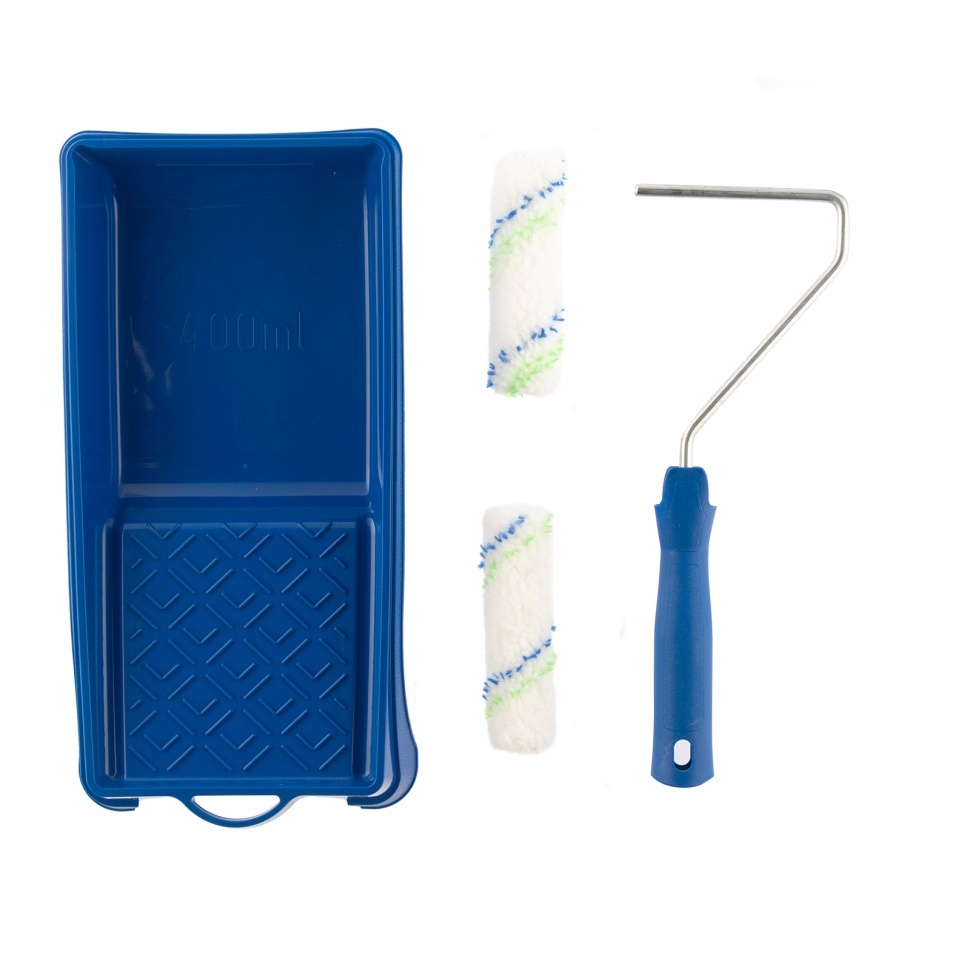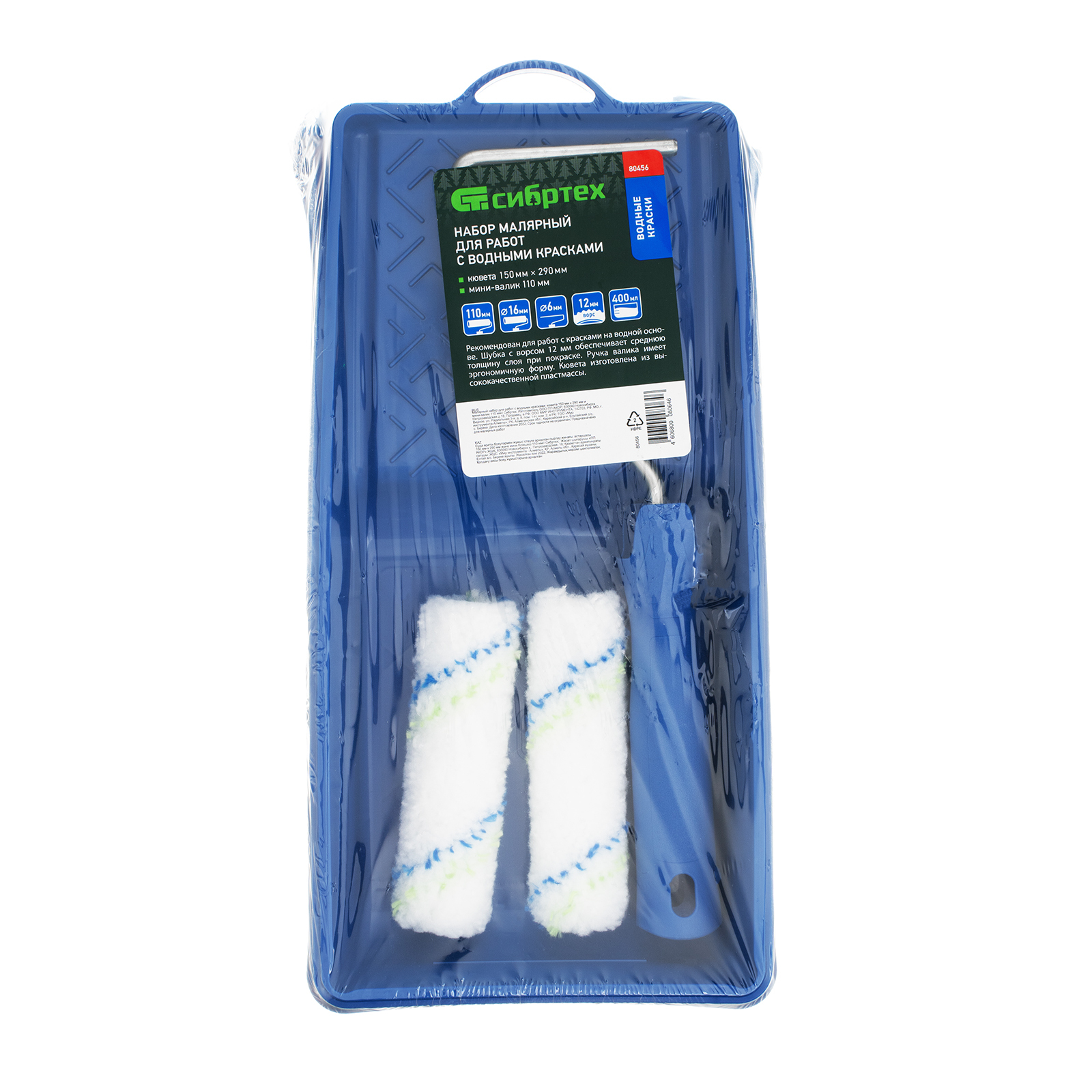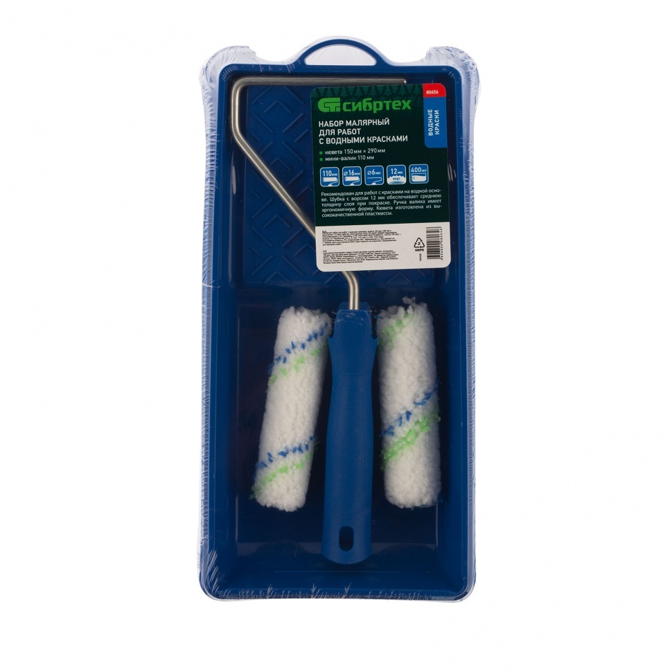 Малярный набор для работ с водными красками Сибртех 80456 включает в себя 2 сменных мини-валика шириной 110 мм, бюгель и кювету размером 150 мм х 290 мм. Используется для нанесения ЛКМ на водной основе при выполнении общемалярных работ. Универсальные валики с ворсом 12 мм подходят для поверхностей любого типа. Шубки из полиэстера не оставляют ворсинок на окрашиваемой поверхности, хорошо впитывают и отдают лакокрасочные материалы.
