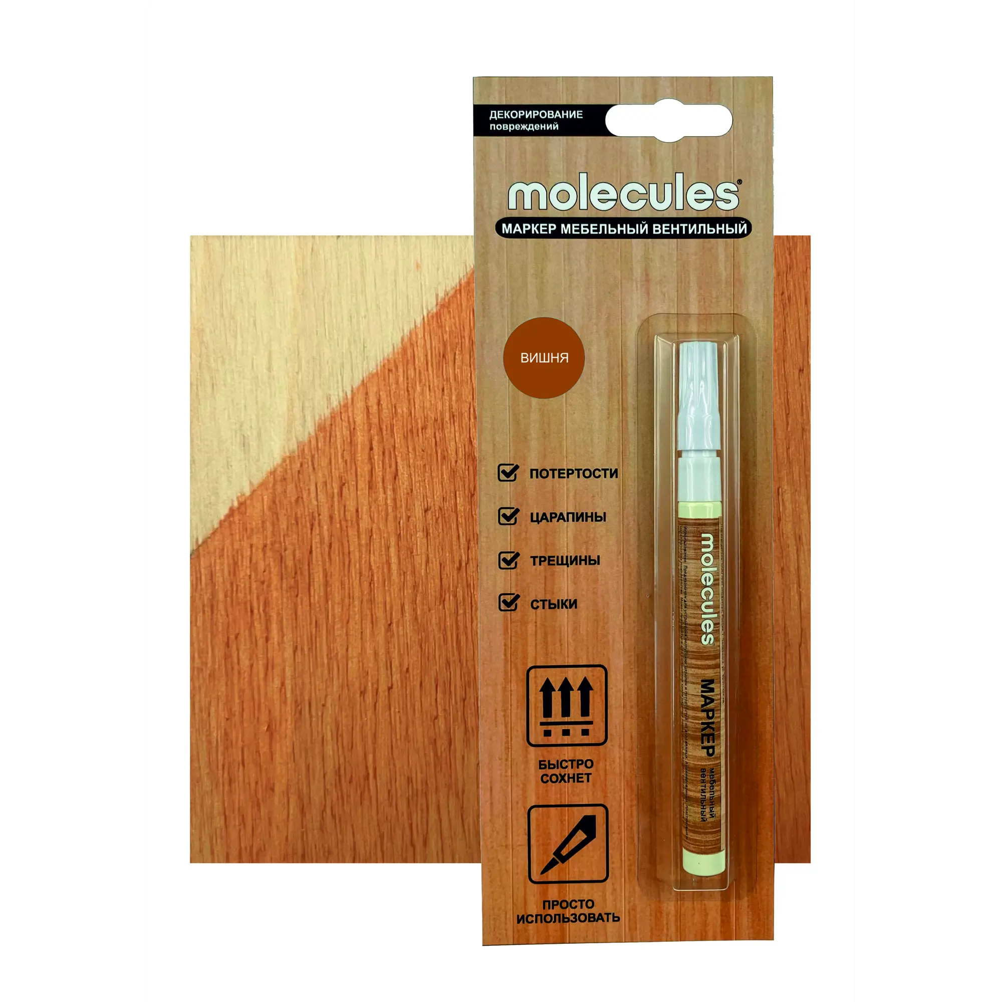 Маркер мебельный̆ вентильный применяется для ремонтных и восстановительных работ внутри помещений. Предназначен для устранения небольших сколов, царапин, потертостей на деревянных, пластиковых, металлических, ламинированных поверхностях. Область применения — двери, оконные рамы, паркет, ламинат, плинтуса, столешницы, корпусная мебель. Маркер наносится в 1-3 слоя с промежуточными паузами для сушки. Время высыхания — 1 минута.