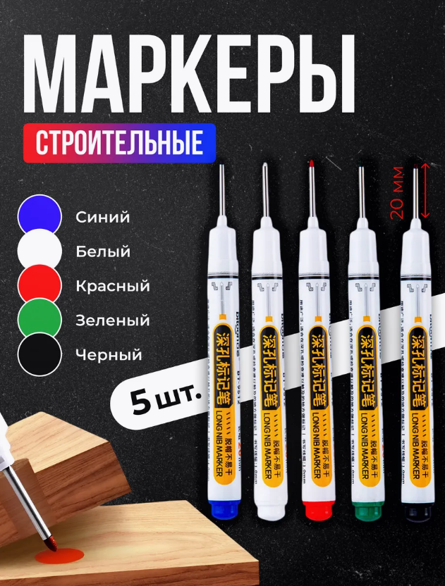 Маркер строительный тонкий разметочный с длинным наконечником. Профессиональный набор содержит пять строительных маркеров с тонким наконечником для разметки. Обеспечивает высокую точность при работе с любой поверхностью! Применим на стройплощадке или при ремонте. Чернила маркера отлично ложатся на любую поверхность: дерево, бетон, плитка, металл, камень, картон, стекло, ткань, бумага, кожа, пластик, резина, пленка. В комплект входят набор из пяти маркеров строительных, разного цвета, предназначенных для создания четких линий на различных поверхностях. С фломастером строительным и маркером для отверстий вы сможете добиться безупречной разметки даже в самых труднодоступных местах. Строительные маркеры оснащены удлиненным наконечником, обеспечивающим дополнительную точность. Маркеры спроектированы для применения в самых разных условиях – на ржавых, мокрых, шероховатых, пористых, замасленных, холодных или горячих поверхностях. Свойства чернил и долговечность корпуса обеспечивают длительное сохранение четкости линий даже в самых неблагоприятных условиях. Маркер белый по металлу гарантируют видимость на темных поверхностях. Каждый маркер имеет на корпусе разметочную линейку до 3 сантиметров, что обеспечит вам точную и ровную разметку для дальнейшей обработки без применения дополнительного инструмента. Корпус строительного маркера очень прочный и удобный для применения, хорошо лежит в руке не допуская проскальзывания. Стойкие к стиранию линии добавят эффективности и точности в вашу повседневную профессиональную деятельность, независимо от того с каким материалом вы работаете.