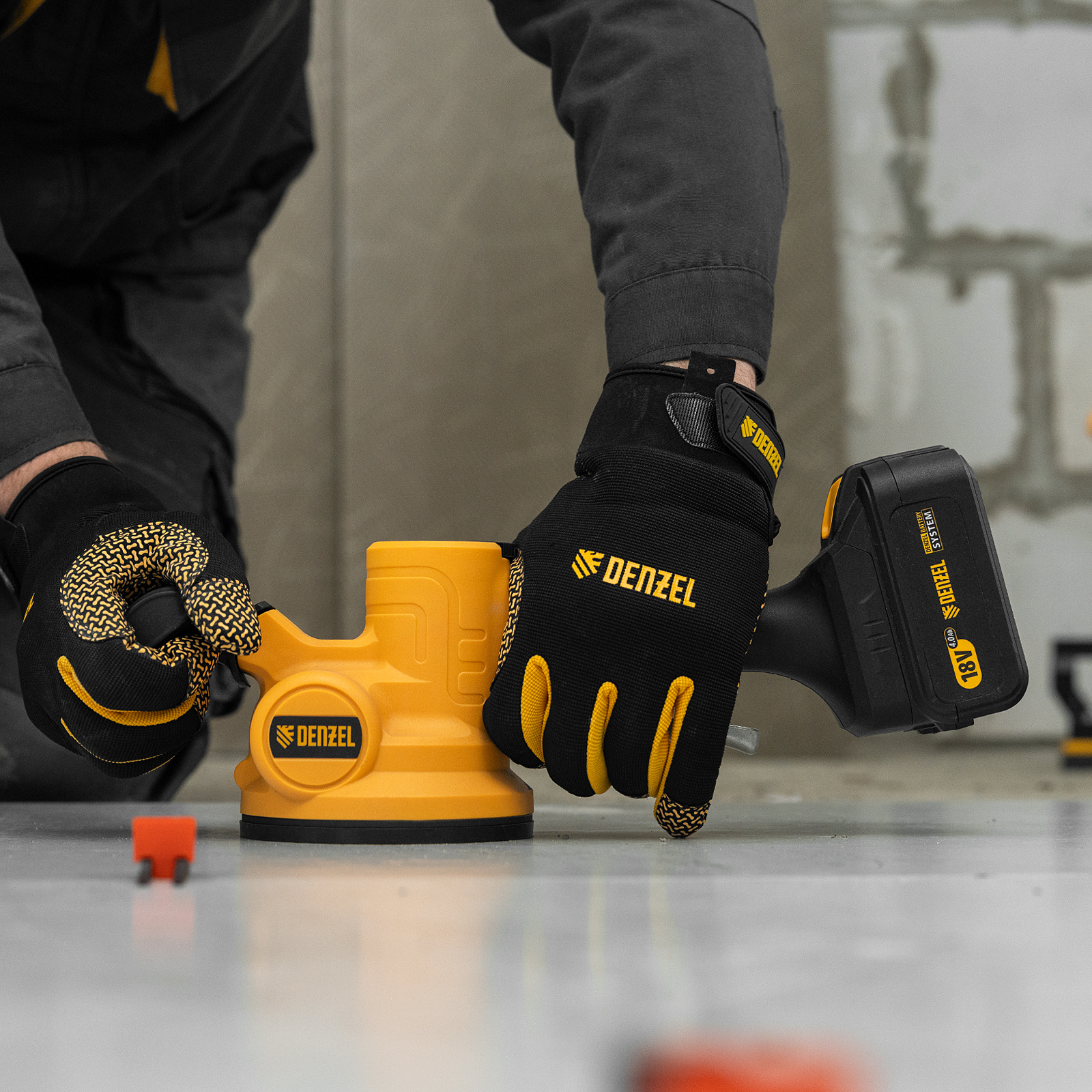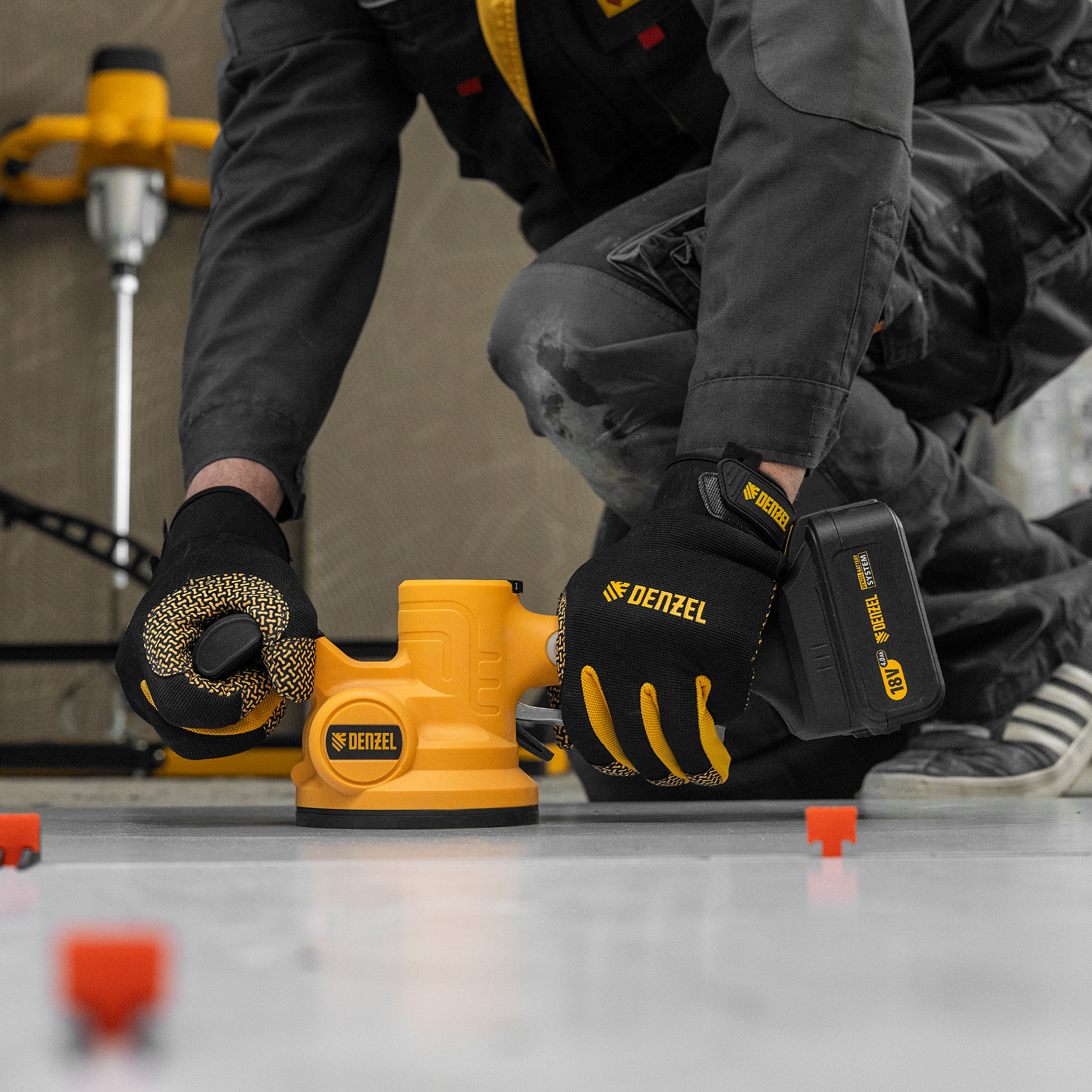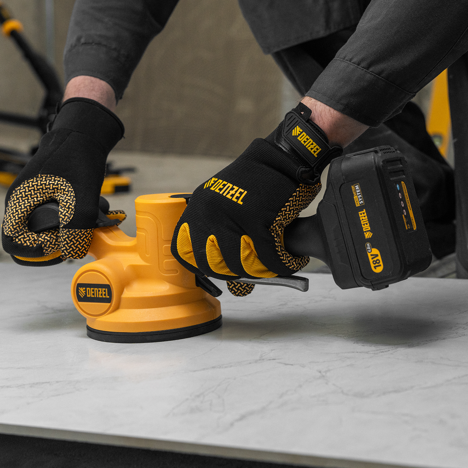 Машина для укладки плитки Denzel TTM-130-0 28481 работает от аккумуляторной батареи Li-Ion емкостью 2 А/ч, с рабочим напряжением 18 В, и используется для проведения облицовочных работ. При помощи присоски диаметром 130 мм оказывает вибрационное воздействие на поверхность плитки со скоростью 500-12000 об/мин, что способствует равномерному распределению клея, а также препятствует образованию воздушных пузырьков и полостей под плиткой, позволяя избежать ее перекоса и повреждения.,Машина поставляется без АКБ и зарядного устройства, на нее можно установить универсальный аккумулятор, совместимый с любым инструментом единой платформы Denzel battery system 18V серии IB.