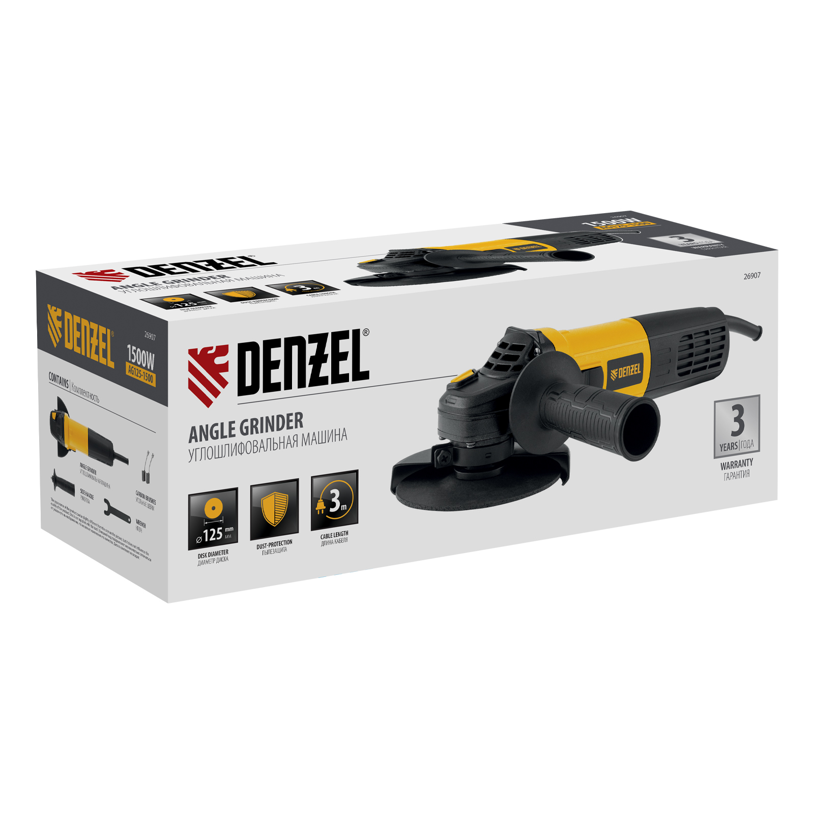 Угловая шлифовальная машина Denzel AG125-1500 26907 мощностью 1500 Вт совместима с оснасткой диаметром 125 мм, система электронной регулировки позволяет устанавливать оптимальную частоту вращения шпинделя в диапазоне 3000-11000 об/мин. Инструмент используется для резки и шлифовки различных материалов, а также при выполнении зачистных работ.