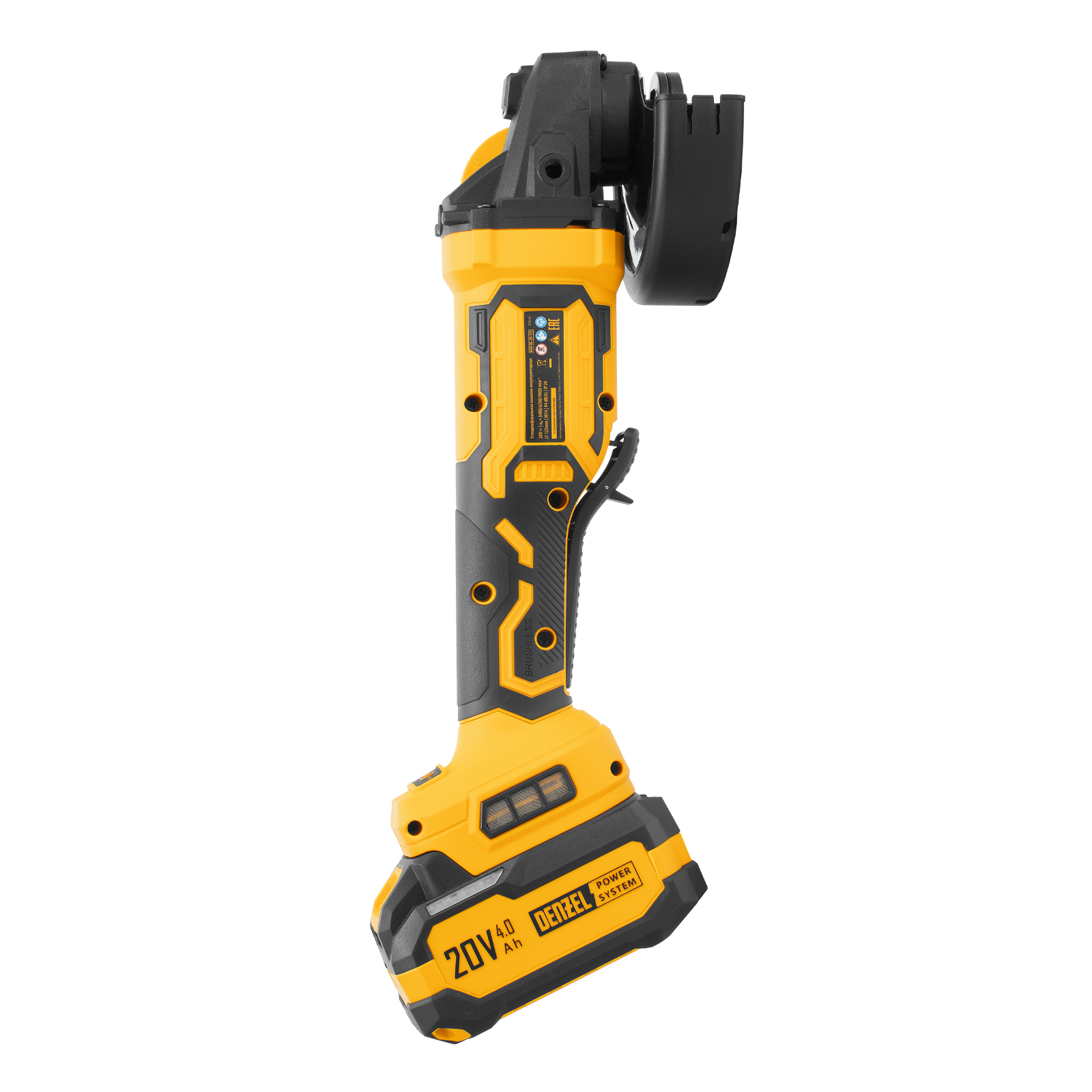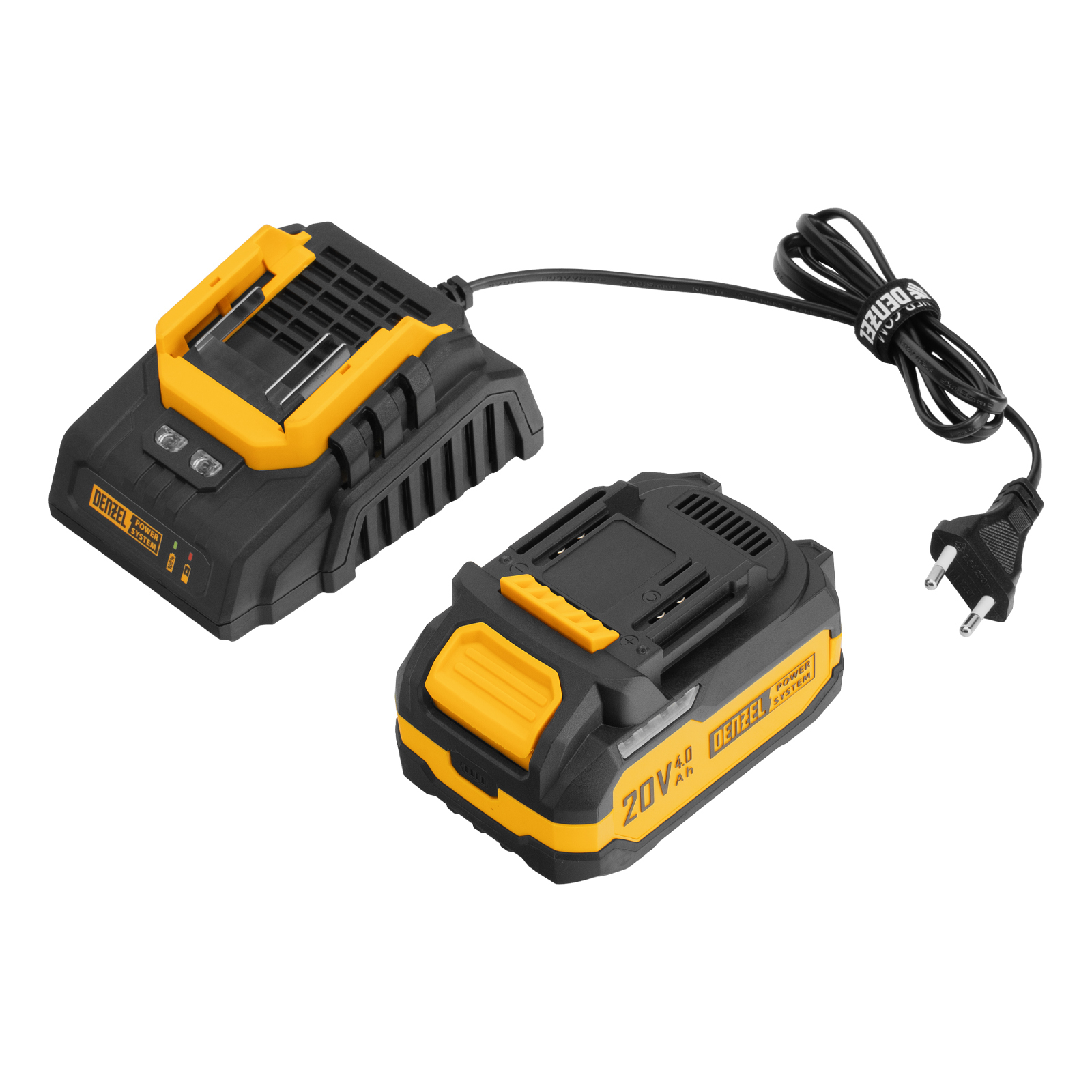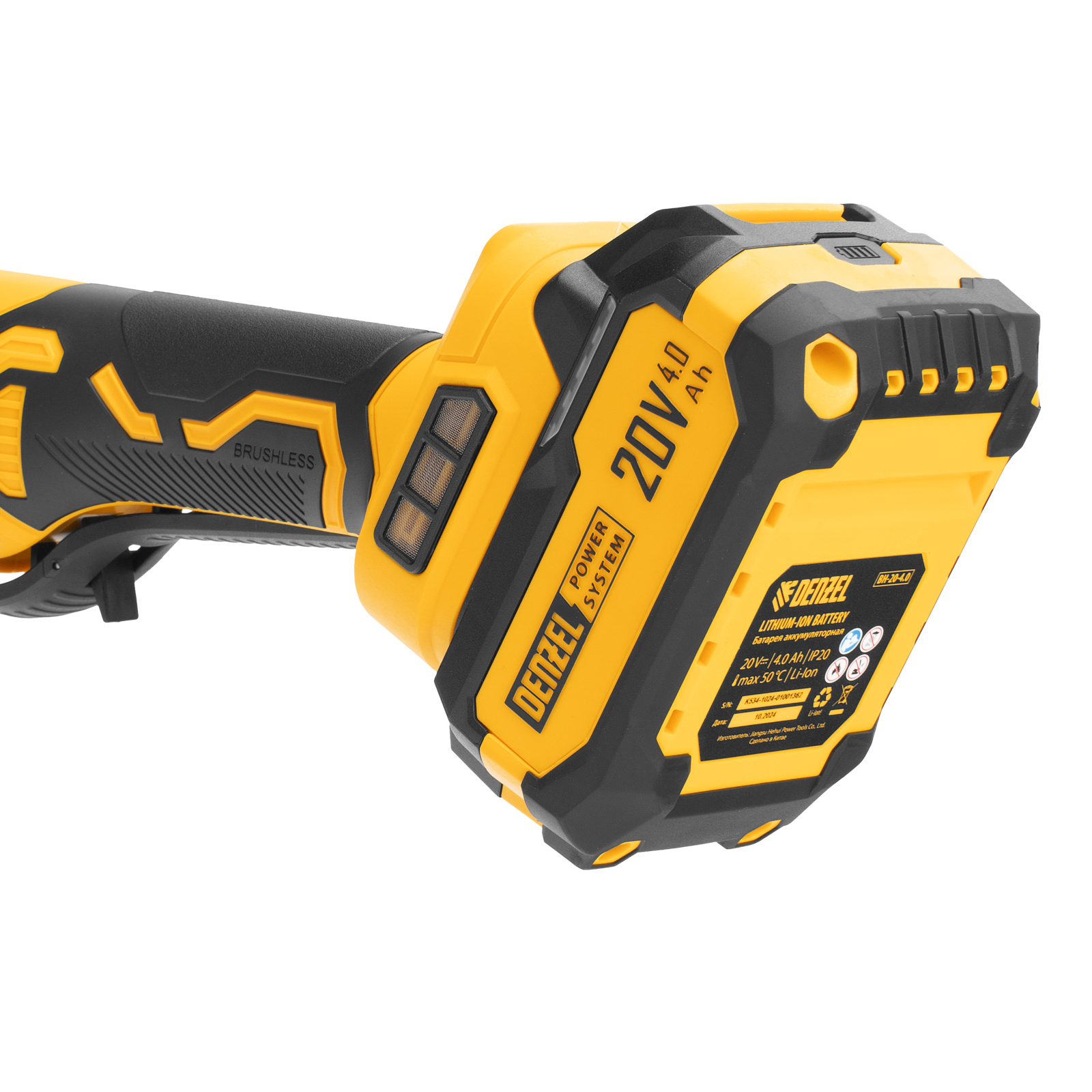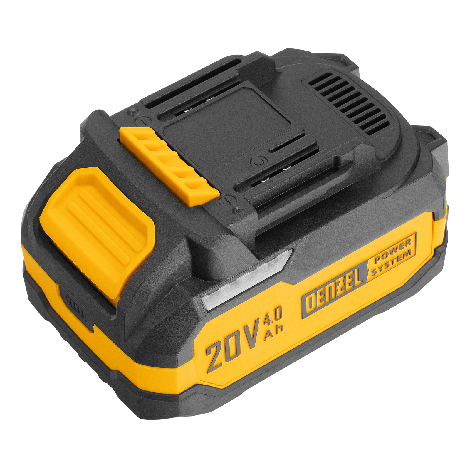 - Универсальность — аккумулятор Li-Ion емкостью 4 А·ч совместим со всеми инструментами единой платформы Denzel Power System 20V.