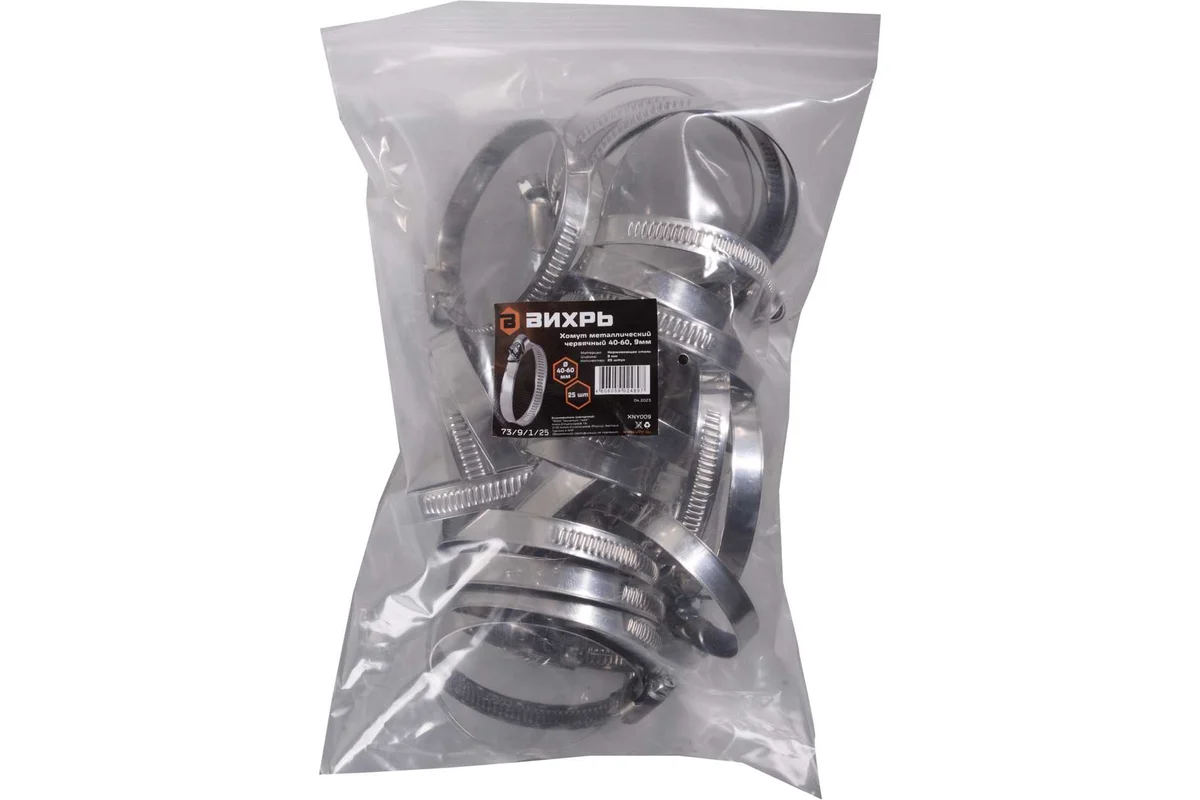 Хомут червячный (по другому: хомут металлический, хомут винтовой, хомут зажимной, хомут ленточный червячного типа) Вихрь 40-60 (1шт) — соединительный элемент, применяемый для крепления и герметизации соединения шлангов, патрубков и других жёстких и гибких трубопроводов диаметром до 60 мм.