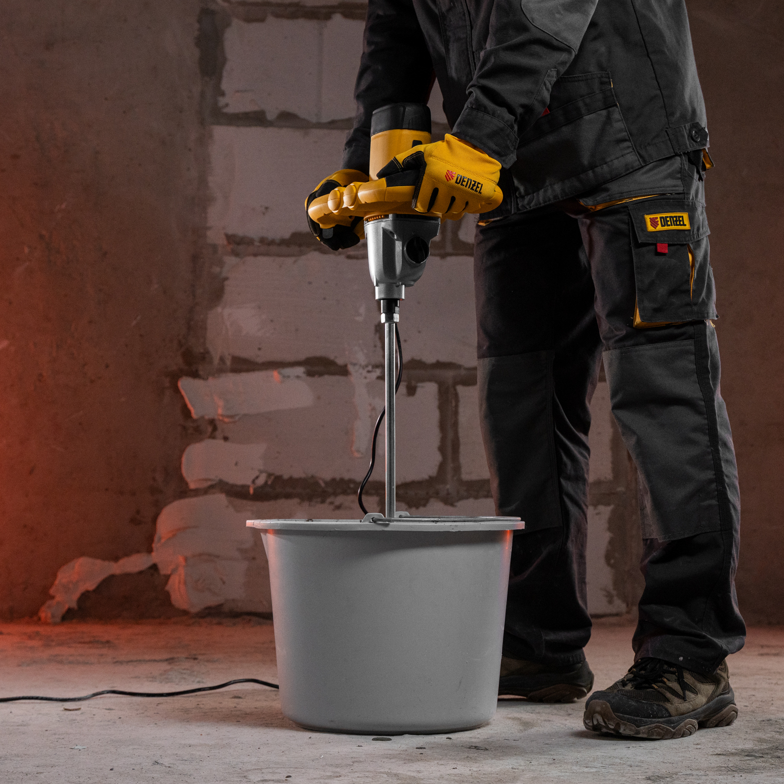 Миксер строительный Denzel EM-1-1220 27903 мощностью 1220 Вт предназначен для смешивания различных смесей, растворов, лакокрасочных материалов на скорости 0-480/0-800 об/мин при проведении строительных и ремонтных работ. Эффективно работает с мелким щебнем и крупнодисперсными смесями, а высокий крутящий момент 107 Н⋅м позволяет смешивать даже вязкие растворы. Миксер предназначен для бытового применения.