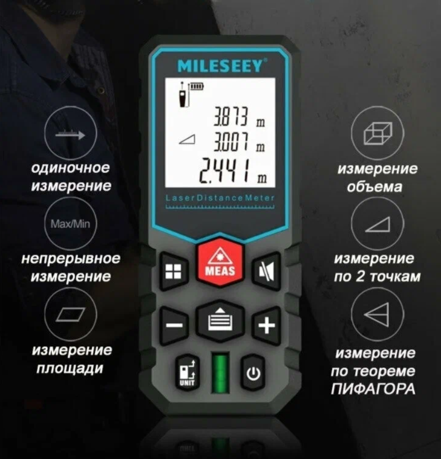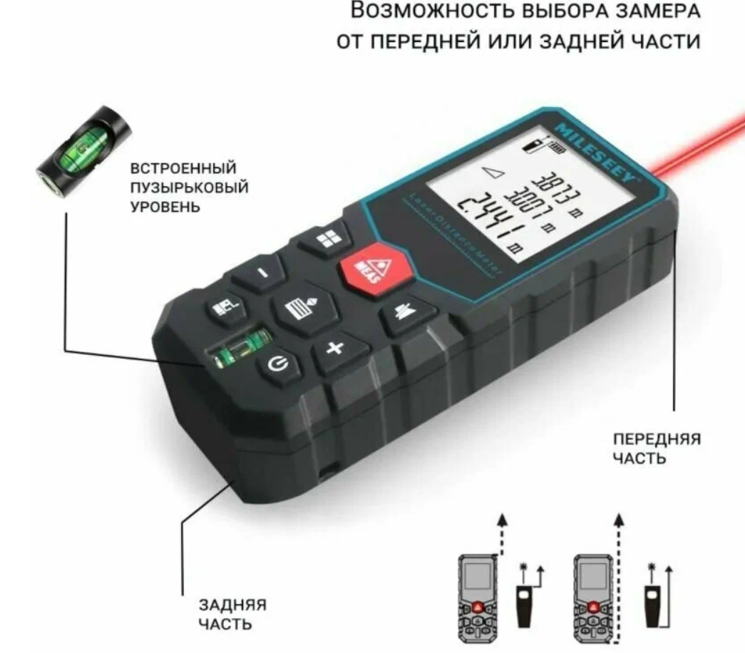 автоматическое отключение, звуковая индикация, подсветка дисплея, ударопрочный корпус, функция Пифагора, функция непрерывного измерения, функция расчета объема, функция расчета площади, функция сложения/вычитания