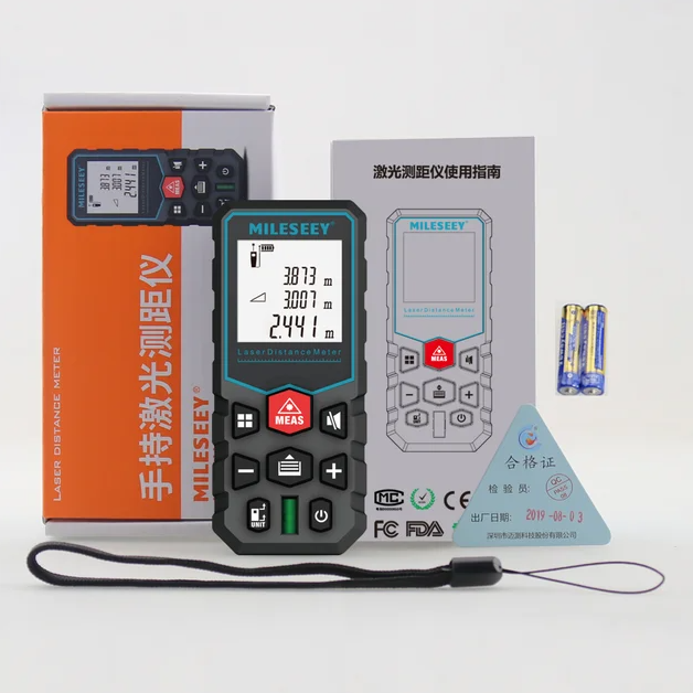 В комплекте с лазерным дальномером MILESEEY X5 идут 2 батарейки типа ААА, ремешок на руку и инструкция.