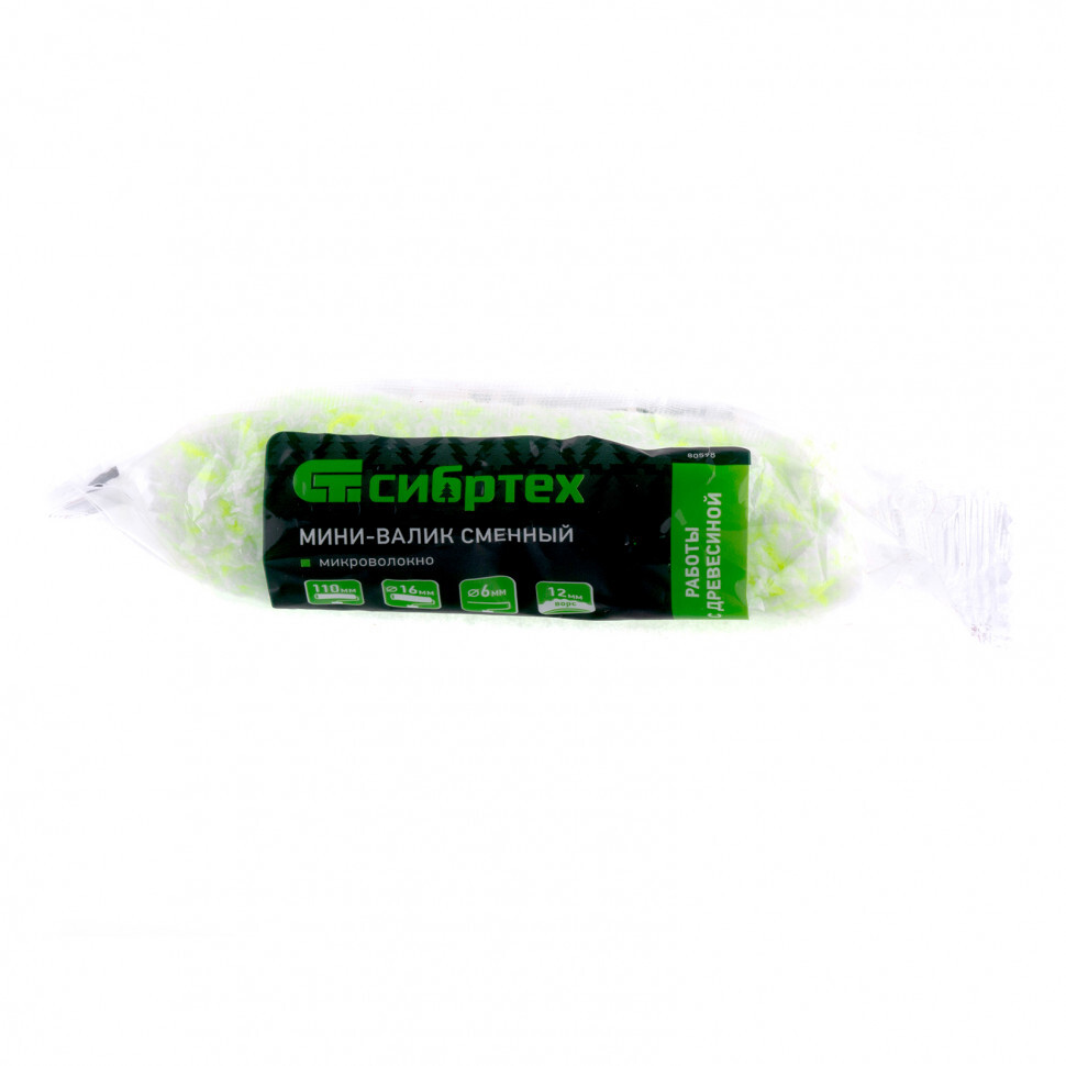 Сменный валик Сибртех «Работы с древесиной» 80598 шириной 110 мм, с ворсом 12 мм из микроволокна, диаметром 16 мм, подходит под ручку 6 мм. Он равномерно наносит на деревянный поверхности жидкие ЛКМ: антисептики, грунтовки, пропитки, защитные составы, лазурь и другие невязкие материалы. За счет ширины 110 мм валик оптимален для окрашивания труднодоступных участков.