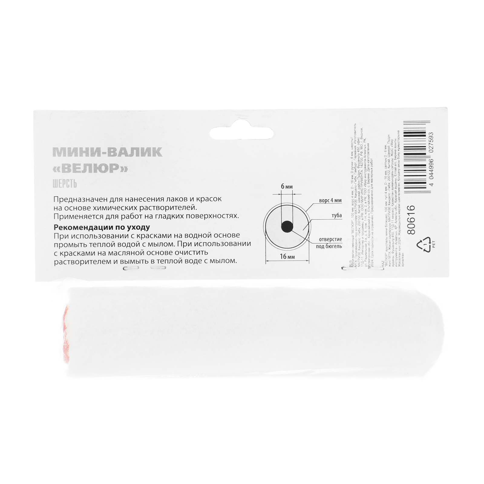 Сменный мини-валик MTX «ВЕЛЮР» 80616 шириной 100 мм, с ворсом из шерсти 4 мм, диаметром 16 мм, подходит для бюгелей диаметром 6 мм. Рекомендован для лакировочных работ на гладких поверхностях. Небольшая ширина позволяет использовать валик для обработки труднодоступных участков. Шубка валика сделана из велюра, волокна которого распределяют лакокрасочный материал без разбрызгивания и образования подтёков.