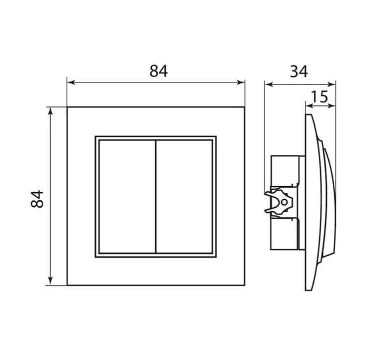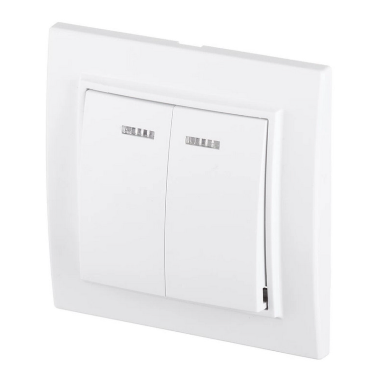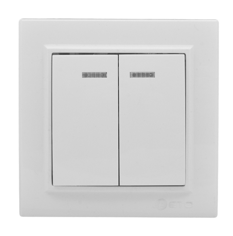 Предназначен для скрытой установки. Выключатель двухклавишный с индикацией. Корпус выполнен из ABS-пластика, обеспечивающего прочность и термостойкость изделий, устойчивость к воздействию солнечных лучей. Основание выключателя выполнено из негорючего пластика.
