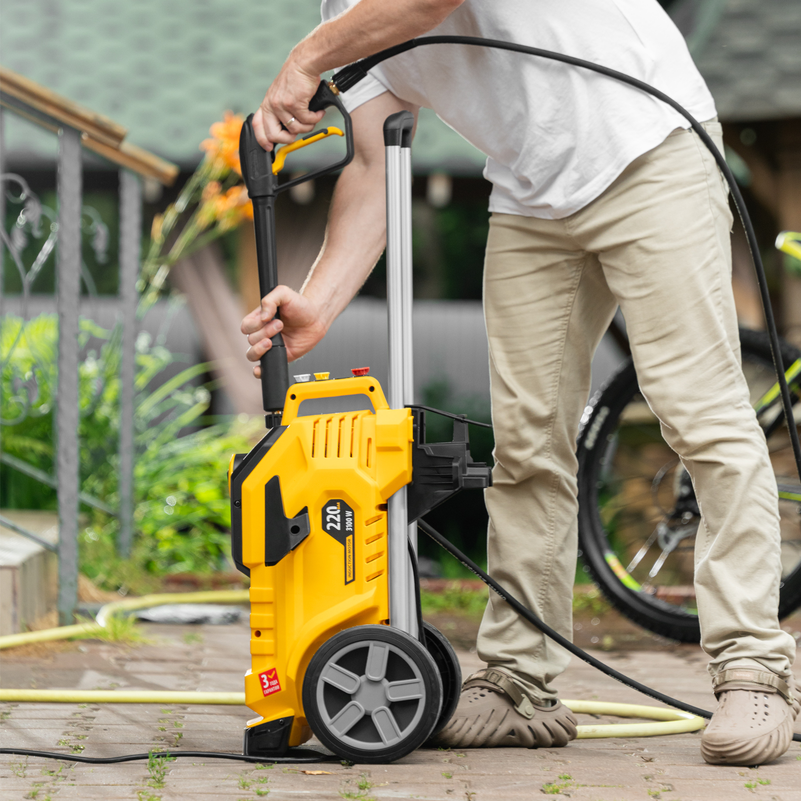 - Свободное перемещение по участку — длина шланга высокого давления составляет 8 м, длина кабеля — 5 м.