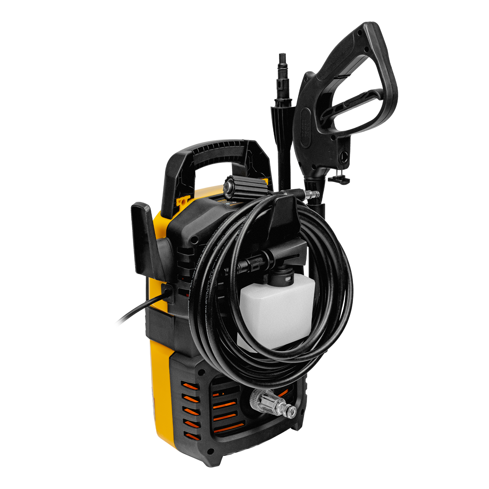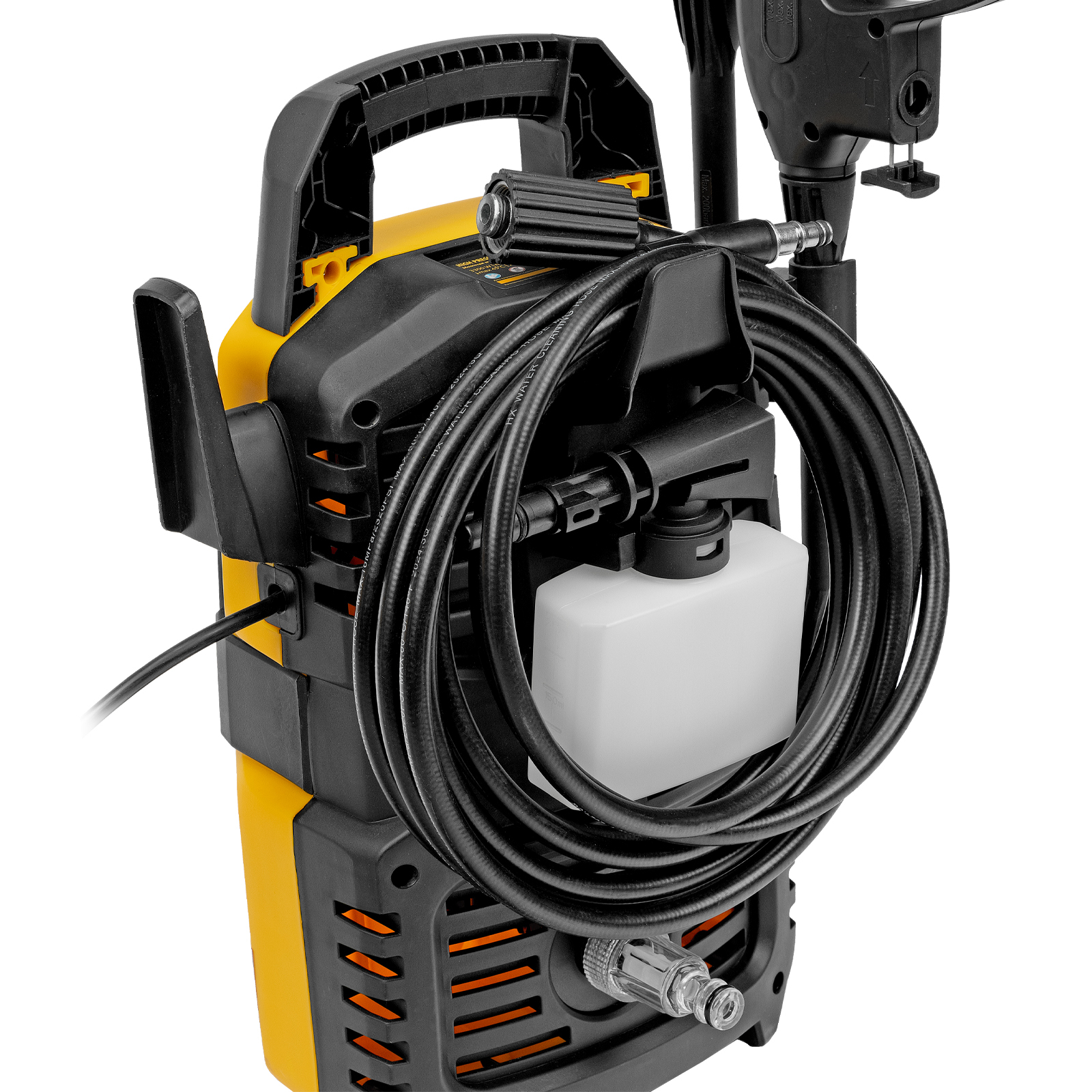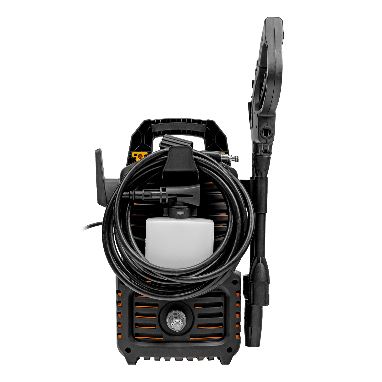 - Продуманная конструкция — кронштейны для шнура питания и шланга высокого давления, а также держатель для пистолета обеспечивают удобство хранения.