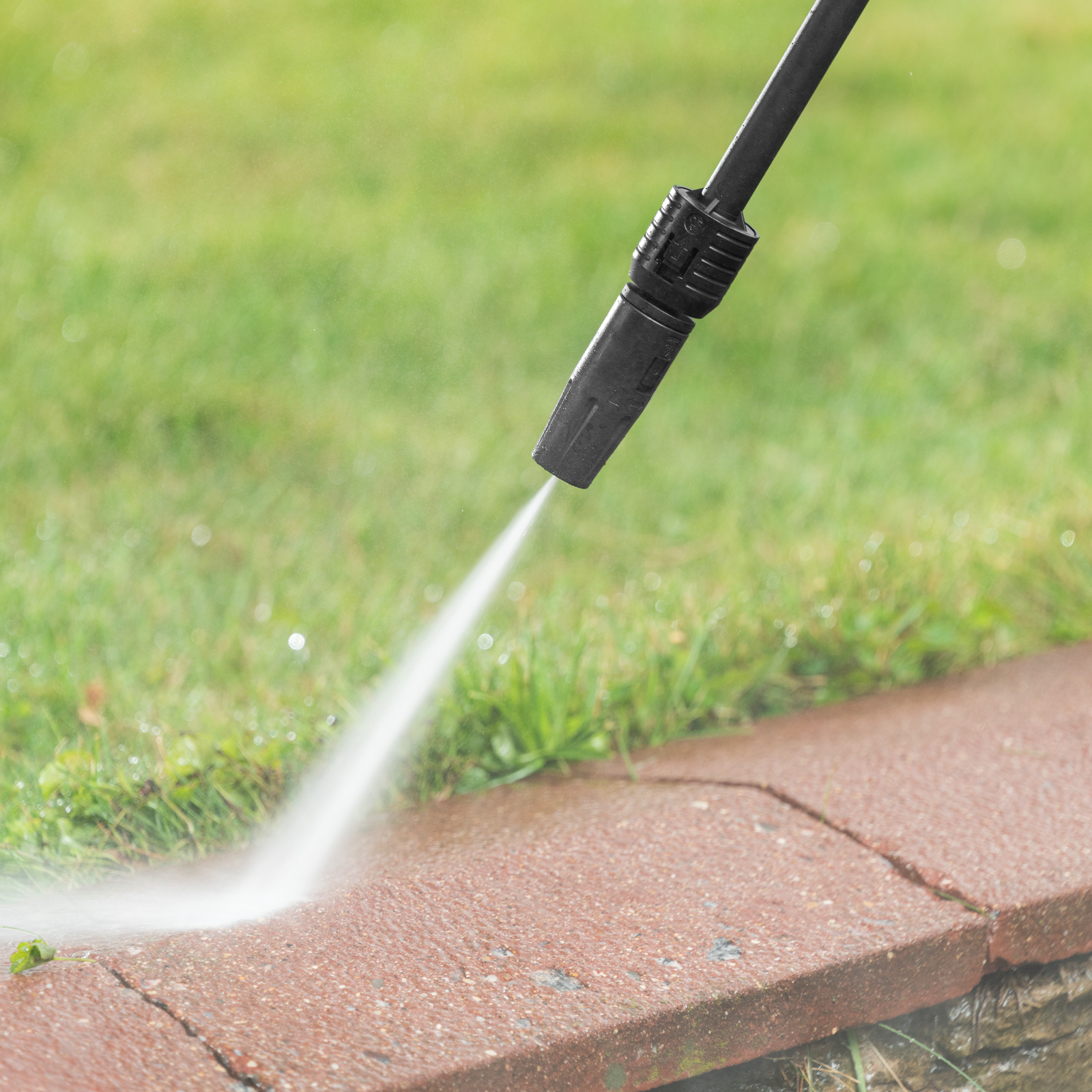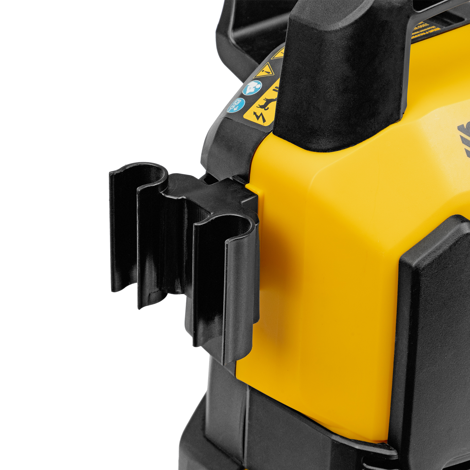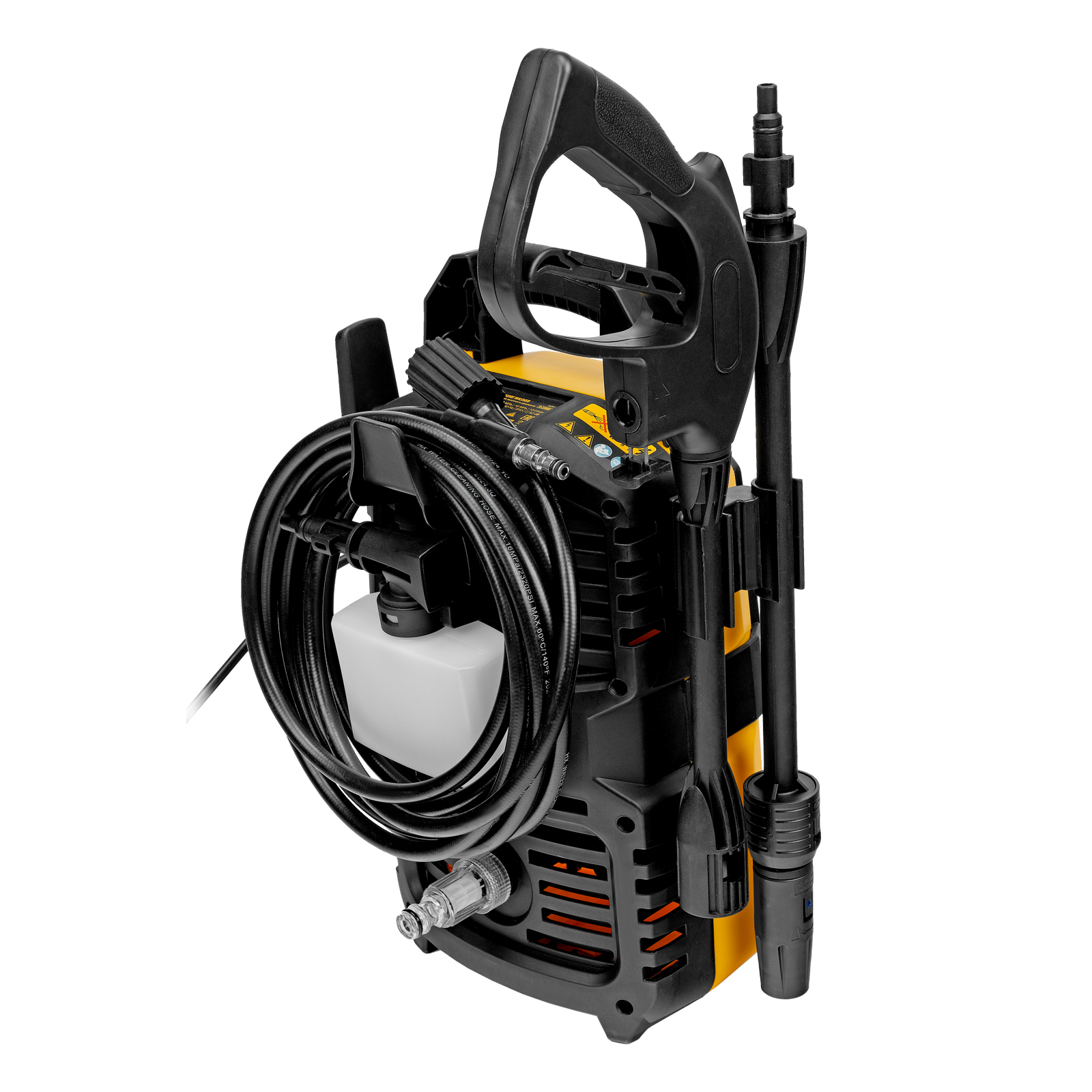 - Продуманная конструкция — кронштейны для шнура питания и шланга высокого давления, а также держатель для пистолета обеспечивают удобство хранения.