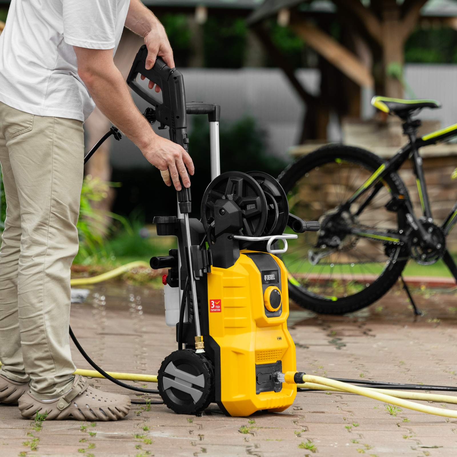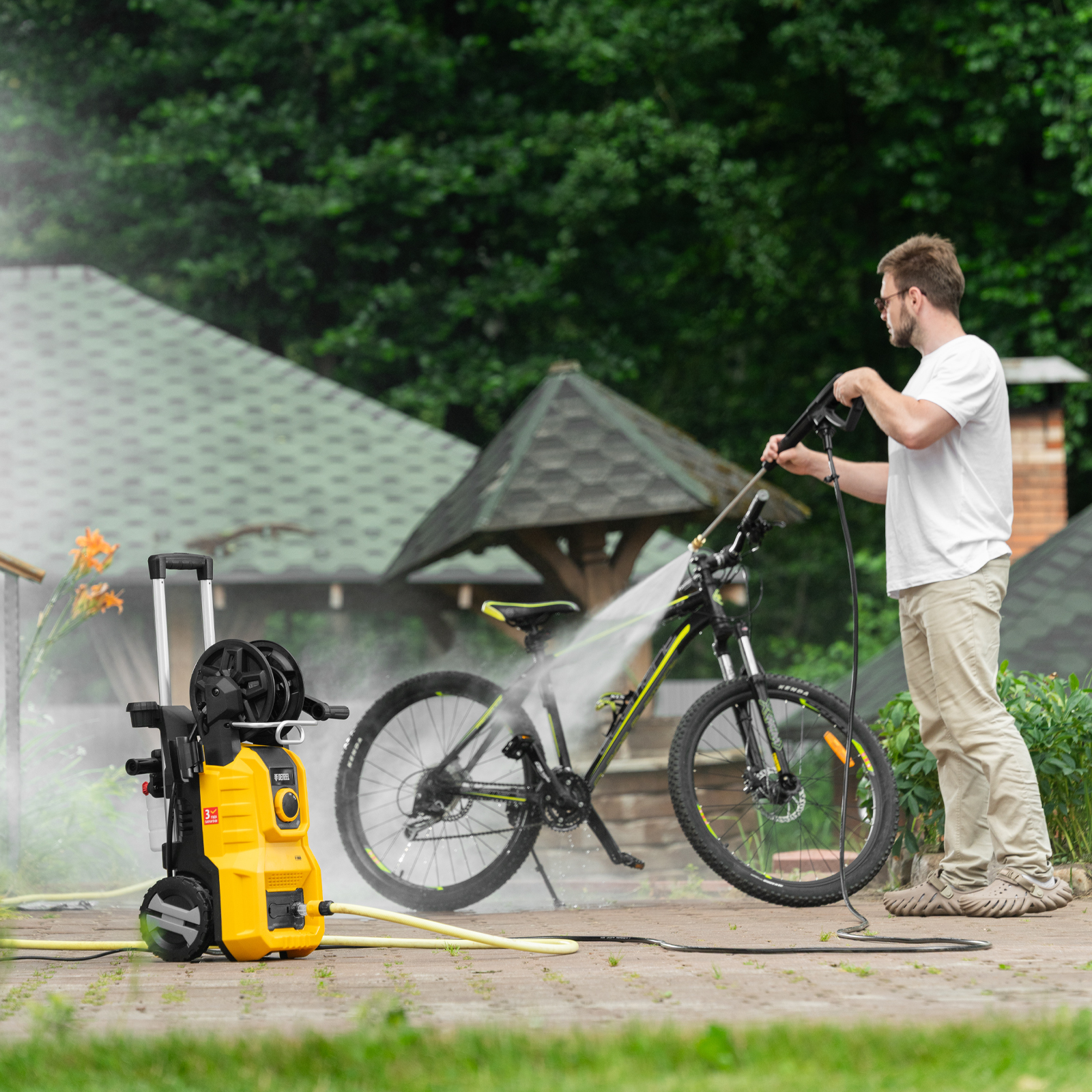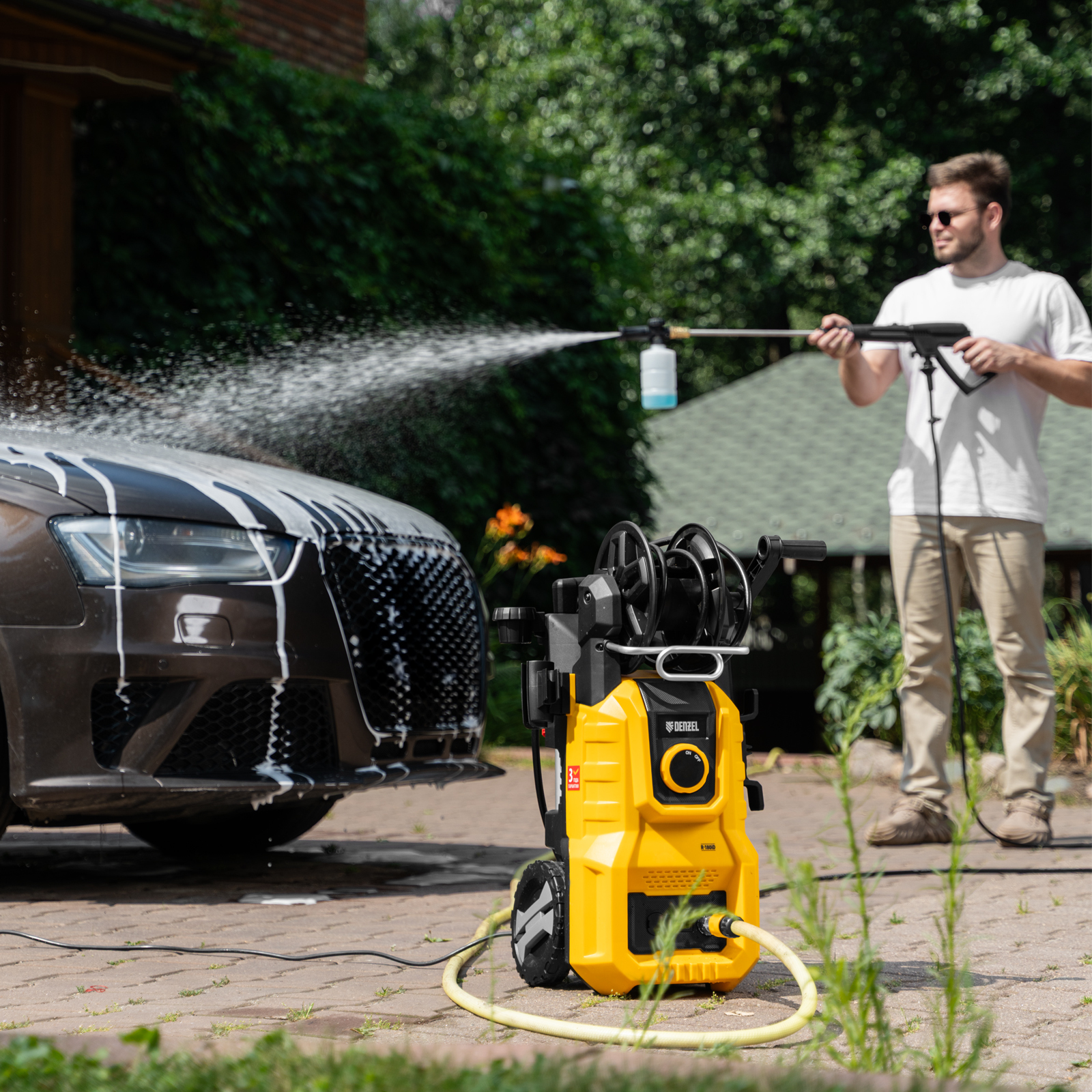 - Максимально комфортное передвижение — длина шнура питания составляет 5 м, длина шланга высокого давления увеличена до 8 м.