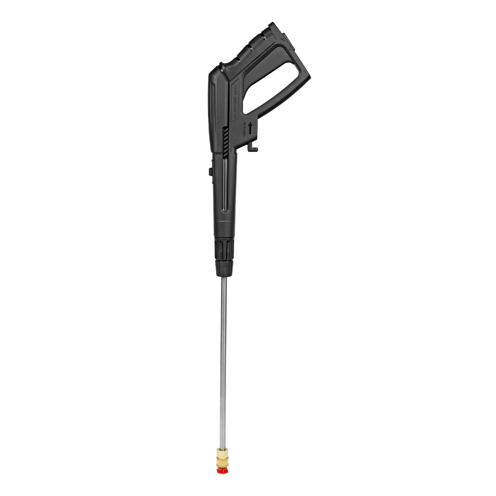 - Защита от случайного пуска — перед началом работы необходимо разблокировать рычаг моечного пистолета.