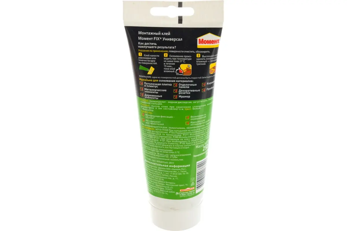 Монтажный клей Момент FIX Универсал туба 250 г Б0034943 используется для приклеивания стеновых панелей из дерева, ПВХ, изоляционных панелей, профилей, плинтусов и декоративных фризов, а также для установки подоконников, дверных рам. Изделие предназначается для внутреннего применения.