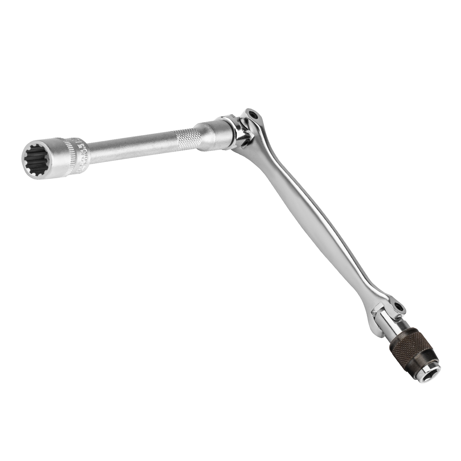- Работа в труднодоступных местах — ключ с карданным шарниром позволяет выполнять монтаж/демонтаж метизов под любым углом, а удлинитель облегчает доступ к глубоко расположенным соединениям.
