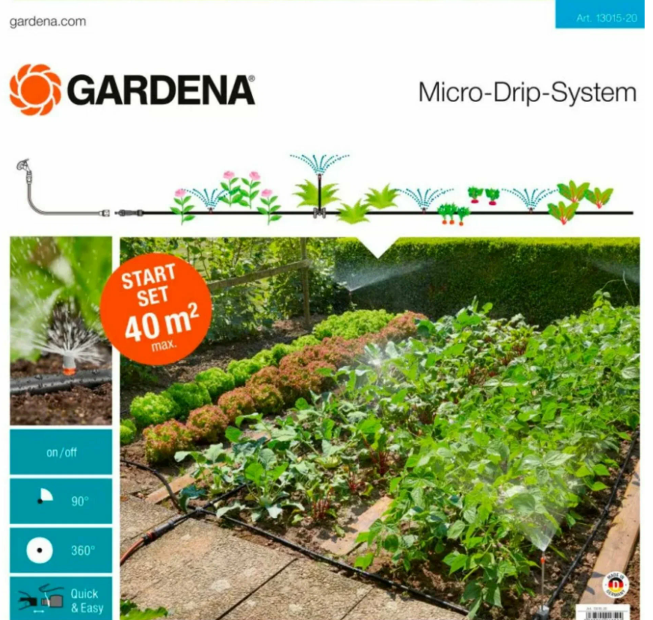 - Комплектация: - 1 мастер-блок Gardena 1000, 25 м магистрального шланга, 4 микронасадки 90°, 1 микронасадка 360°, 2 L-образных соединителя 13 мм (1/2"), 1 крестовина 13 мм (1/2"), 5 направляющих 13 мм (1/2"), 5 надставок для микронасадок, 5 кранов запорных, 3 заглушки 13 мм (1/2"), 10 колышков для шланга 13 мм (1/2"), 1 Инструмент для сборки.